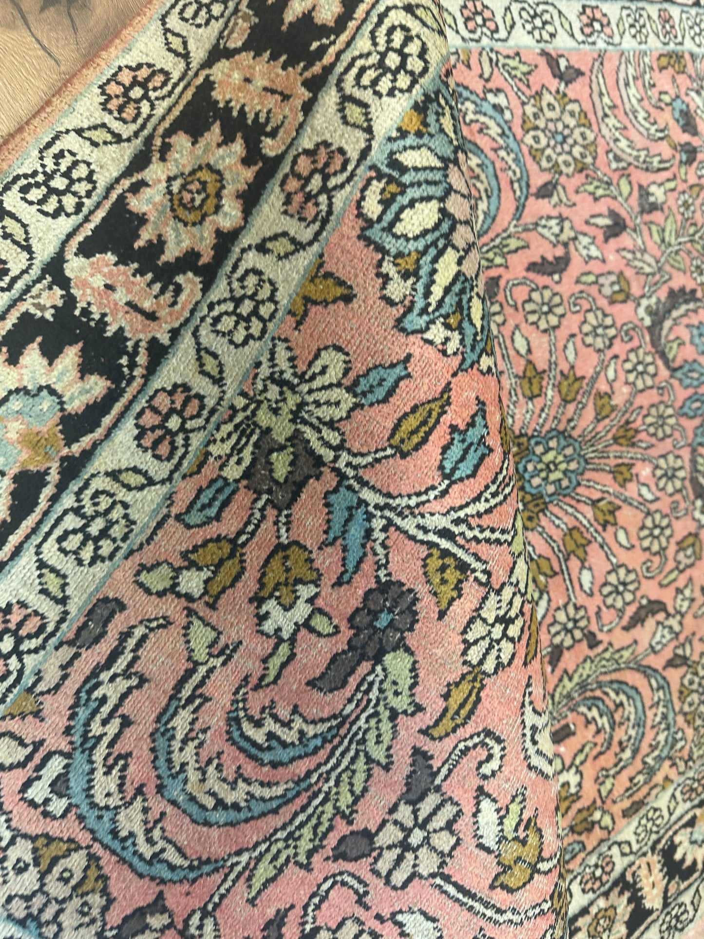 Obwohl dieser Teppich gebraucht ist, wurde er gründlich gereinigt, um seine ursprüngliche Pracht zu bewahren. Ein Kaschmir Ghom Seidenteppich verleiht jedem Raum nicht nur Eleganz, sondern auch eine Erzählung von Geschichte und Kultur.