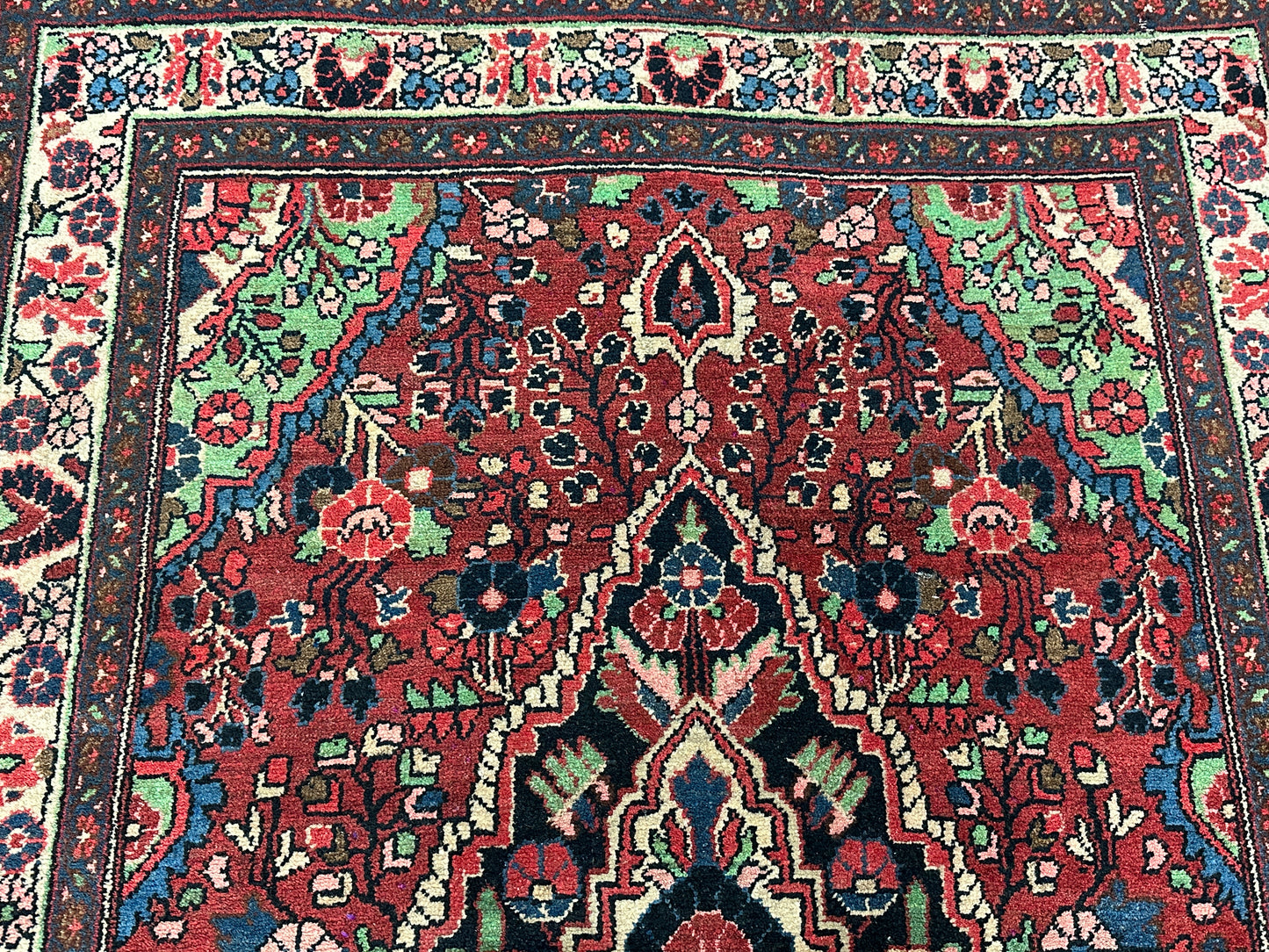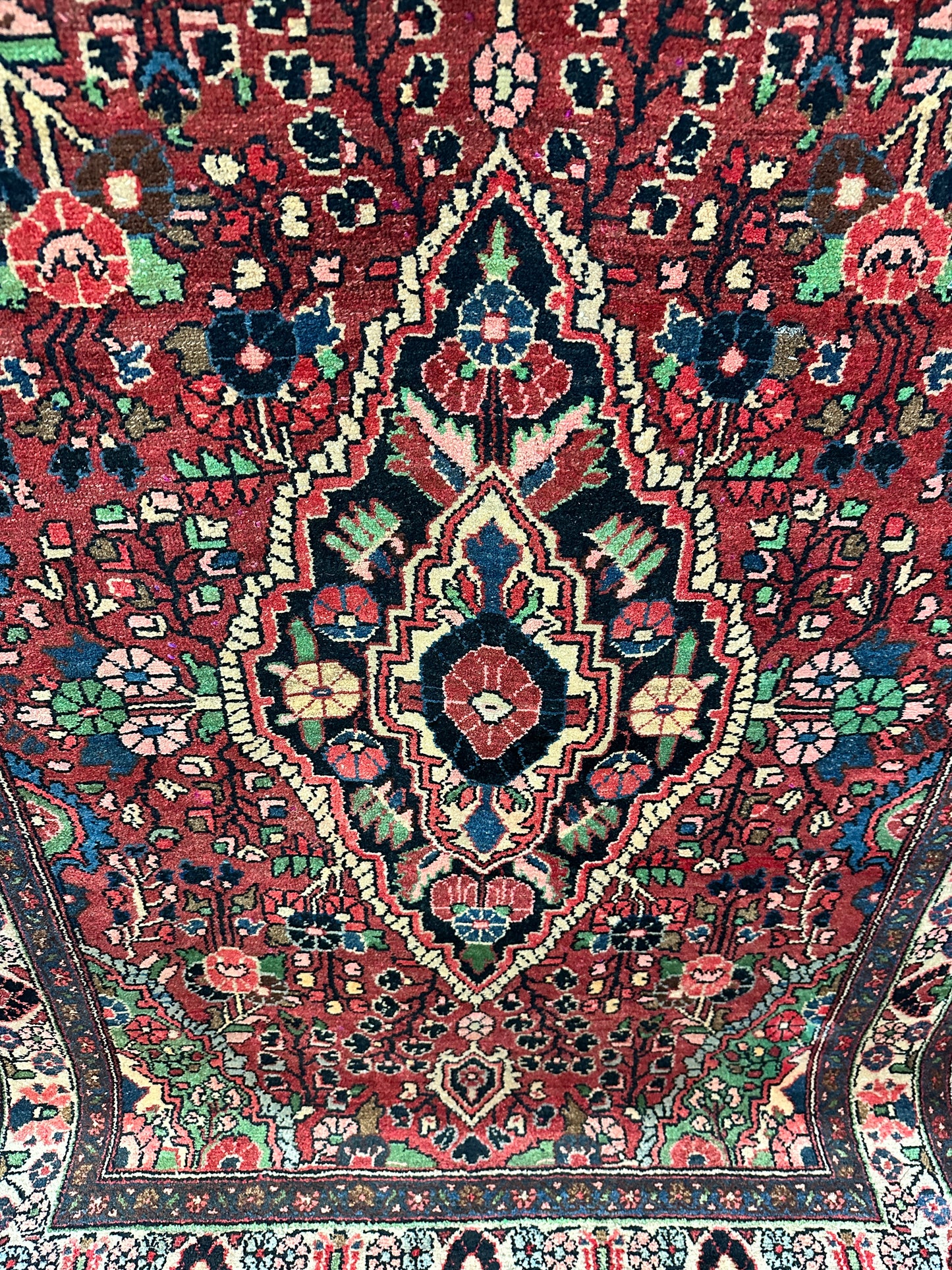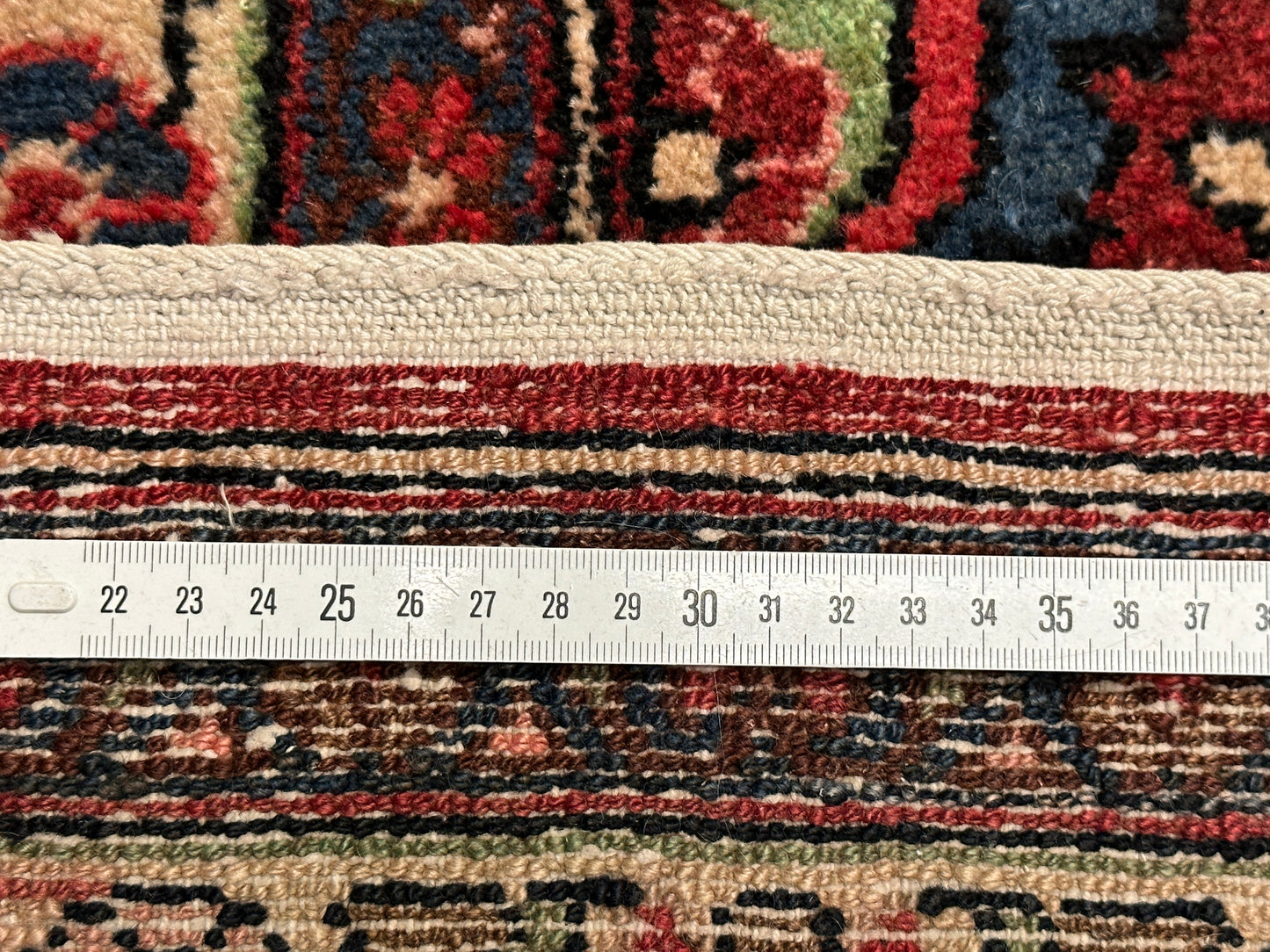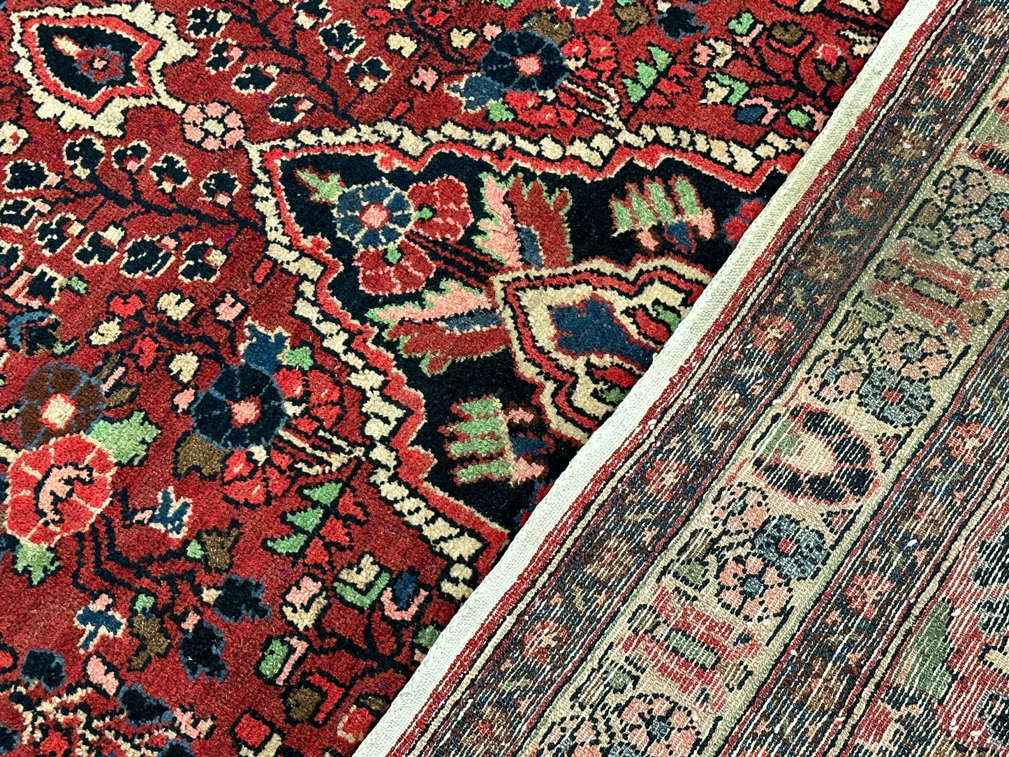 • Antiker Hamadan-Stil: Dieser Teppich präsentiert sich im Stil eines antiken Hamadan-Designs, das für seine einzigartigen Muster und warmen Farben bekannt ist.