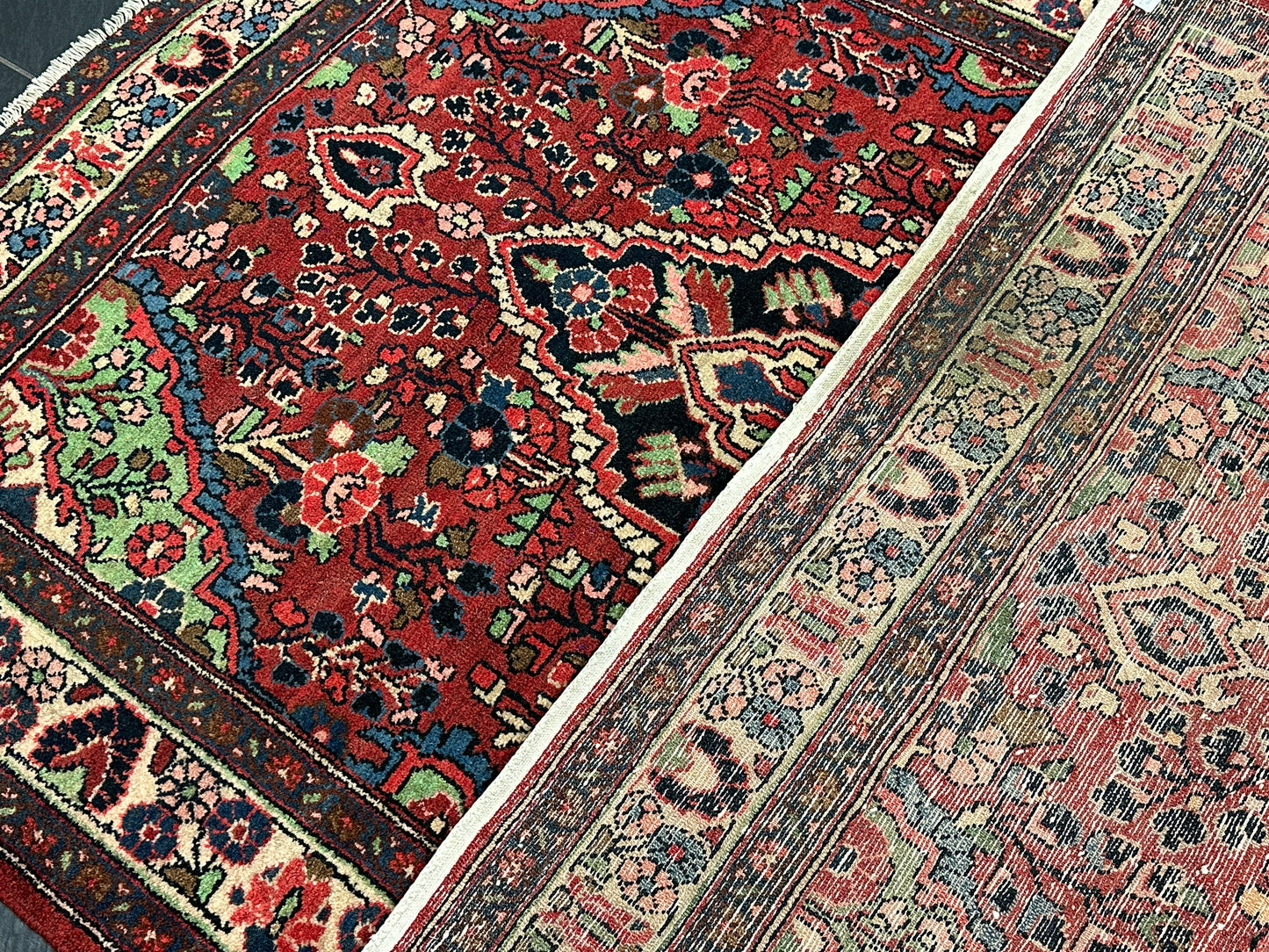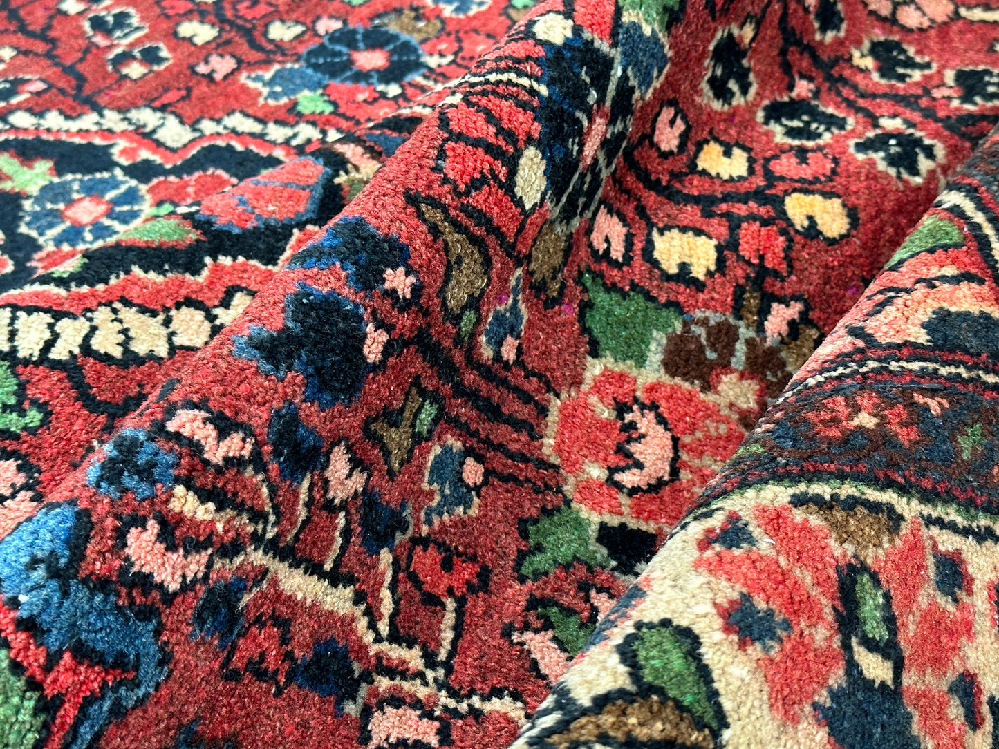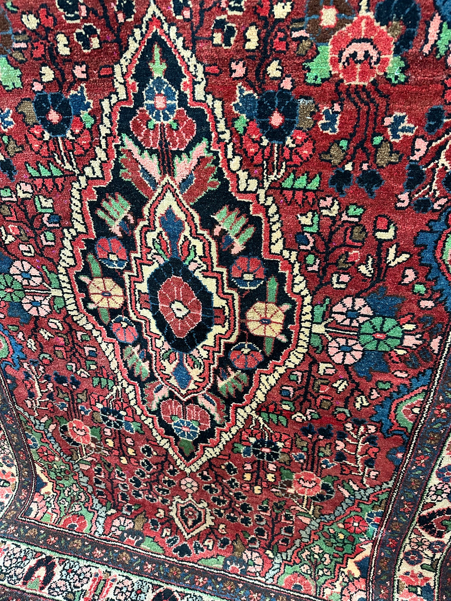 • Antiker Hamadan-Stil: Dieser Teppich präsentiert sich im Stil eines antiken Hamadan-Designs, das für seine einzigartigen Muster und warmen Farben bekannt ist.