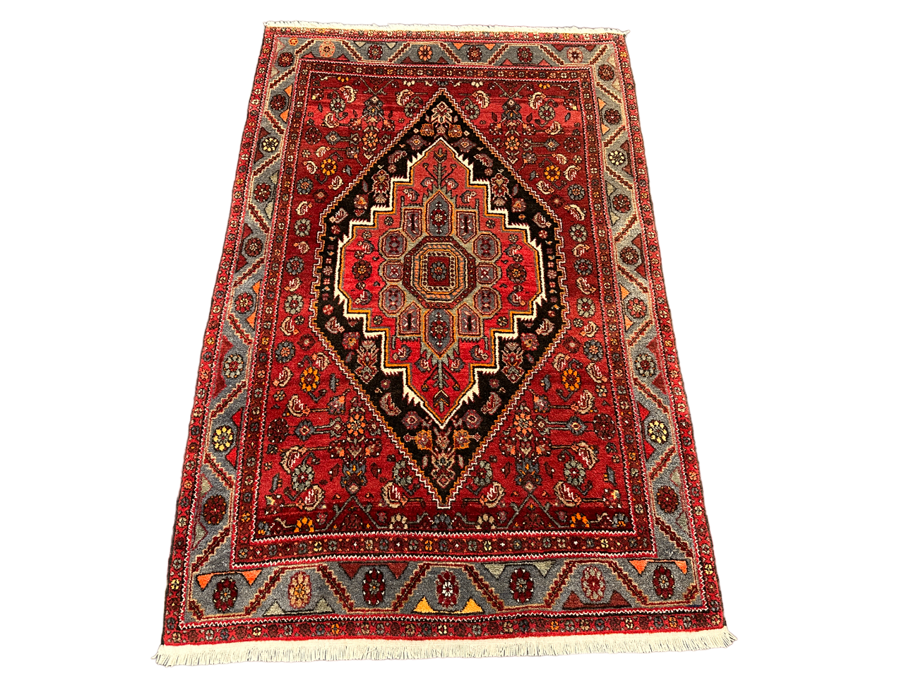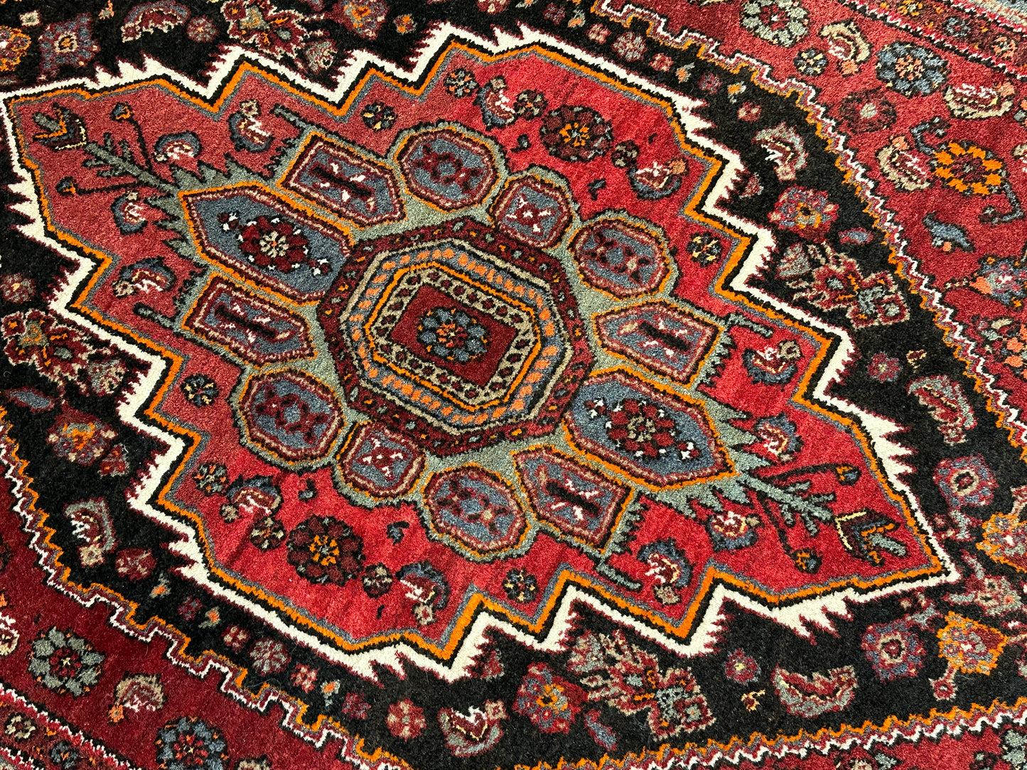 • Zustand: Trotz seines gebrauchten Zustands befindet sich dieser Teppich in gutem Zustand und wurde professionell gereinigt, um seine Schönheit zu erhalten.