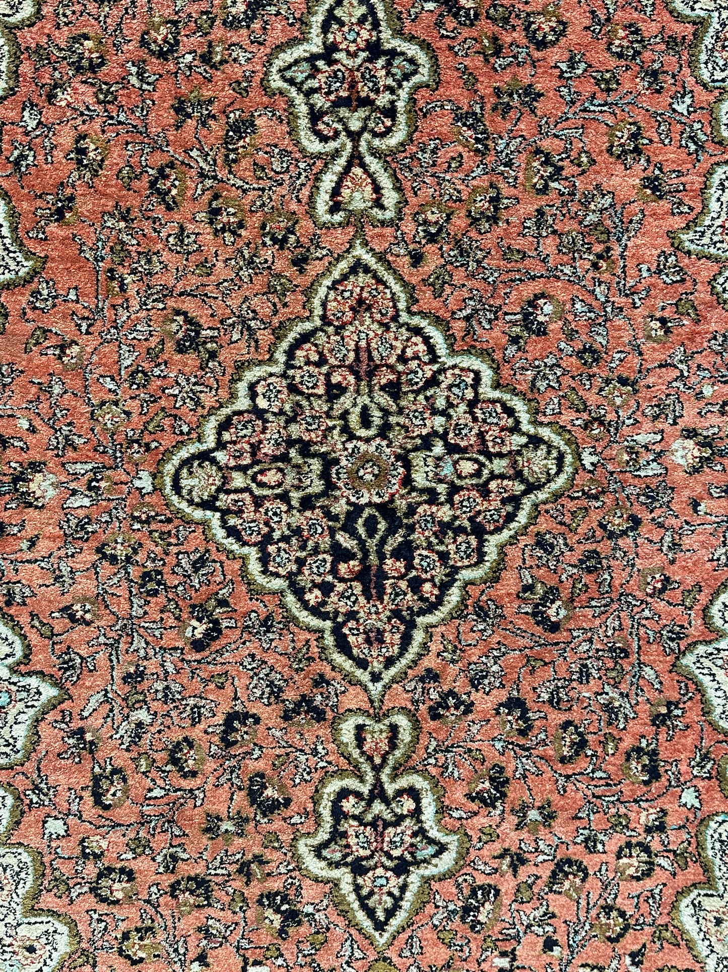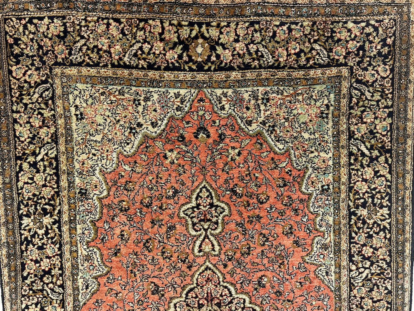 Dieser Teppich aus der Ghom-Region Persiens verkörpert die höchste Form der handwerklichen Kunst. Seine kunstvollen Seidenmuster, handgeknüpft mit exquisiter Präzision, strahlen eine unvergleichliche Eleganz und Qualität aus.