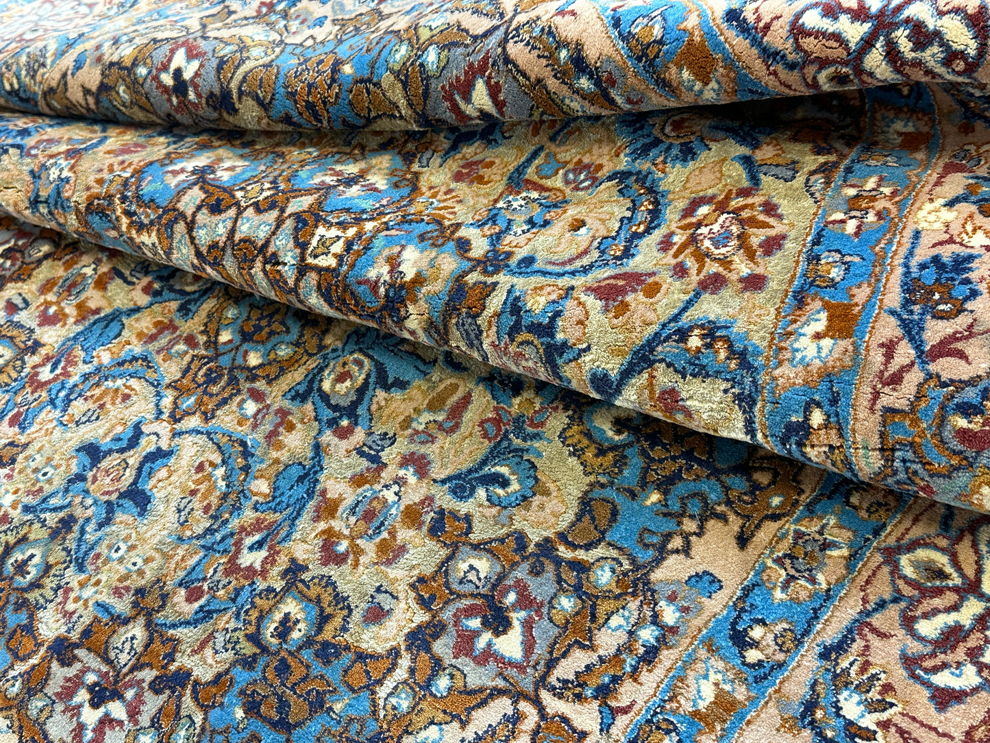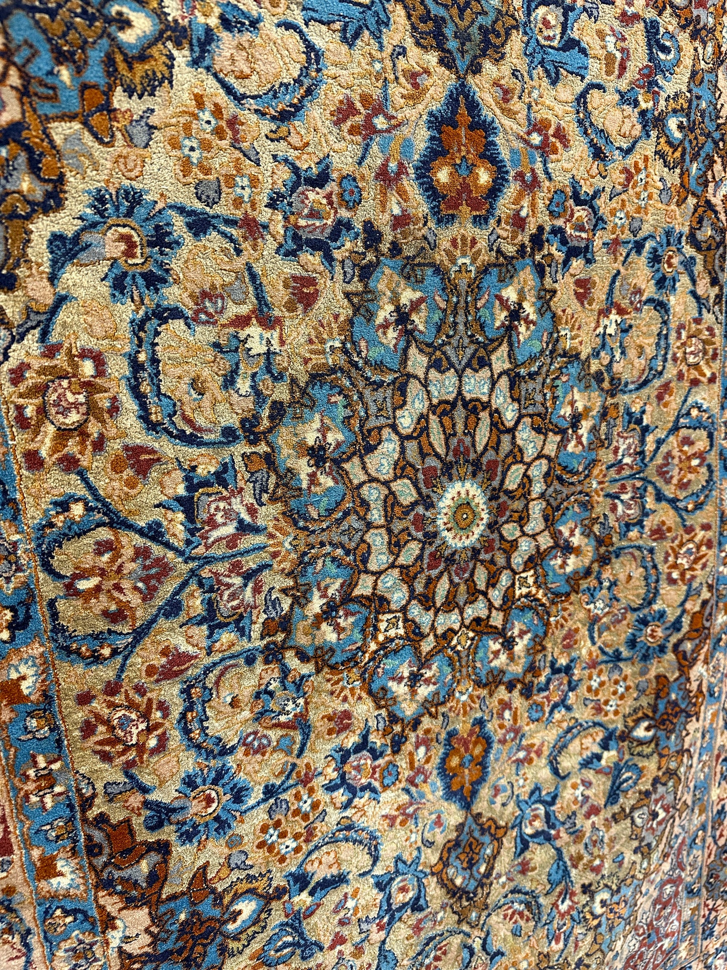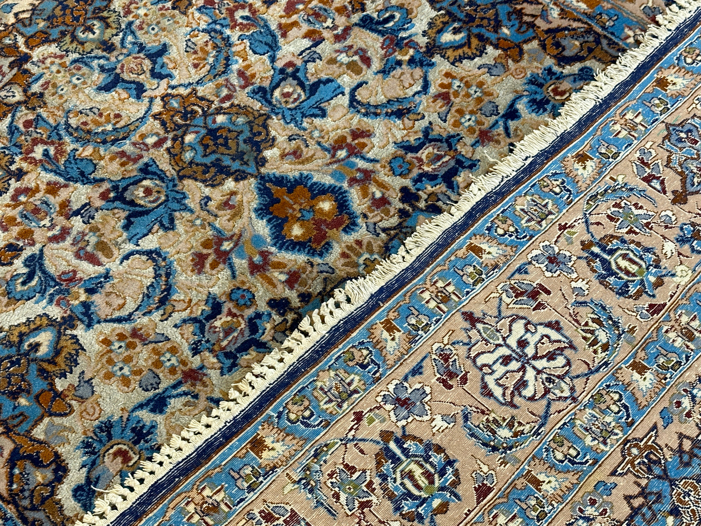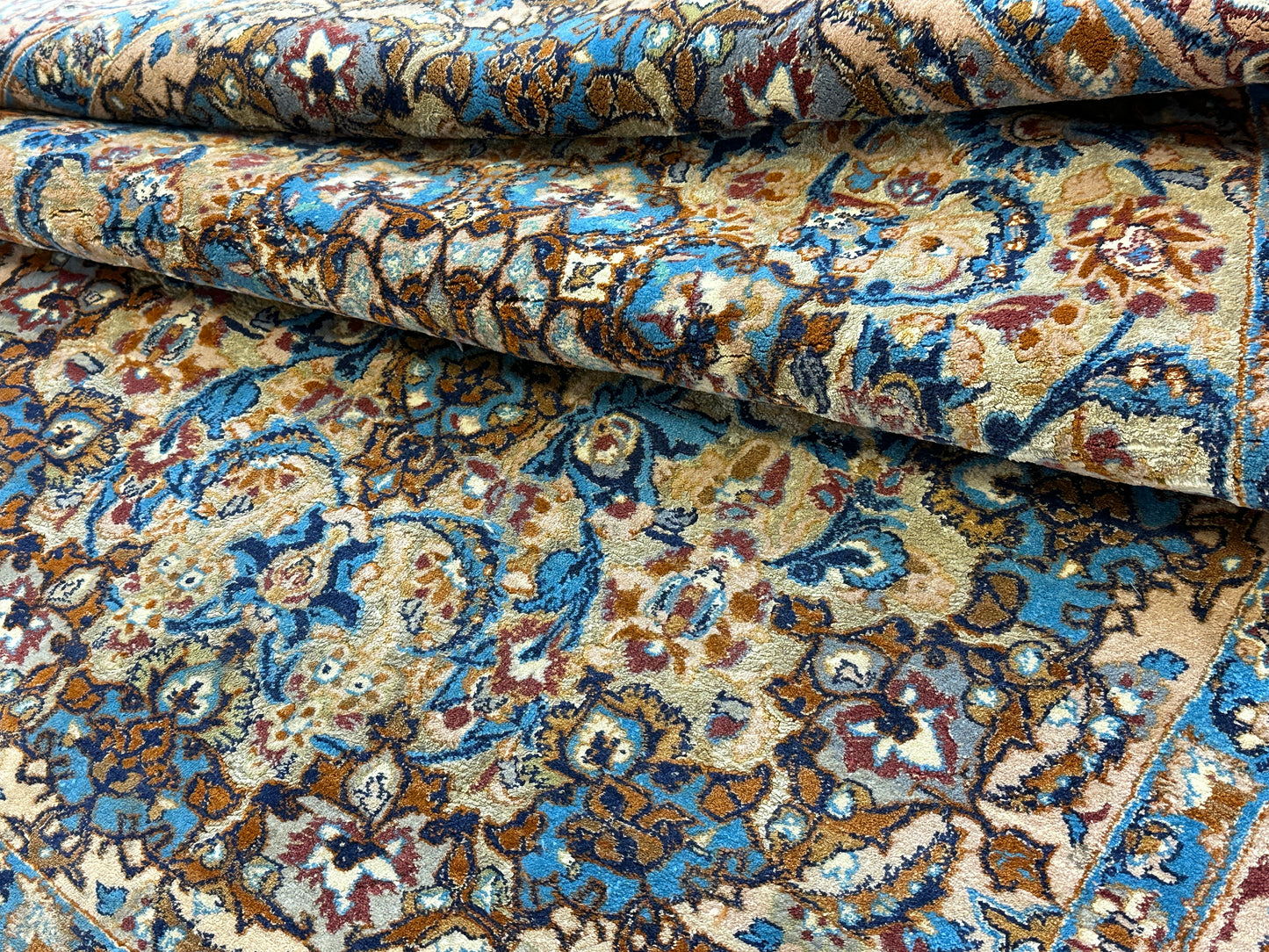Feinste Korkwolle auf Seide: Dieser Teppich ist aus hochwertiger Korkwolle auf Seide handgeknüpft, was seine herausragende Qualität und luxuriöse Beschaffenheit betont.