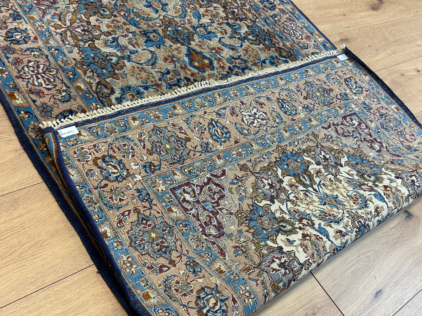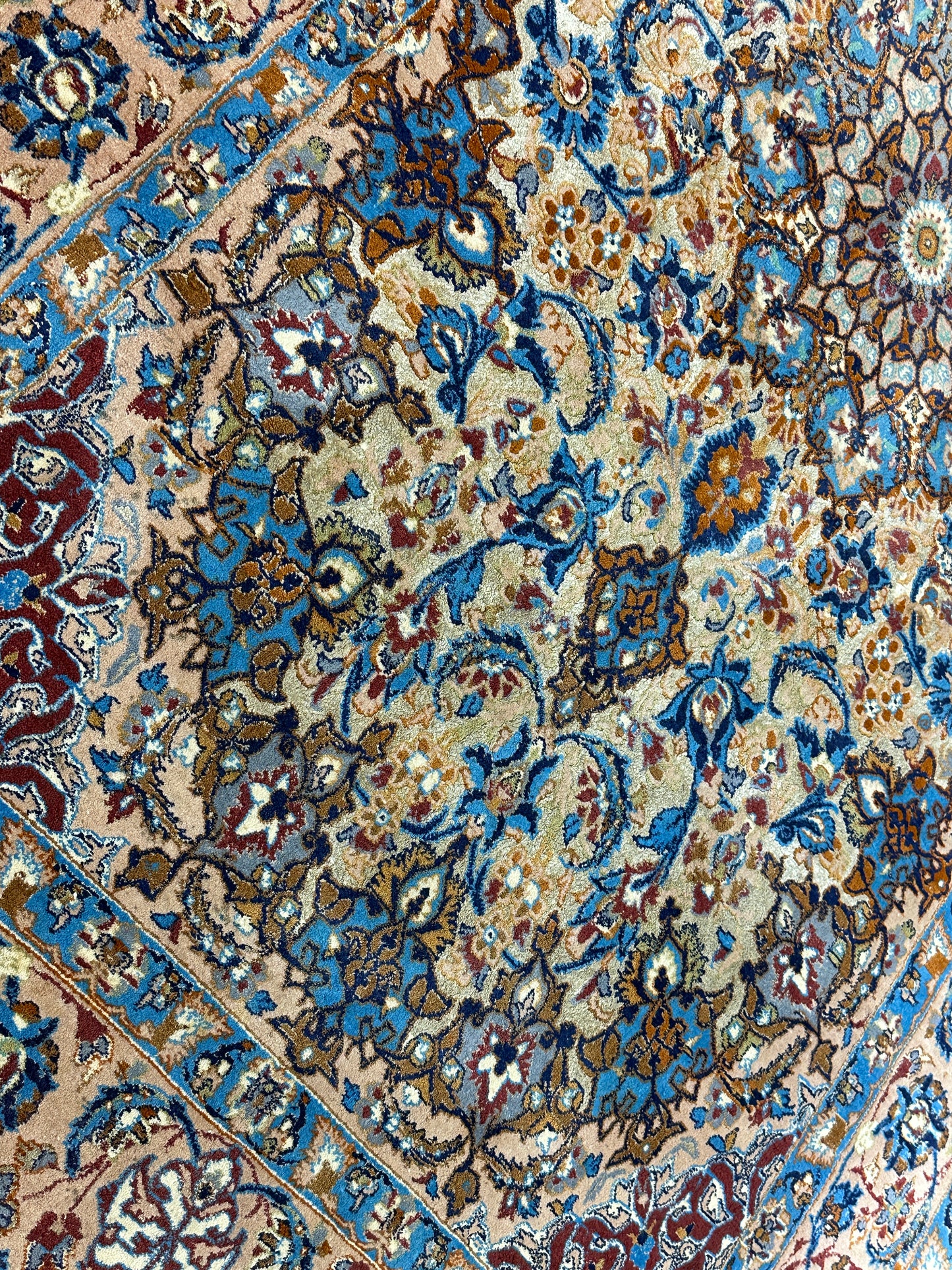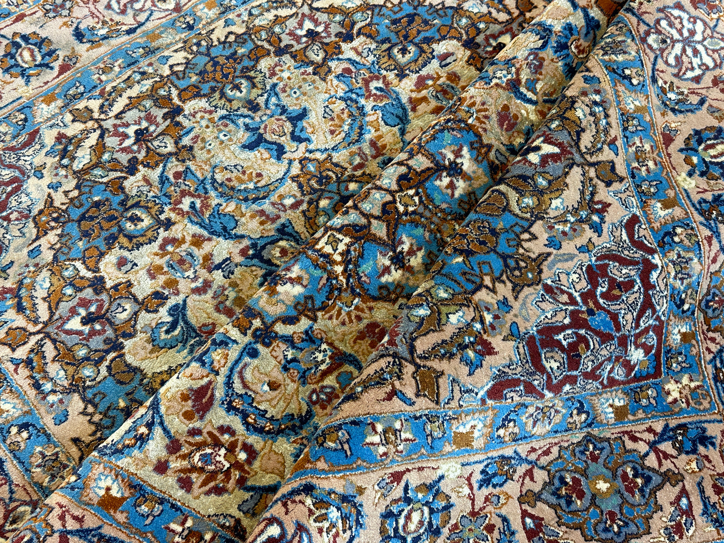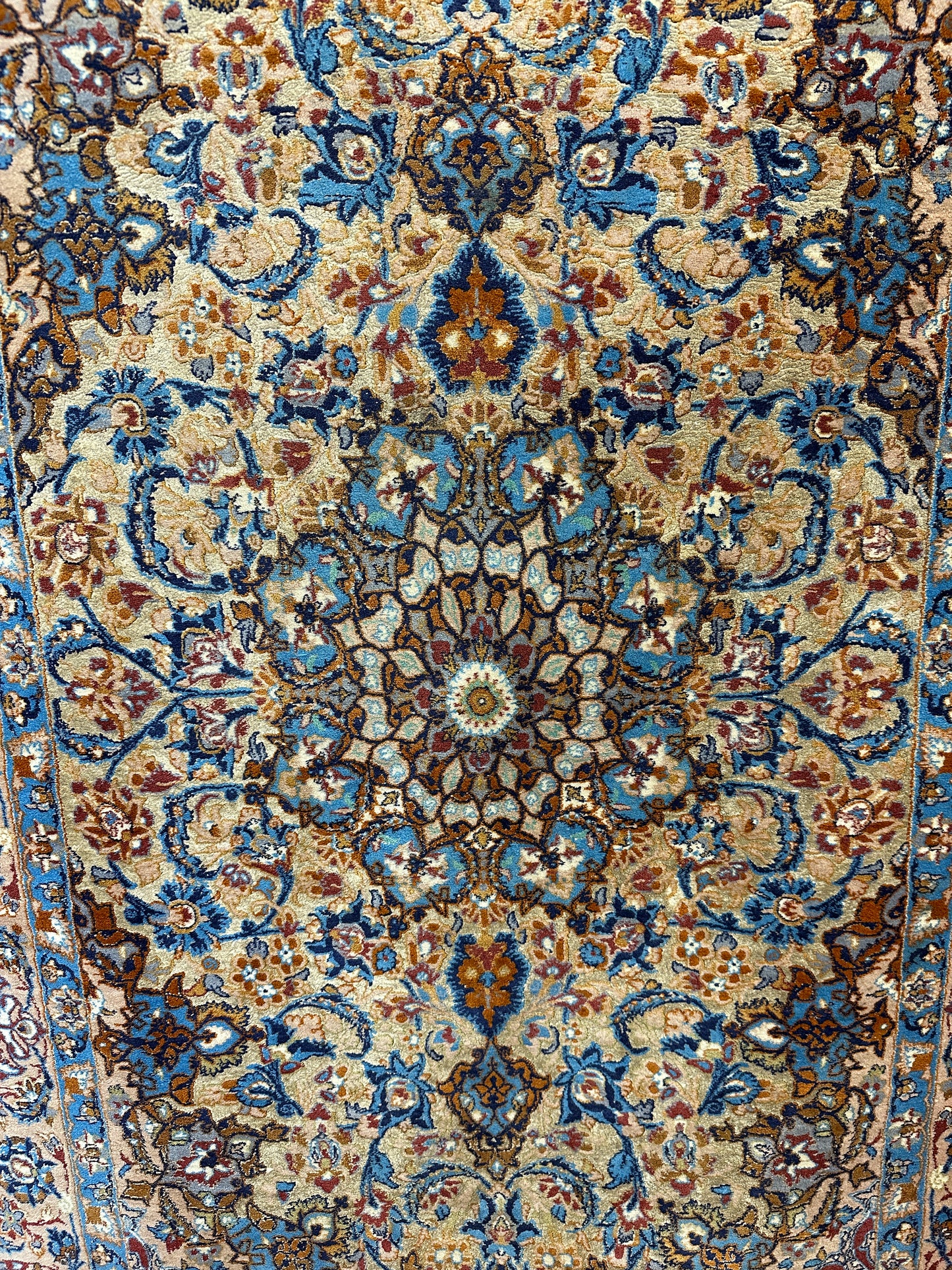Feinste Korkwolle auf Seide: Dieser Teppich ist aus hochwertiger Korkwolle auf Seide handgeknüpft, was seine herausragende Qualität und luxuriöse Beschaffenheit betont.