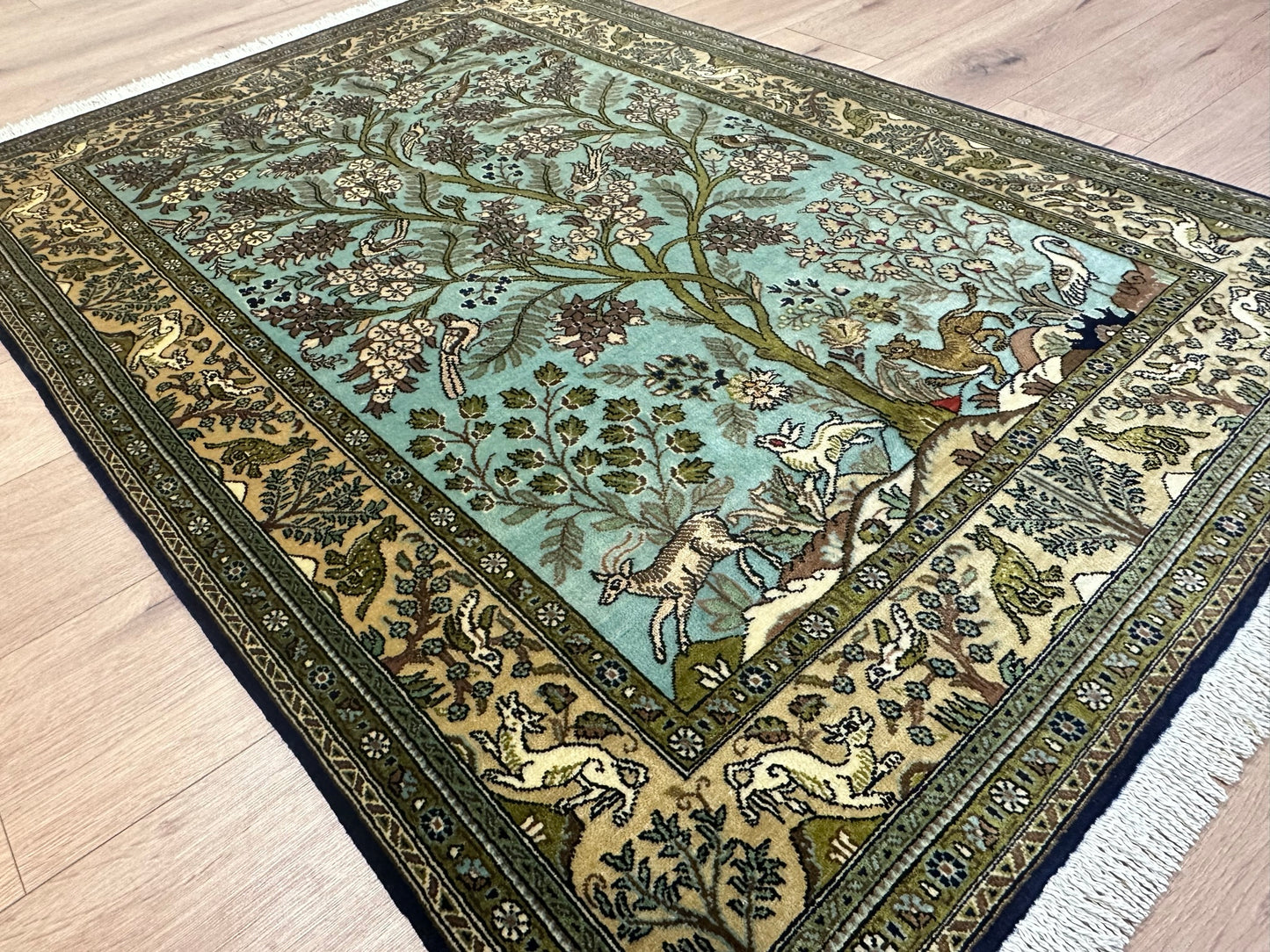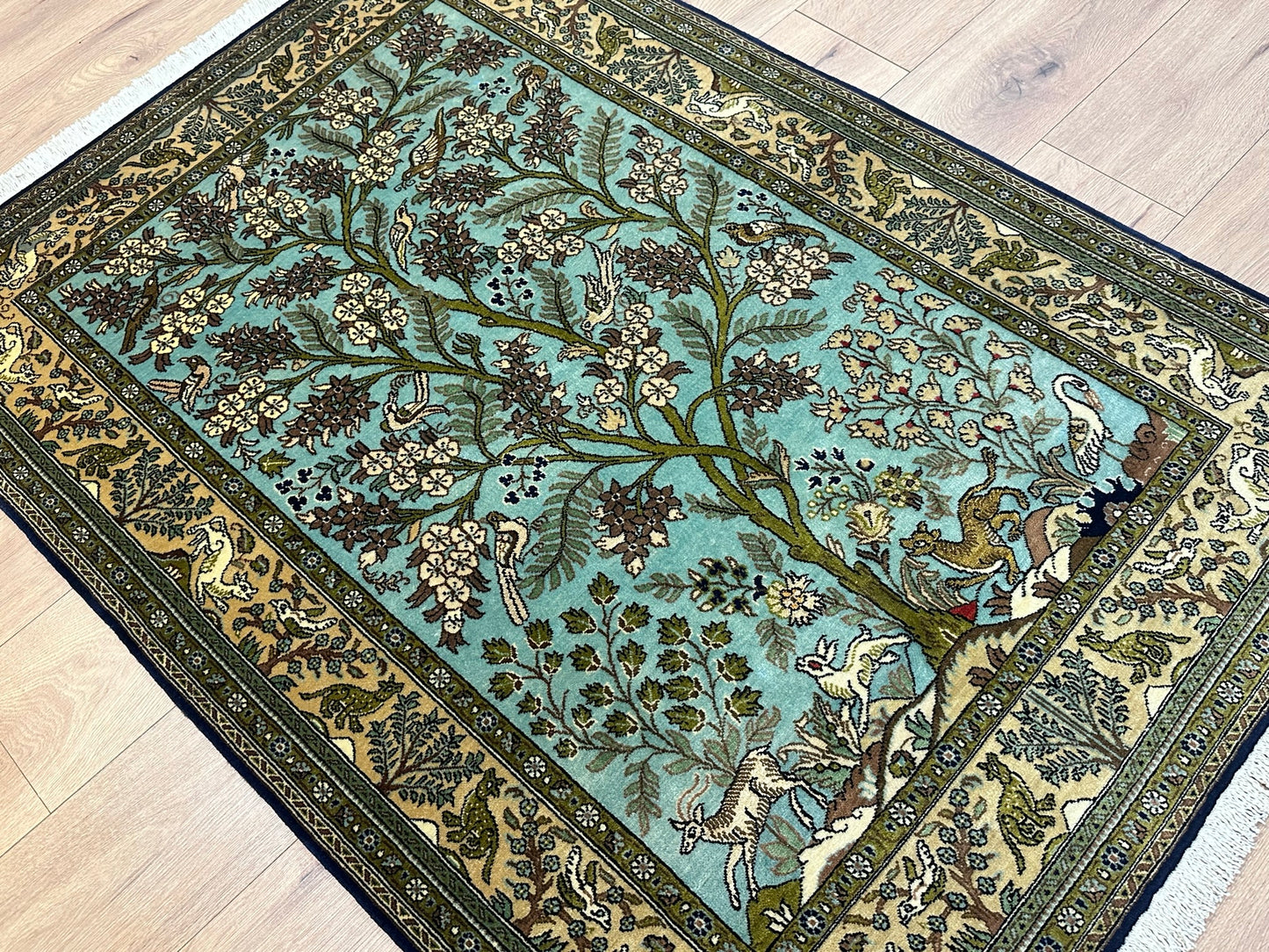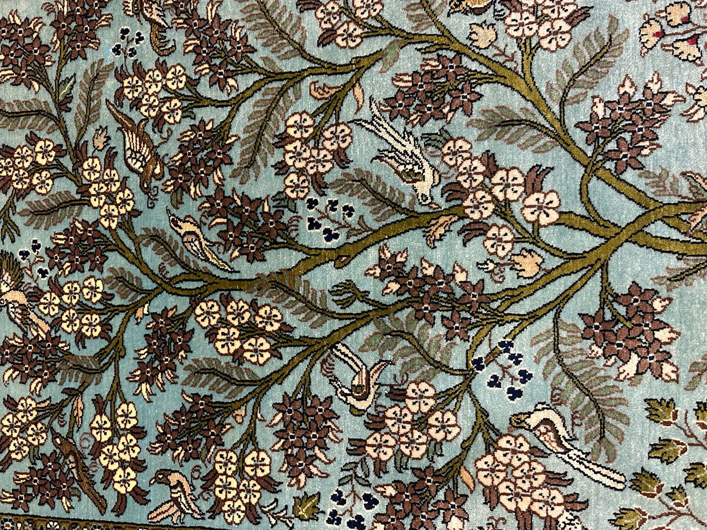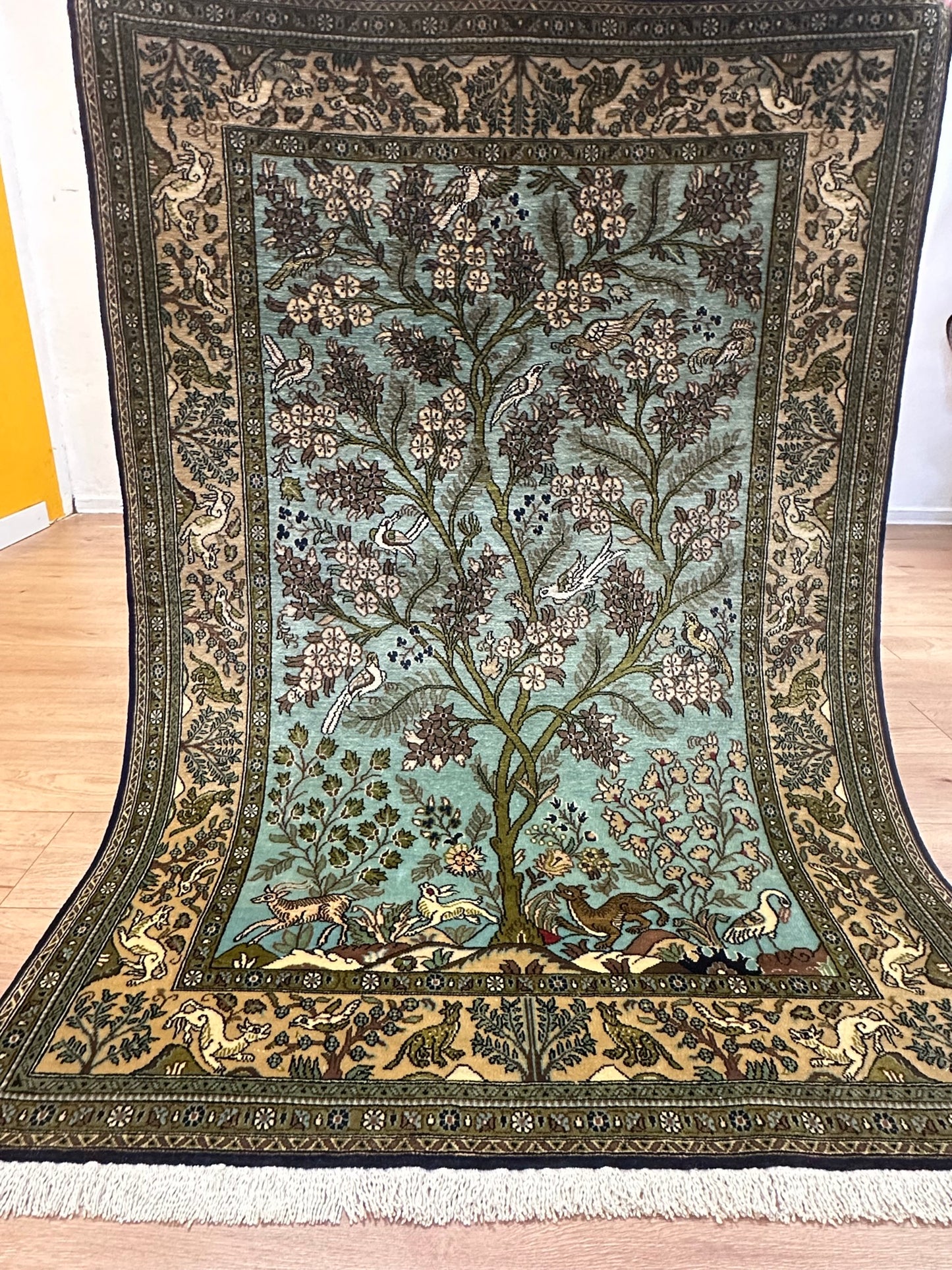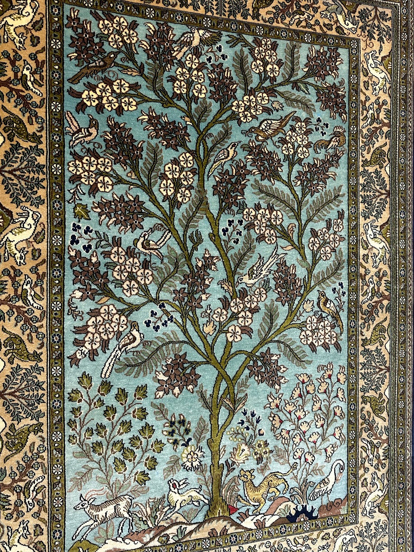 Das Design des Teppichs ist kunstvoll gestaltet und zeigt einen Lebensbaum, der reich mit Details und Symbolik gestaltet ist. Die Farben sind harmonisch abgestimmt und verleihen dem Teppich eine zeitlose Eleganz und Wärme.