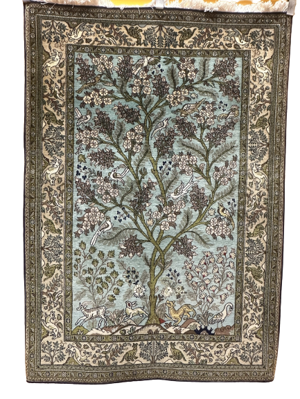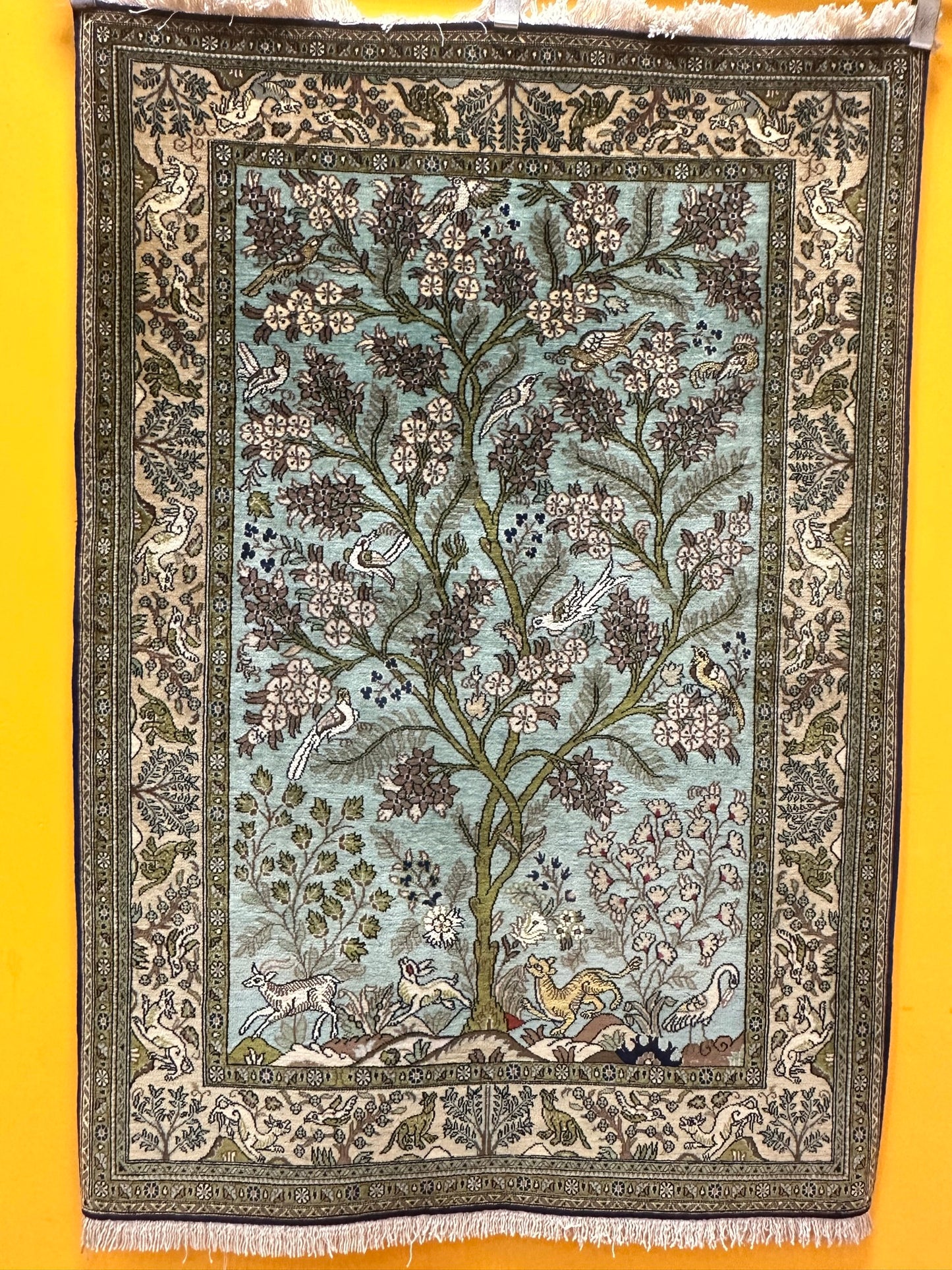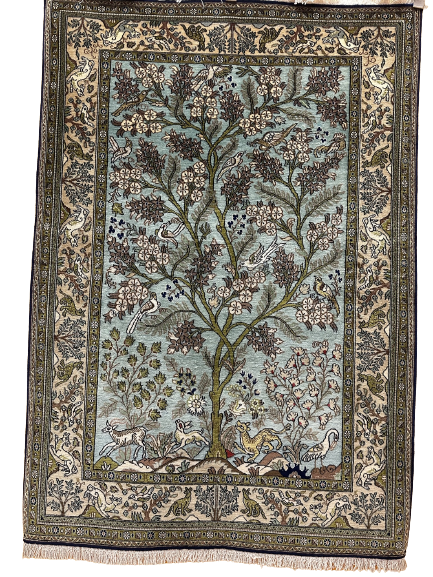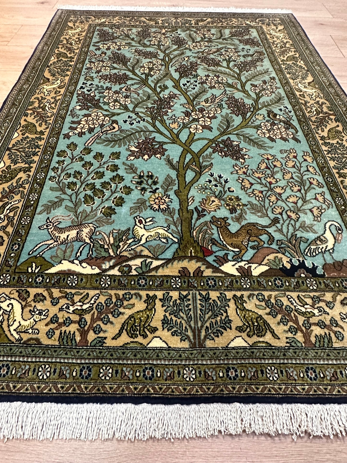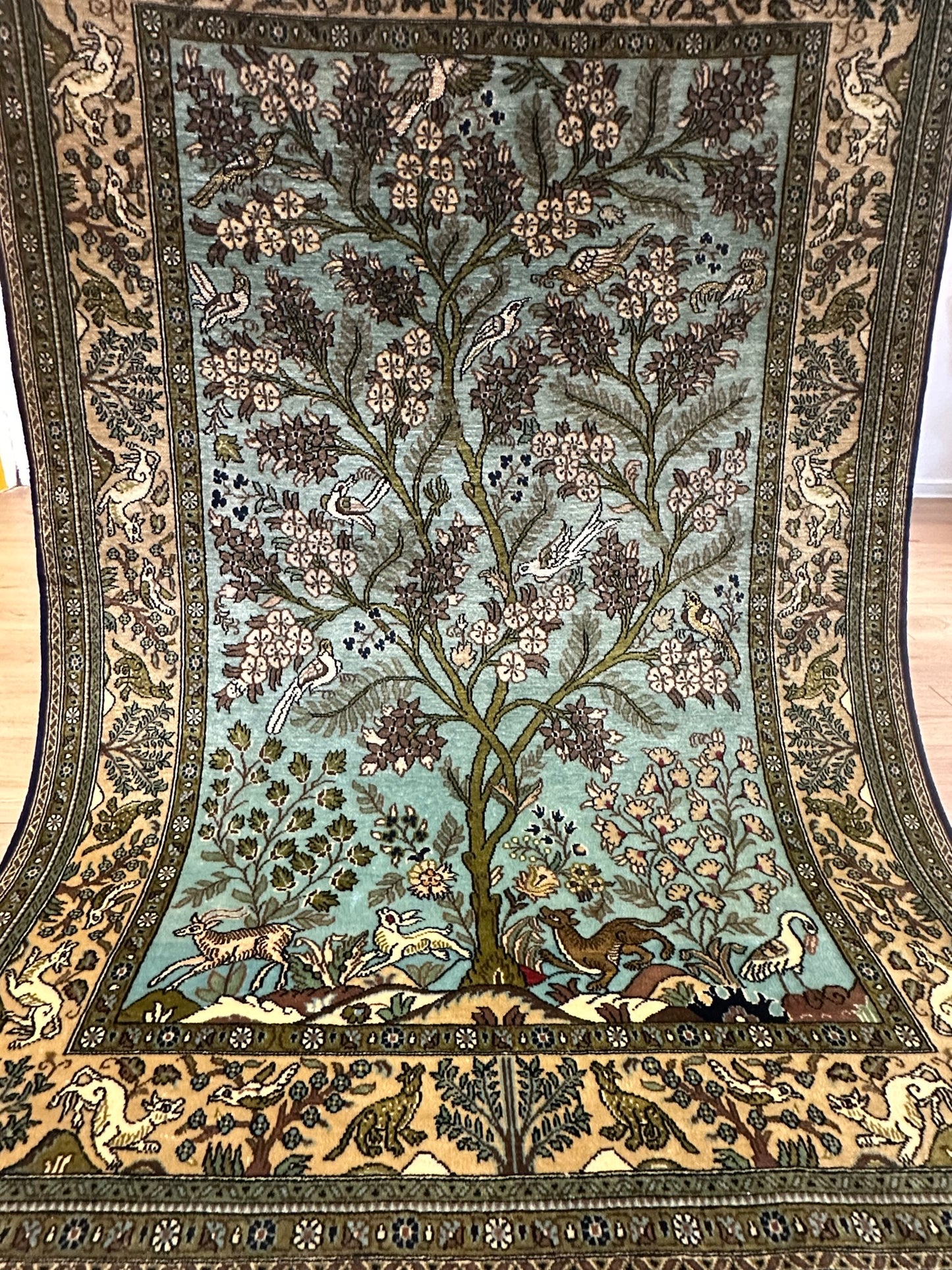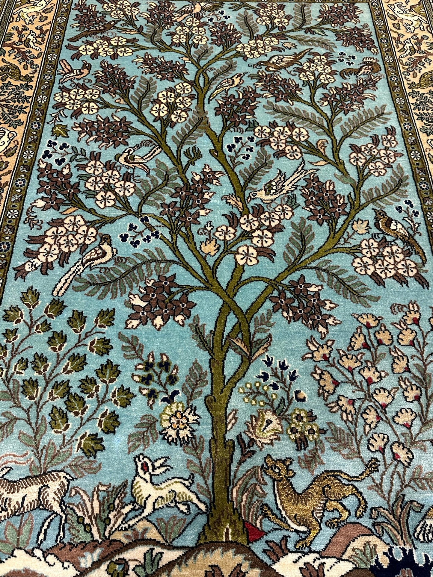 Das Design des Teppichs ist kunstvoll gestaltet und zeigt einen Lebensbaum, der reich mit Details und Symbolik gestaltet ist. Die Farben sind harmonisch abgestimmt und verleihen dem Teppich eine zeitlose Eleganz und Wärme.