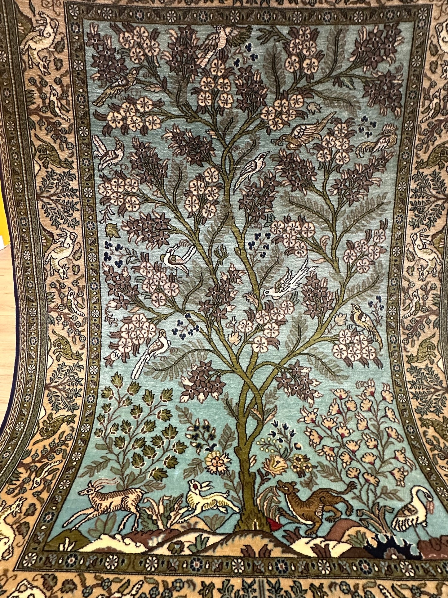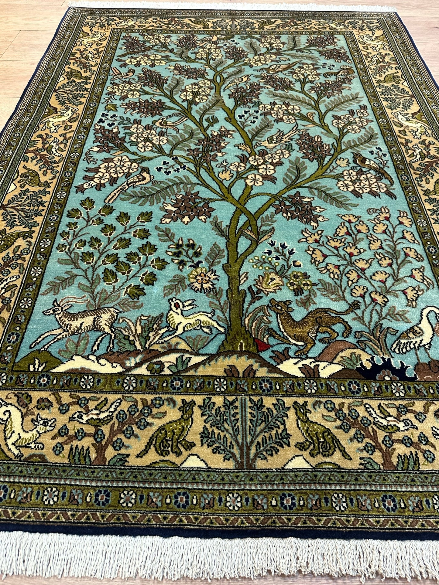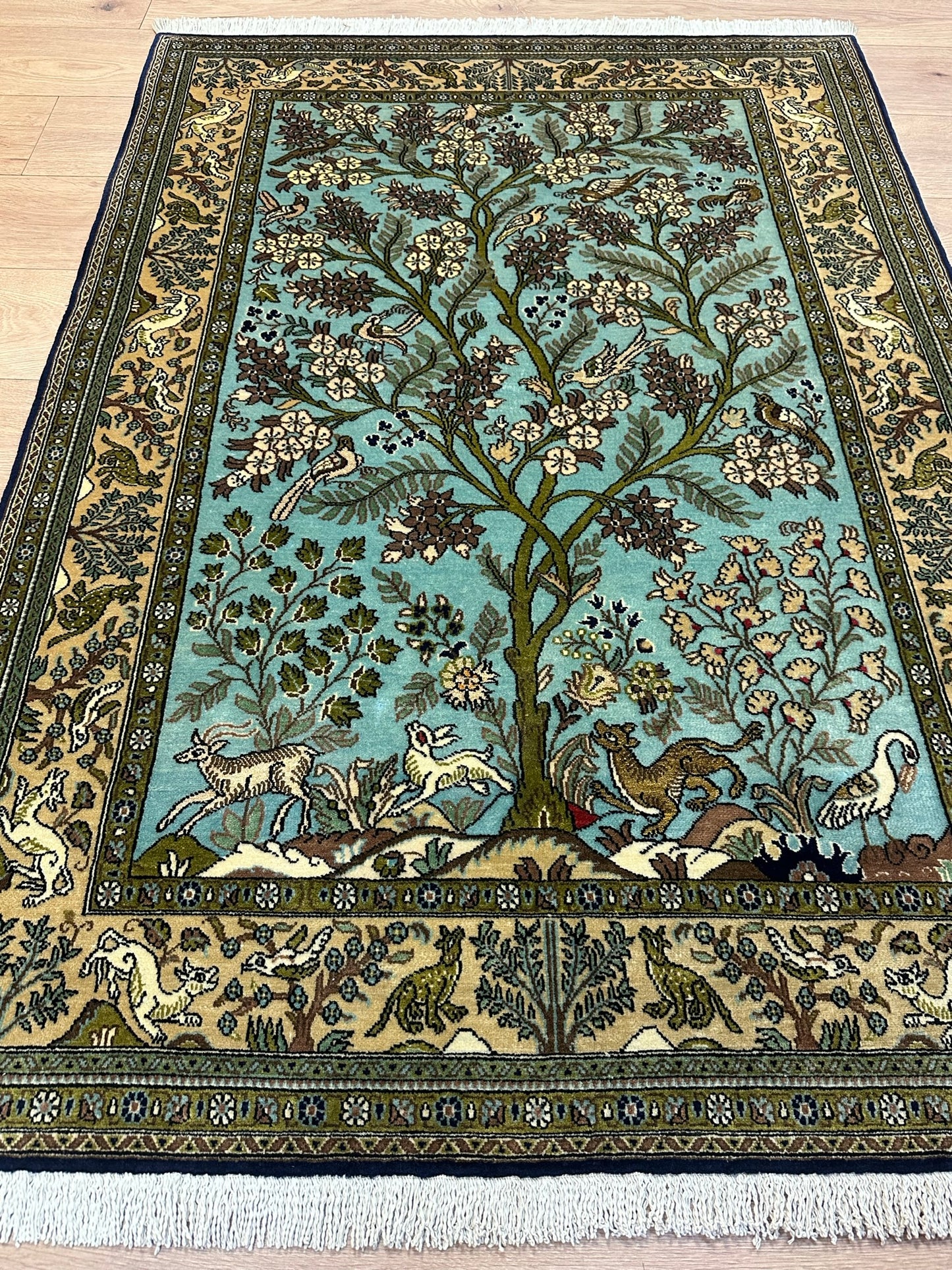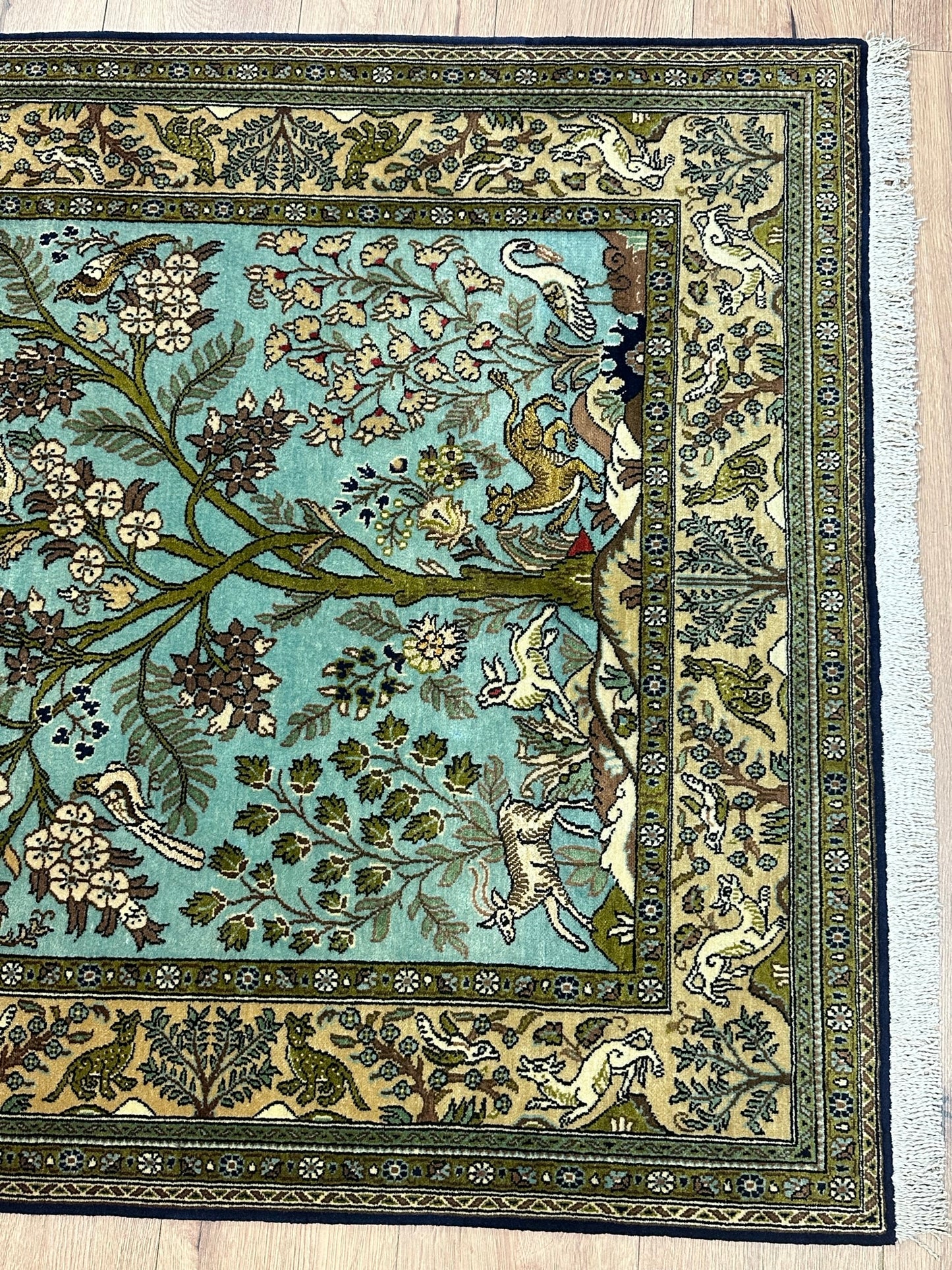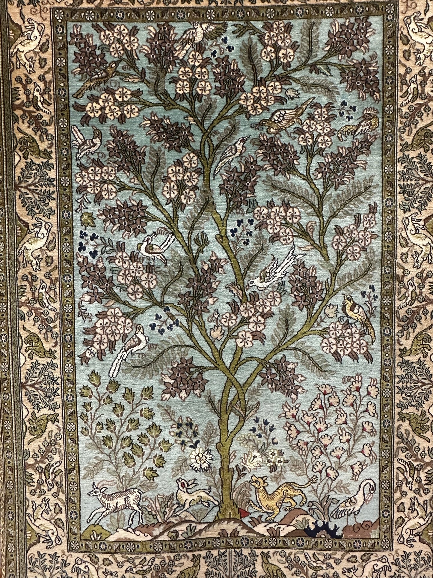 Das Design des Teppichs ist kunstvoll gestaltet und zeigt einen Lebensbaum, der reich mit Details und Symbolik gestaltet ist. Die Farben sind harmonisch abgestimmt und verleihen dem Teppich eine zeitlose Eleganz und Wärme.