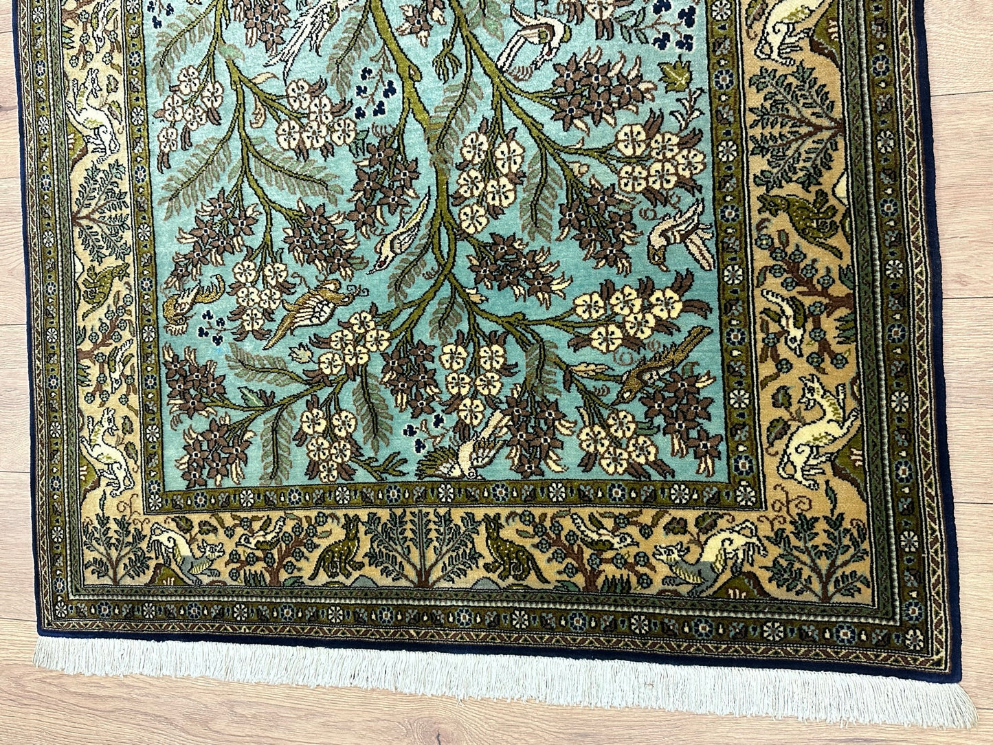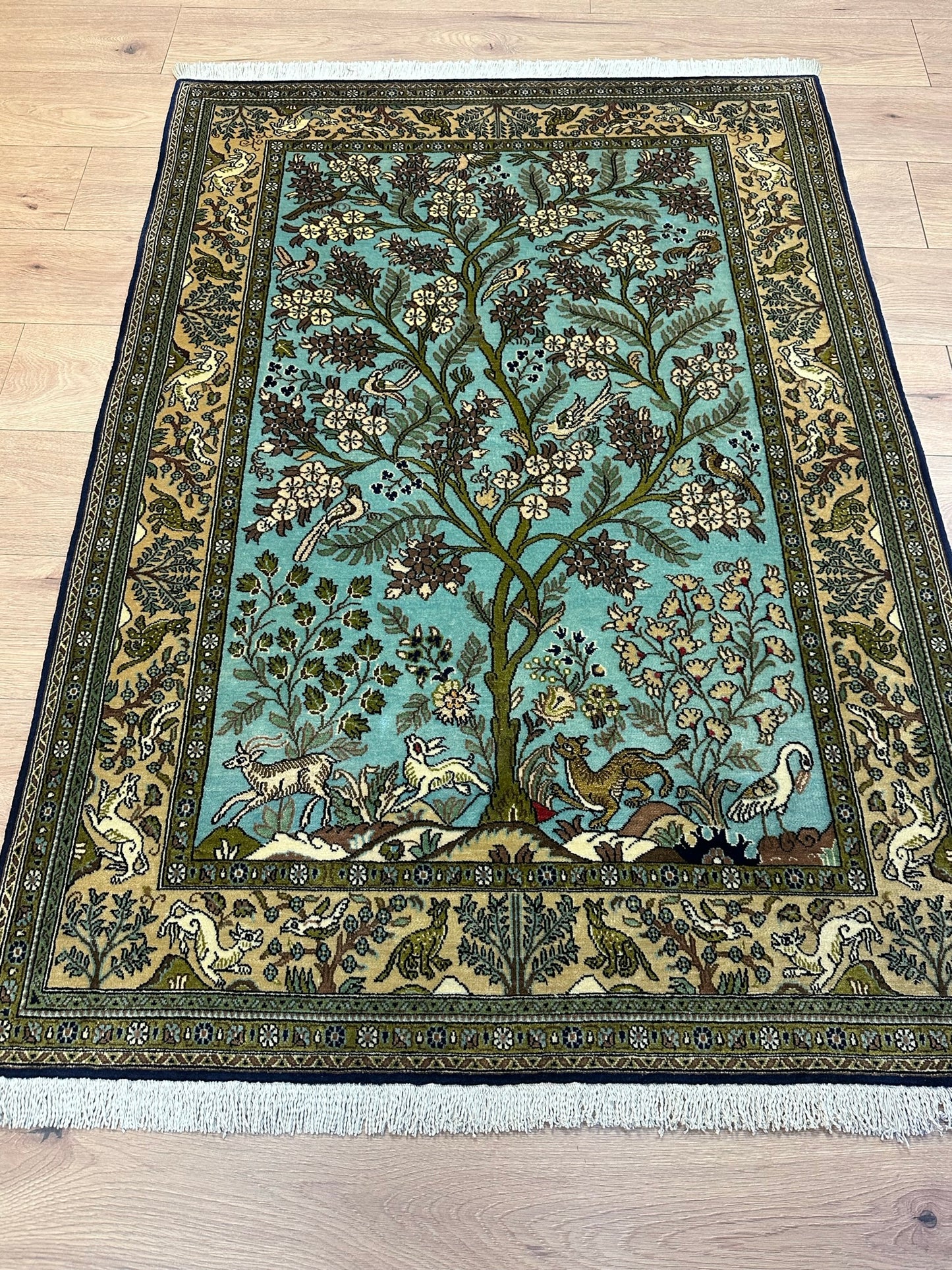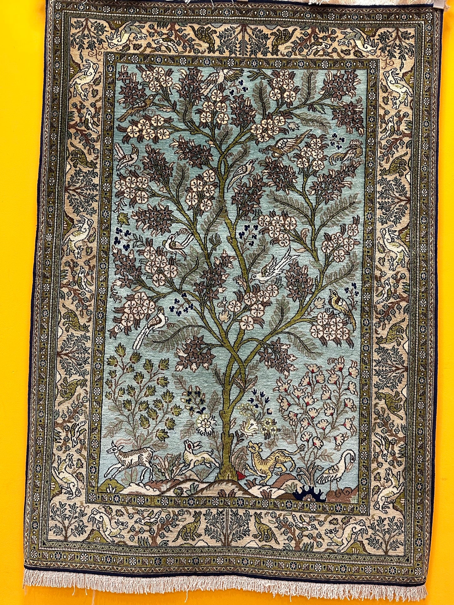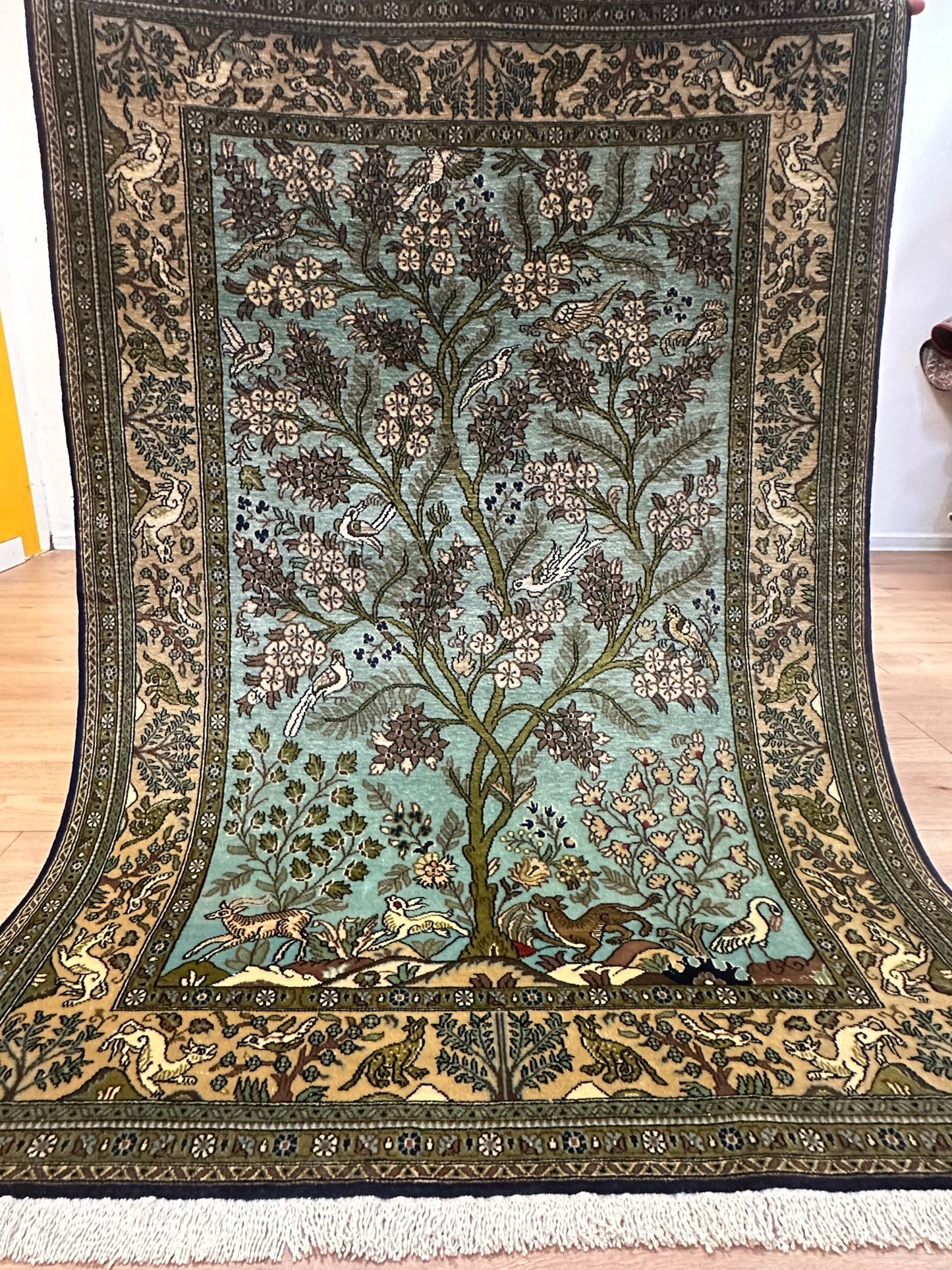 Das Design des Teppichs ist kunstvoll gestaltet und zeigt einen Lebensbaum, der reich mit Details und Symbolik gestaltet ist. Die Farben sind harmonisch abgestimmt und verleihen dem Teppich eine zeitlose Eleganz und Wärme.