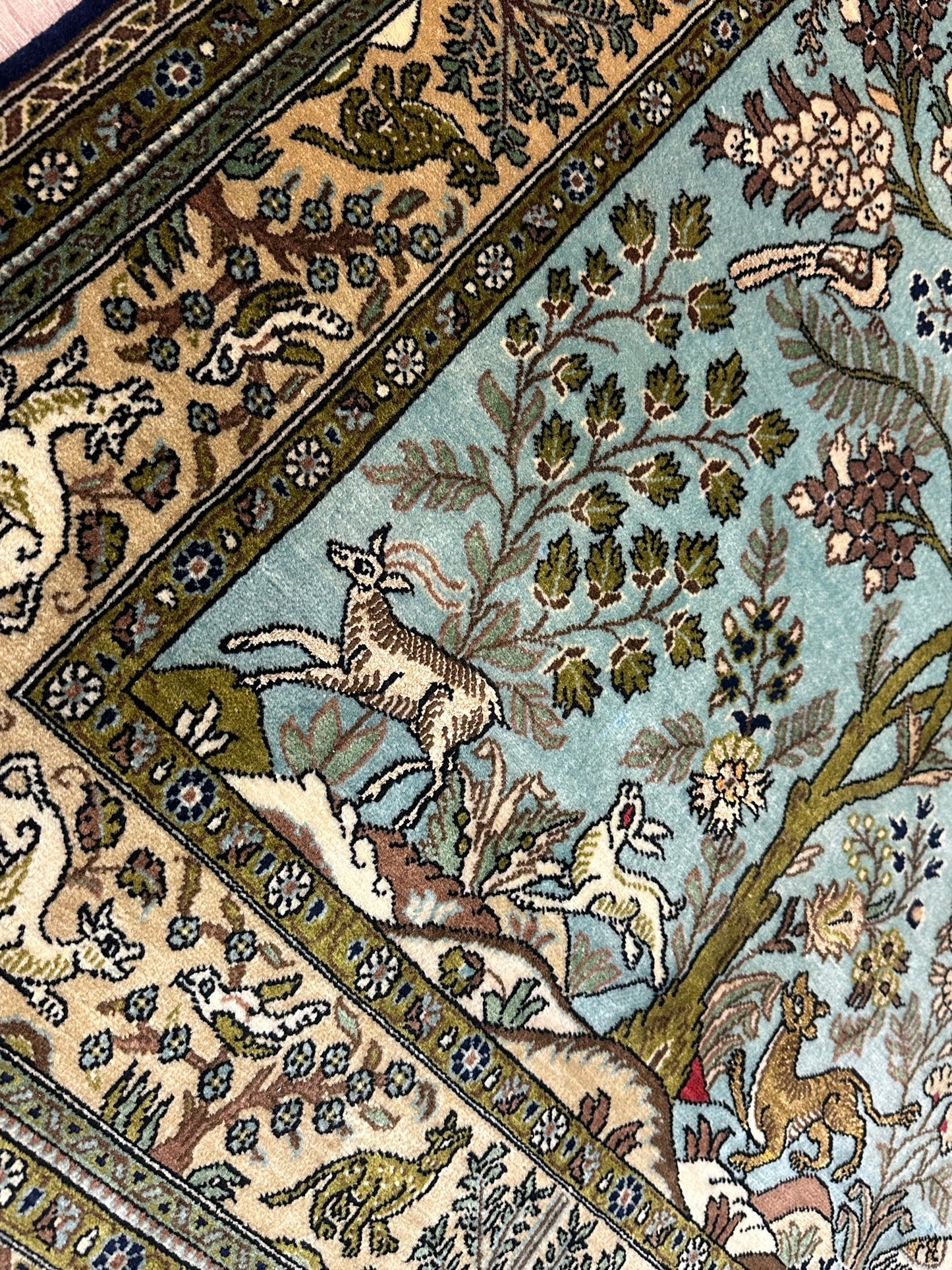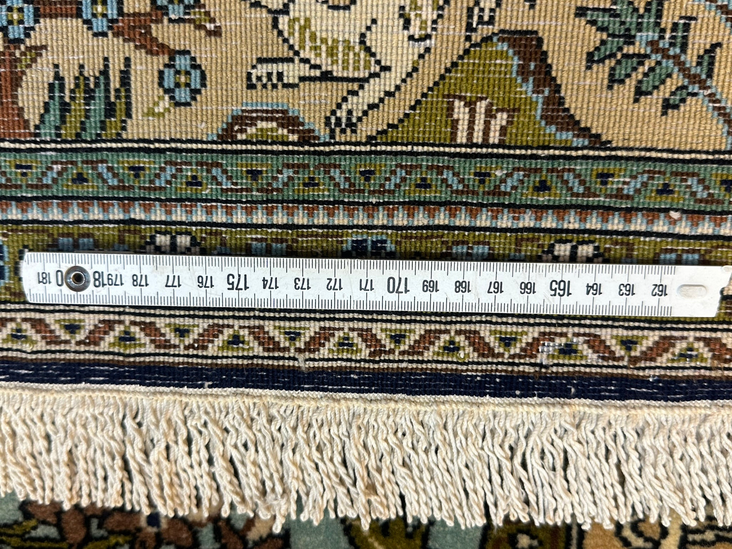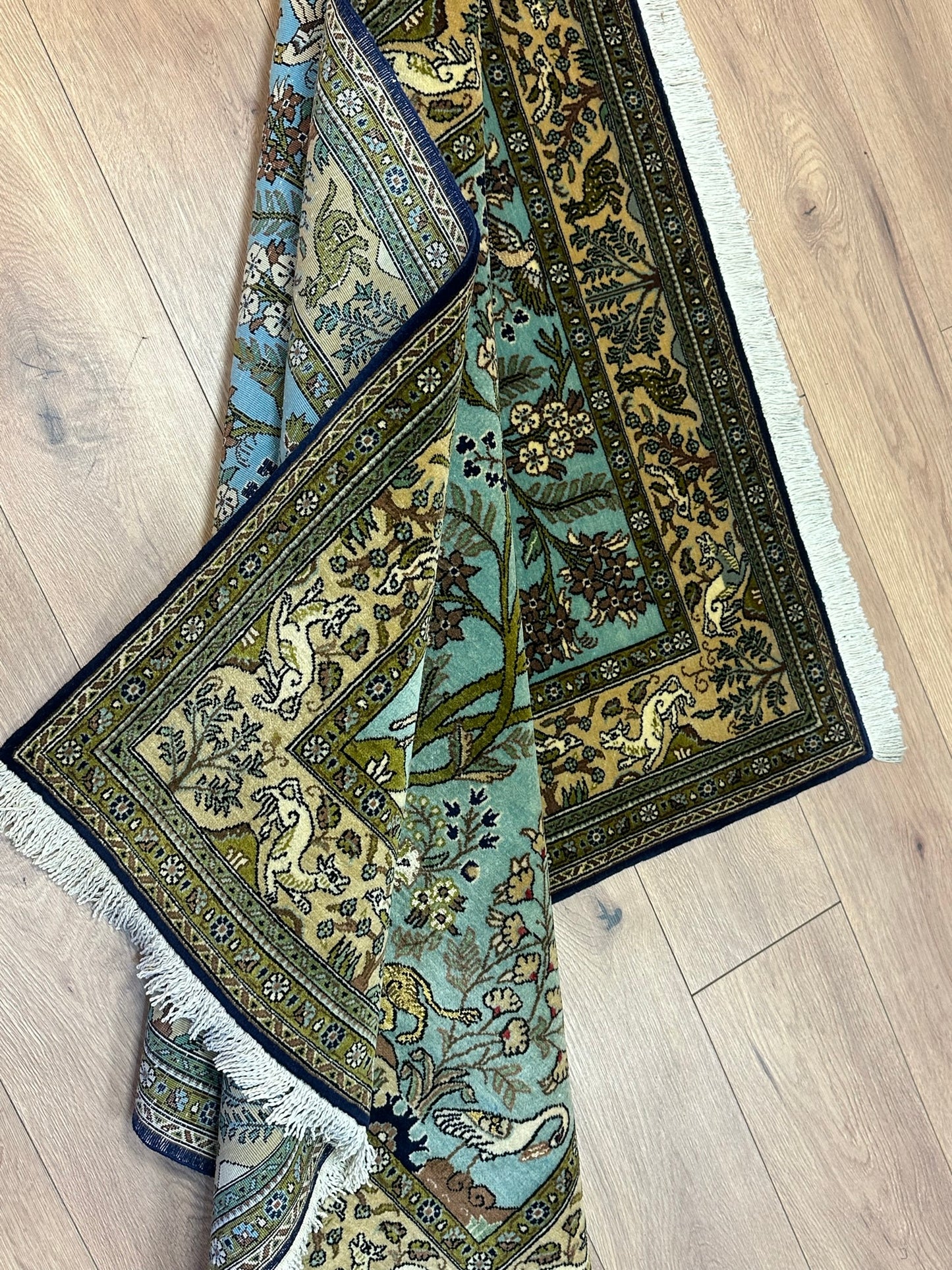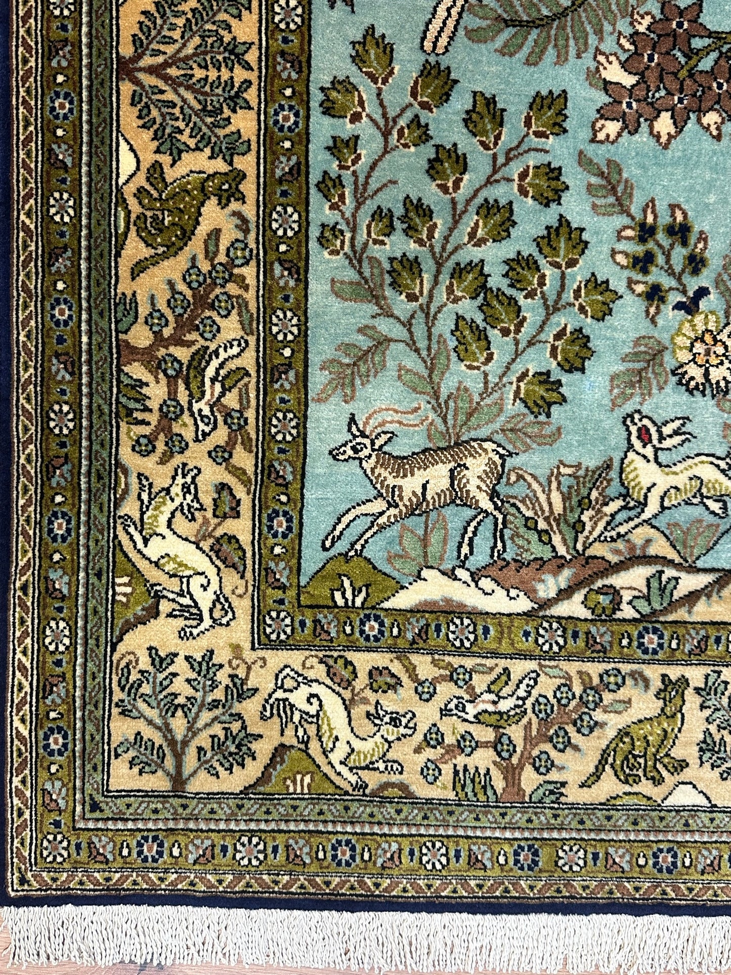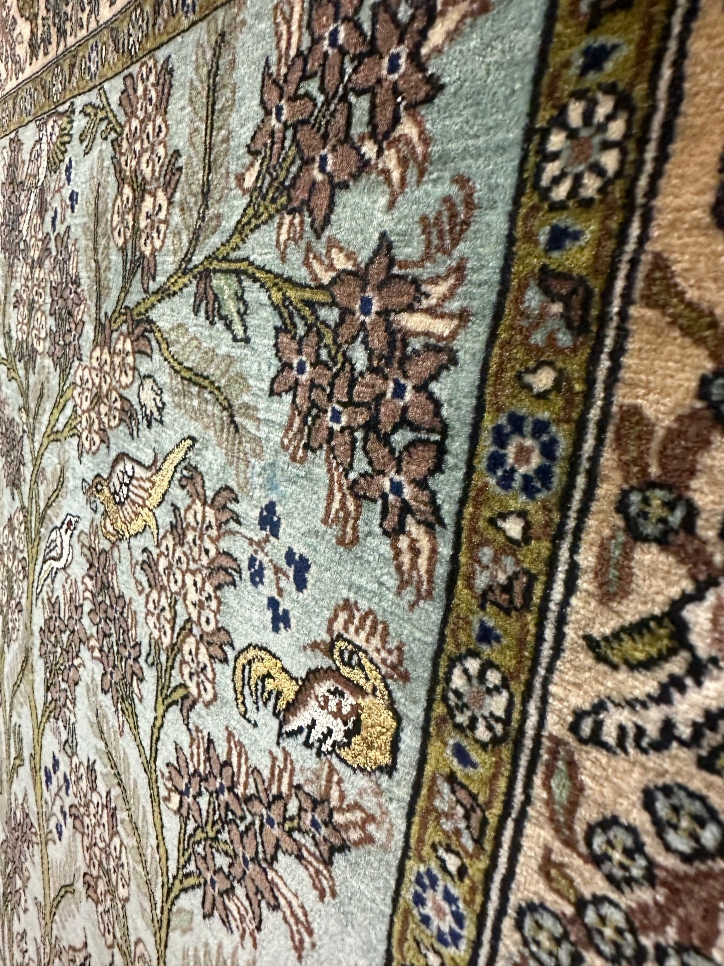 Das Design des Teppichs ist kunstvoll gestaltet und zeigt einen Lebensbaum, der reich mit Details und Symbolik gestaltet ist. Die Farben sind harmonisch abgestimmt und verleihen dem Teppich eine zeitlose Eleganz und Wärme.