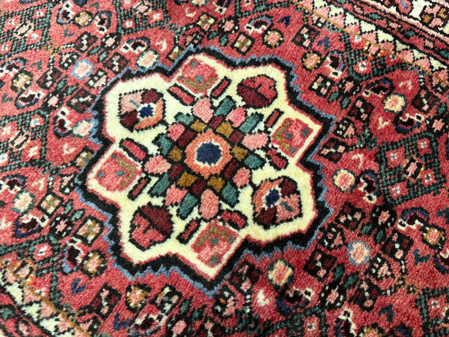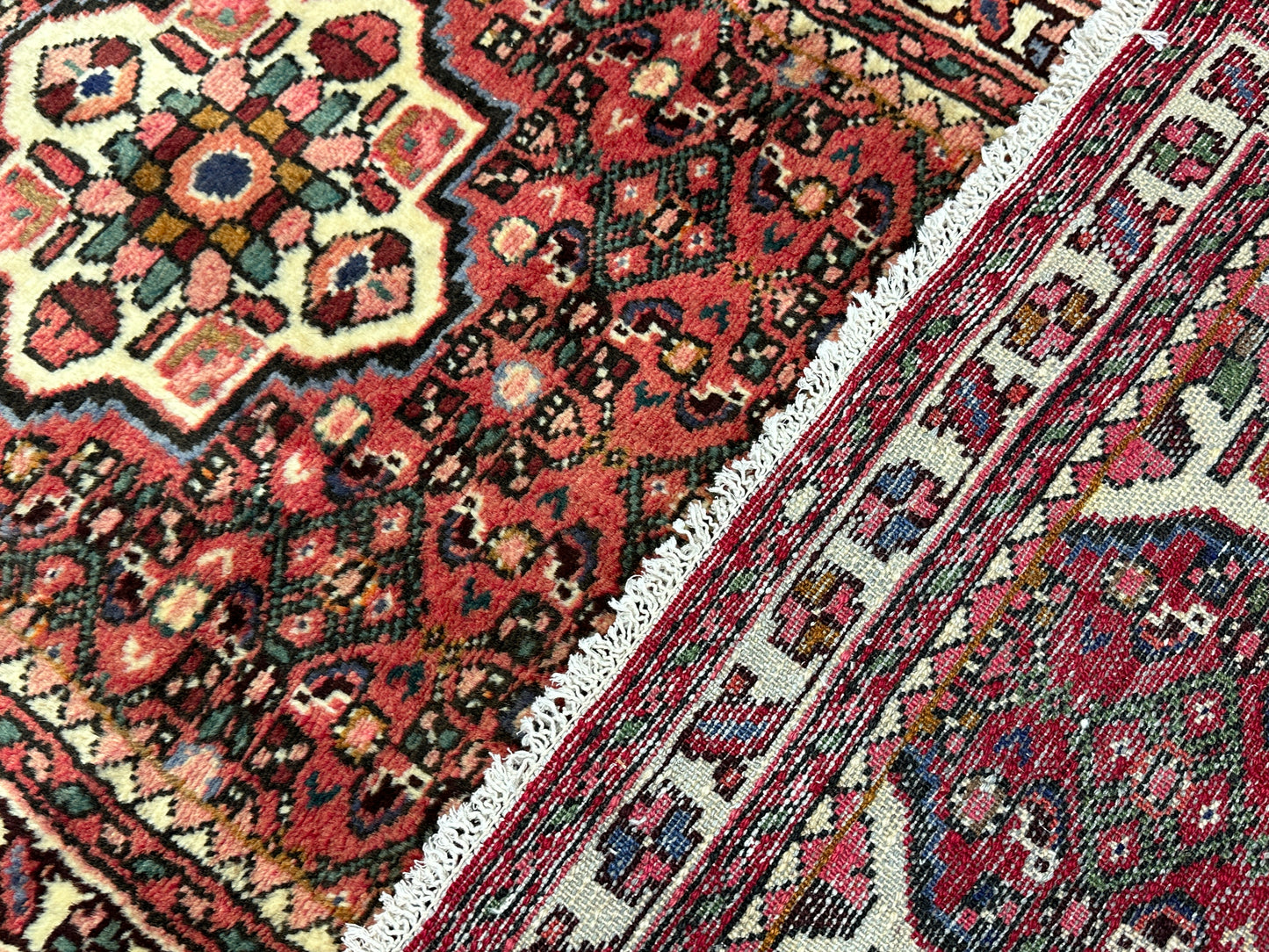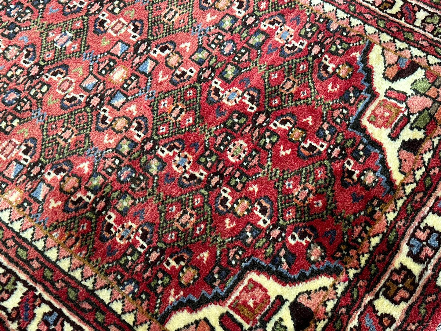 • Design und Herkunft: Dieser handgeknüpfte Teppich im Hamadan-Stil stammt aus Persien, einem Ort bekannt für seine jahrhundertealte Tradition in der Teppichherstellung. Das Design repräsentiert die reiche Kultur und Kunstfertigkeit des Orients.