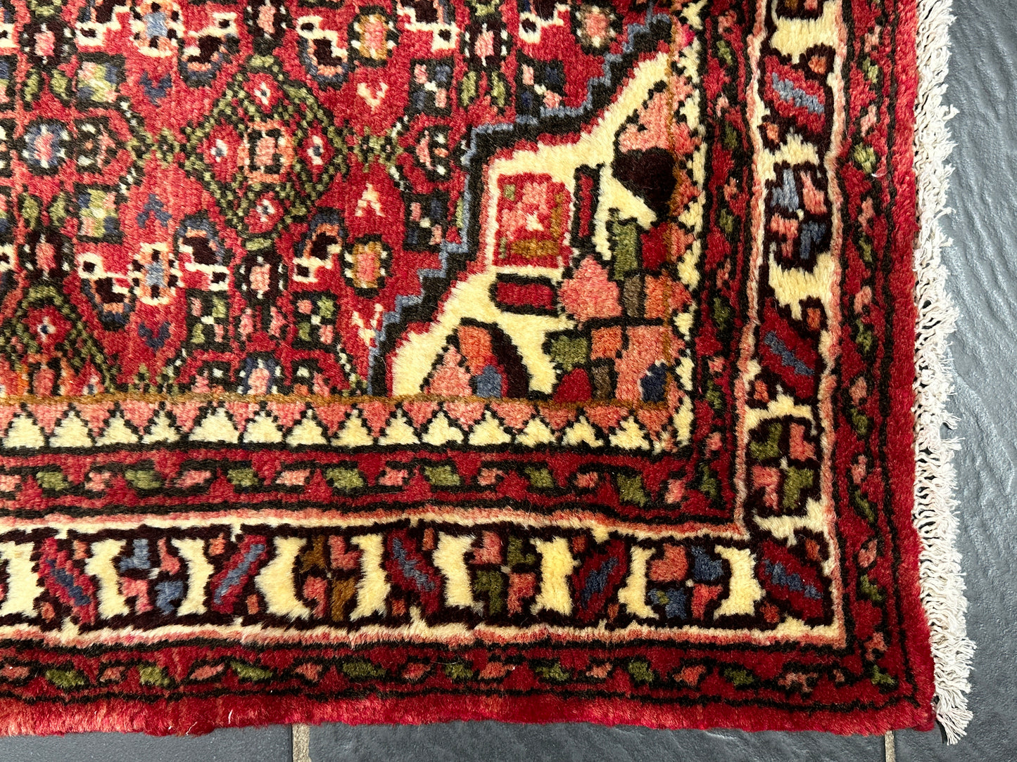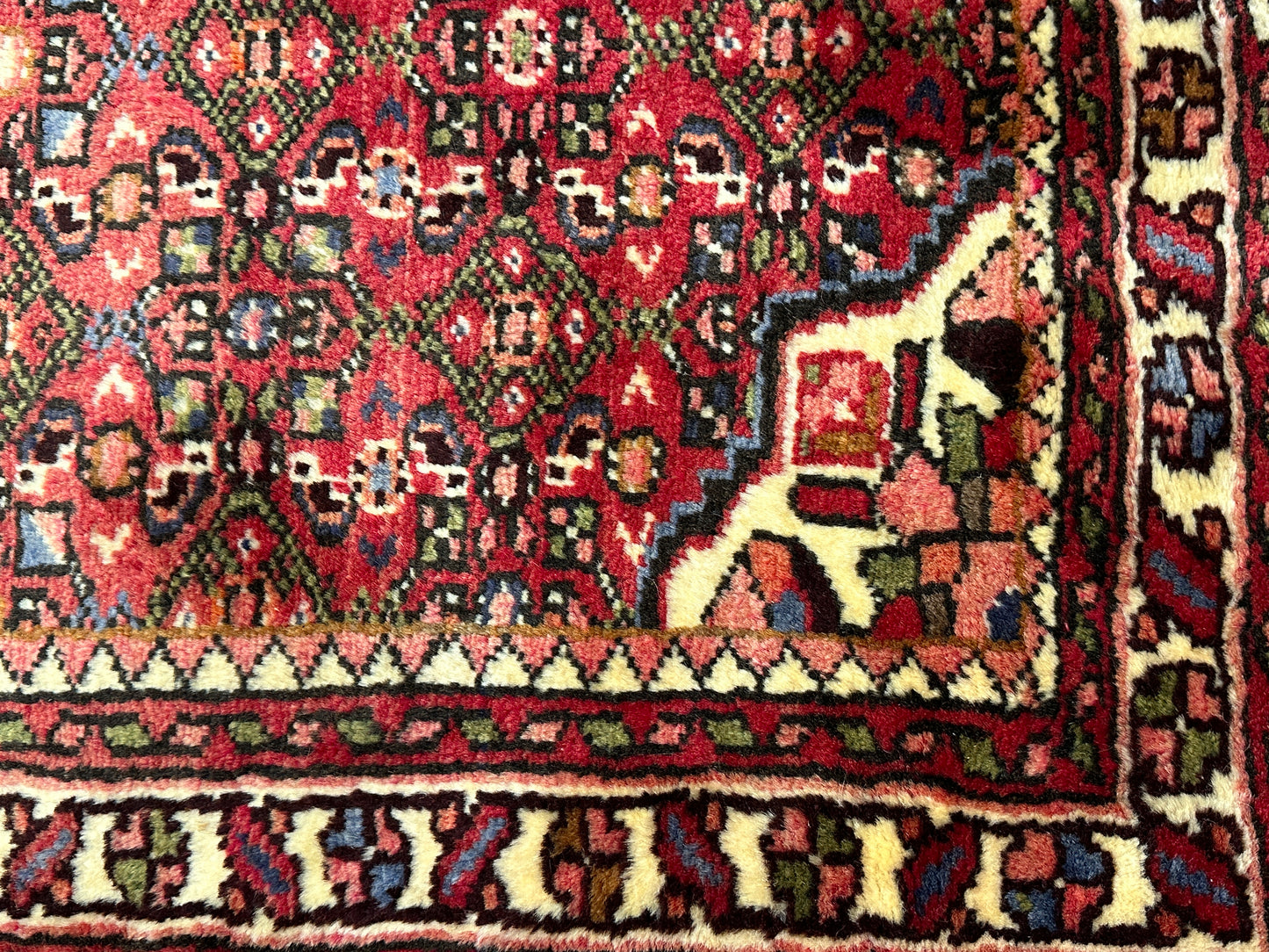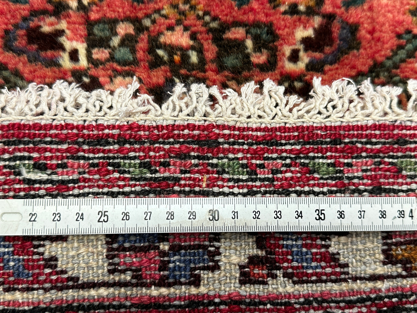 • Design und Herkunft: Dieser handgeknüpfte Teppich im Hamadan-Stil stammt aus Persien, einem Ort bekannt für seine jahrhundertealte Tradition in der Teppichherstellung. Das Design repräsentiert die reiche Kultur und Kunstfertigkeit des Orients.