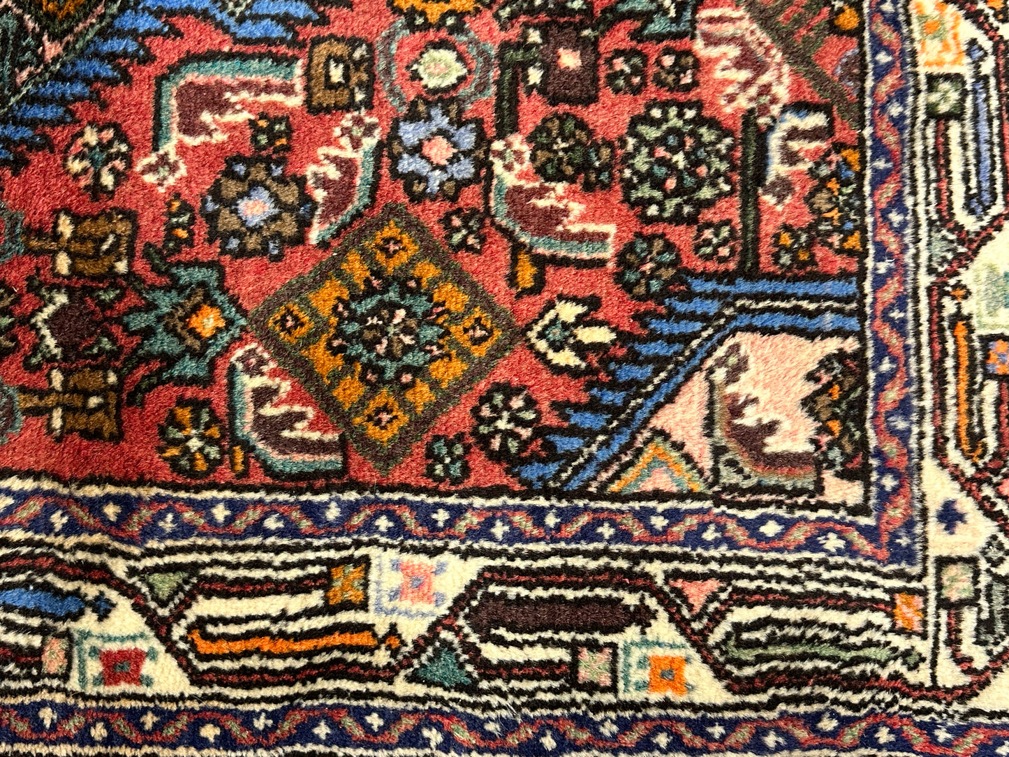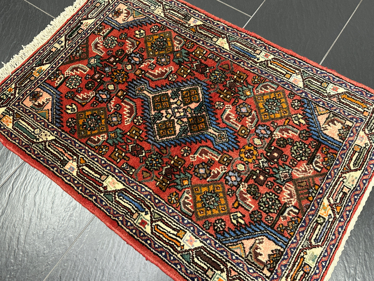 • Design: Das zentrale Medaillon-Design, umgeben von kunstvollen Ornamenten und floralen Motiven, zeugt von der traditionellen Handwerkskunst der Hamadan-Region im Iran.