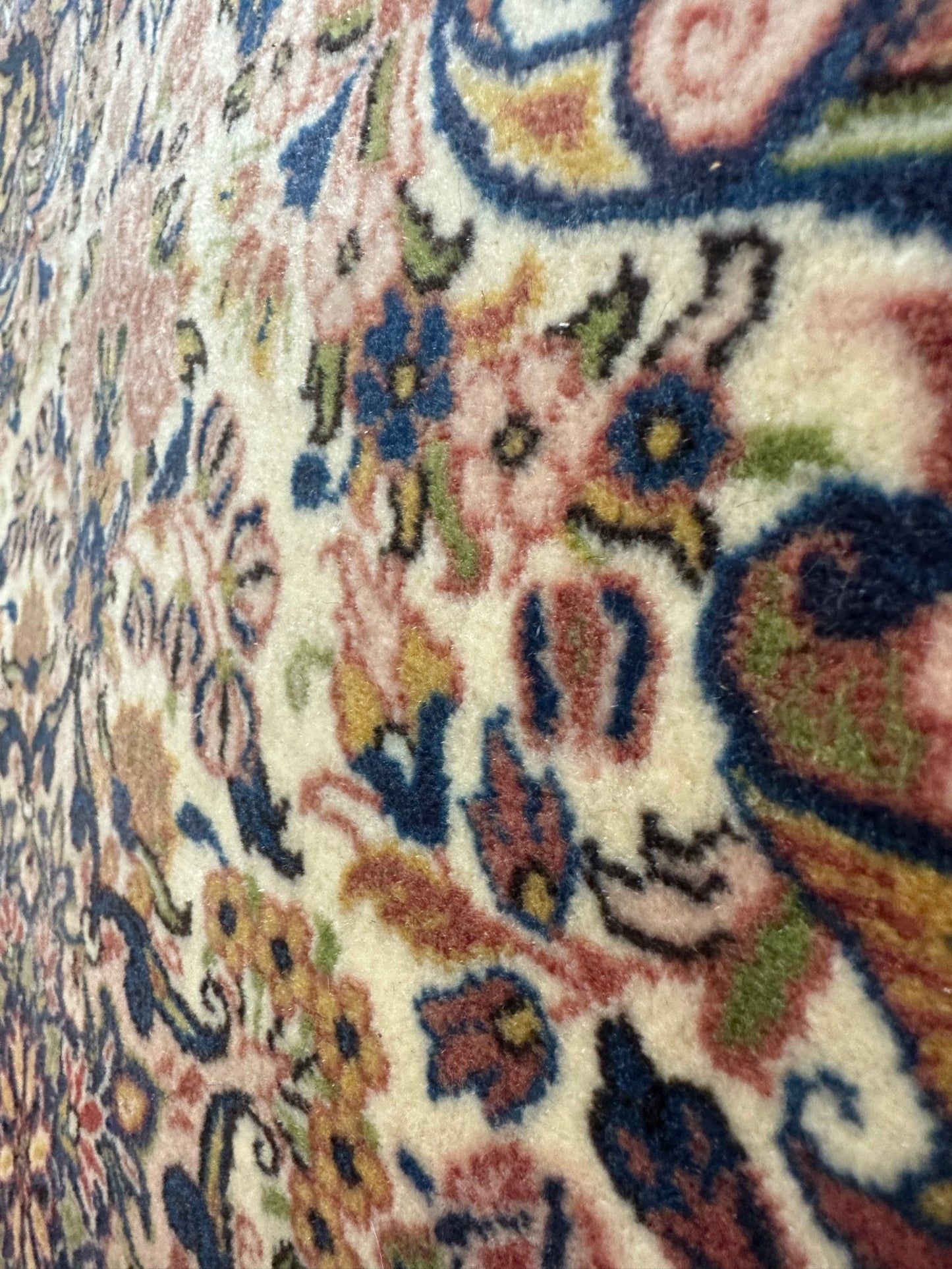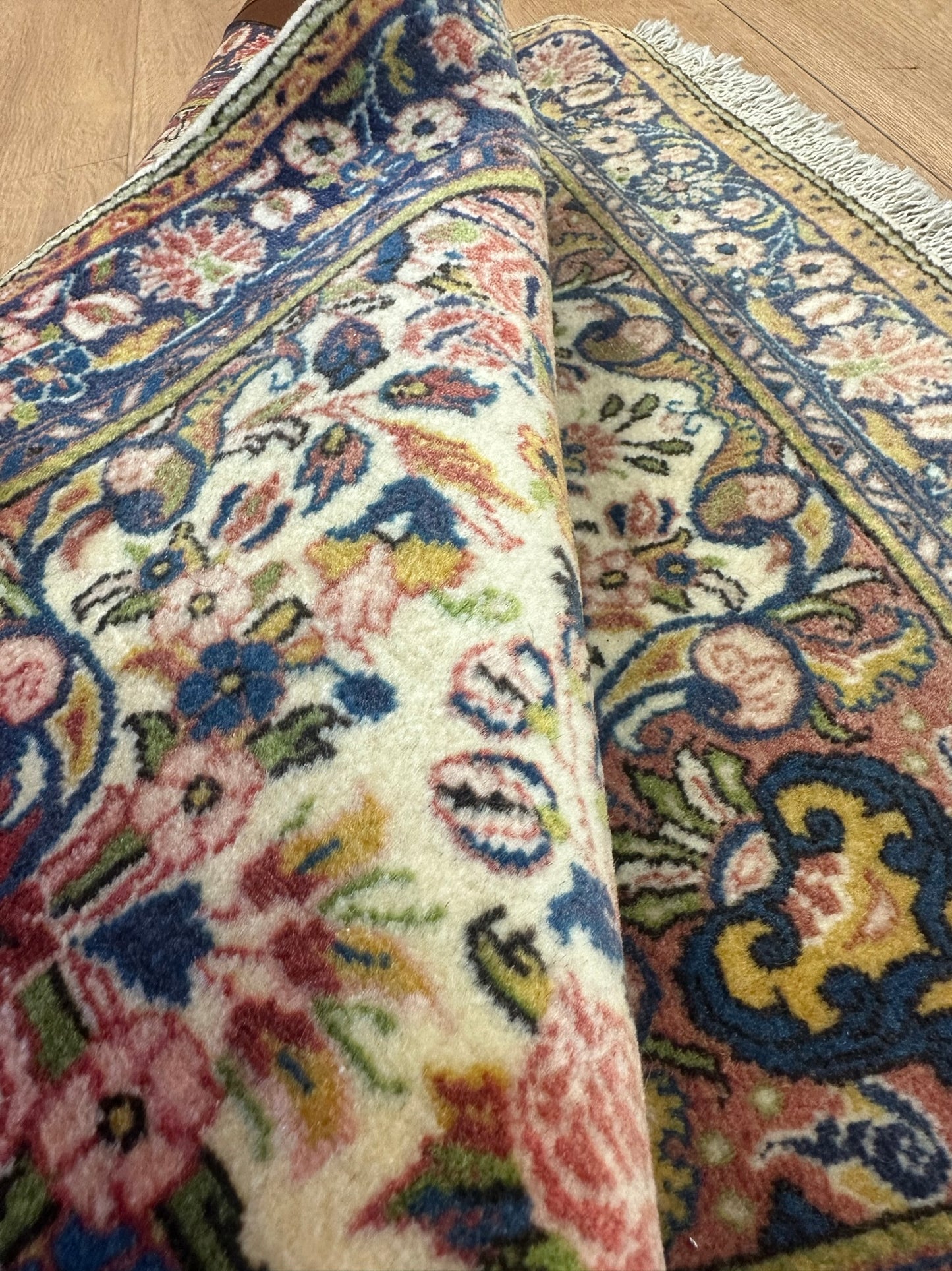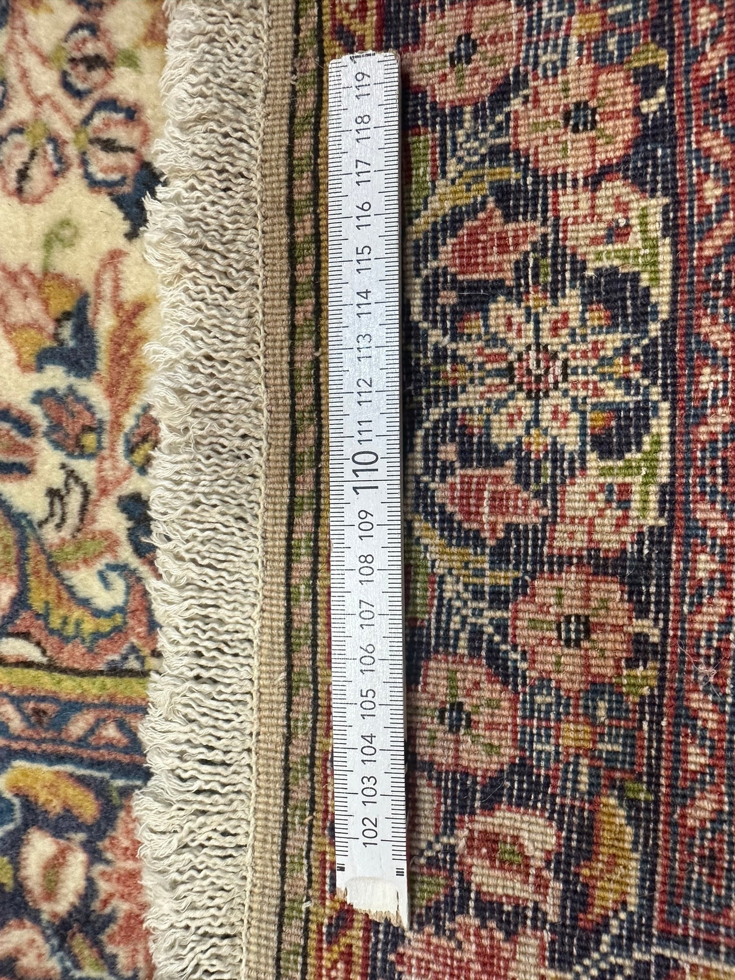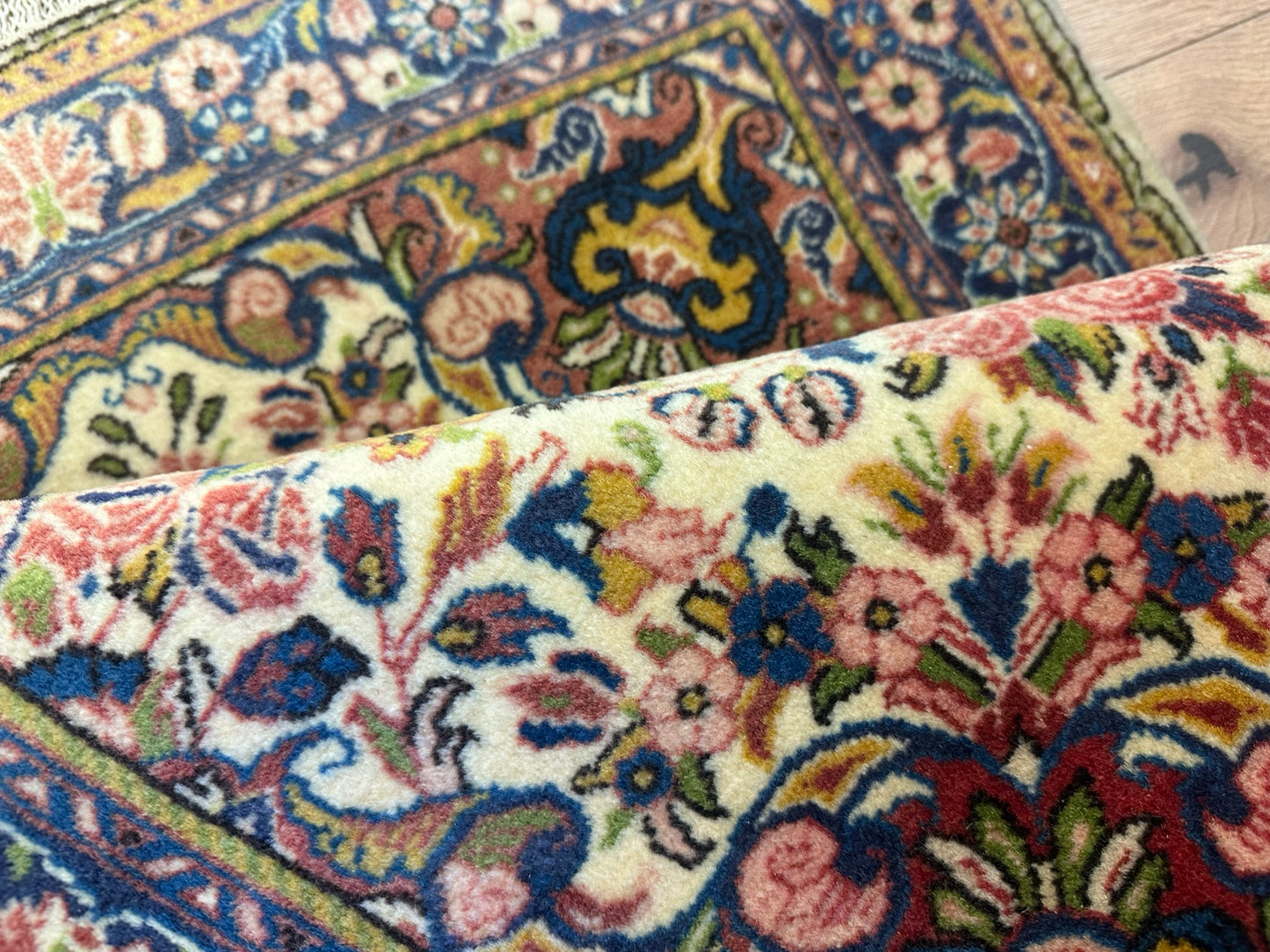 Das Design des Teppichs ist kunstvoll gestaltet und zeigt elaborierte Muster und Ornamente, die die reiche kulturelle Geschichte Persiens widerspiegeln. Die Farben sind lebendig und harmonisch abgestimmt, was den Teppich zu einem Blickfang in jedem Raum macht.