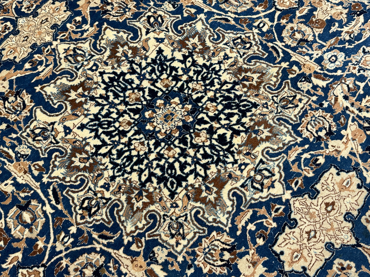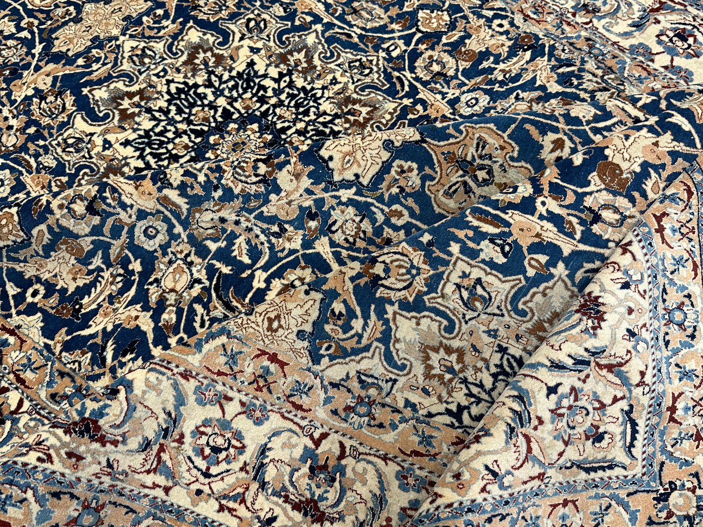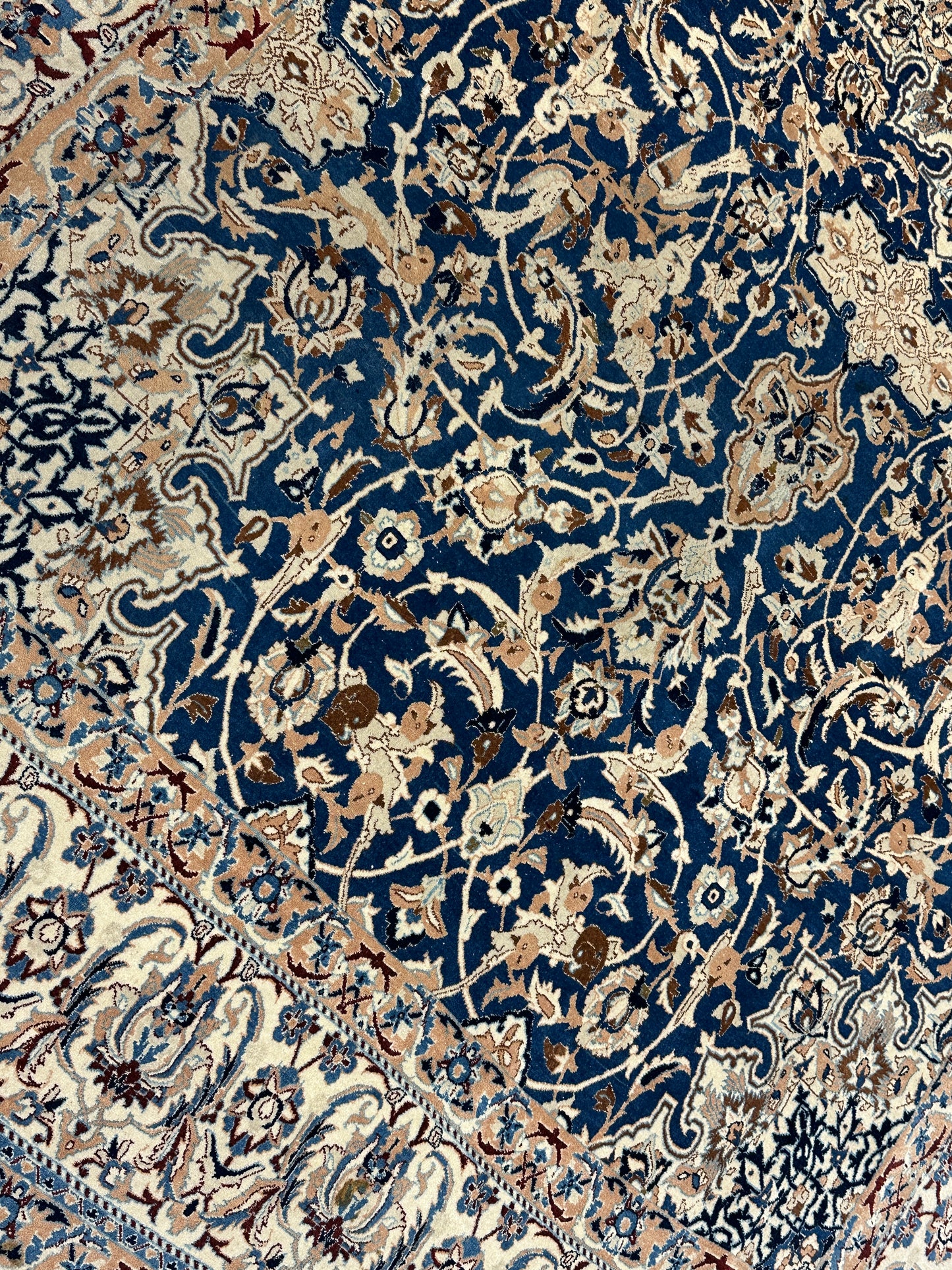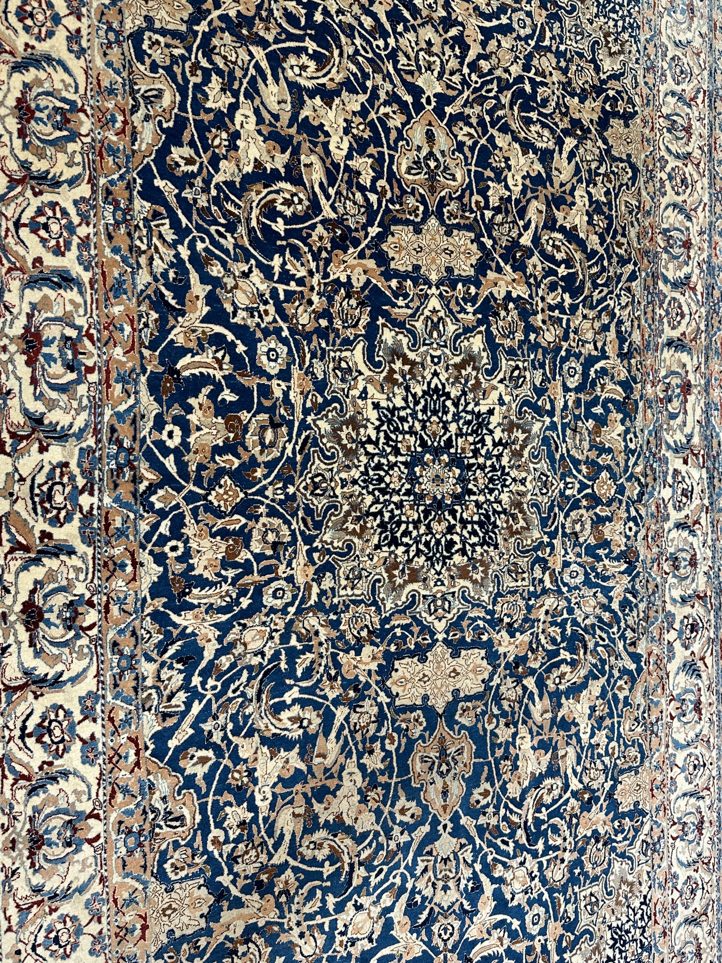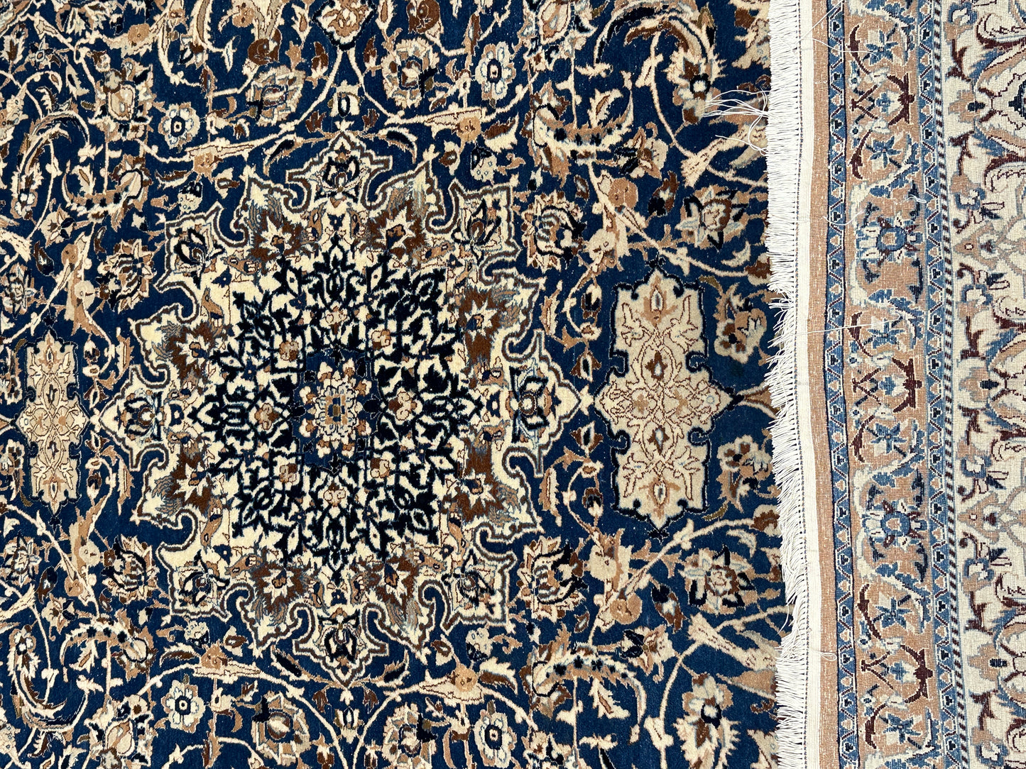 Der Zustand dieses Perserteppichs aus Nain ist gut und gebraucht, was bedeutet, dass er leichte Gebrauchsspuren aufweisen kann, die jedoch seinen Charme und die Authentizität des Teppichs unterstreichen. Dieser Teppich hat bereits eine Geschichte und wird Ihrer Einrichtung eine gewisse Tiefe und Charakter verleihen.