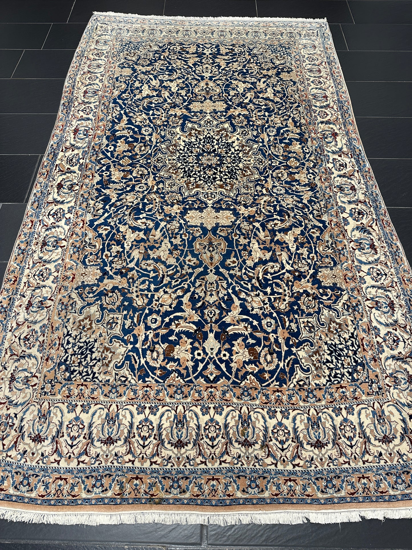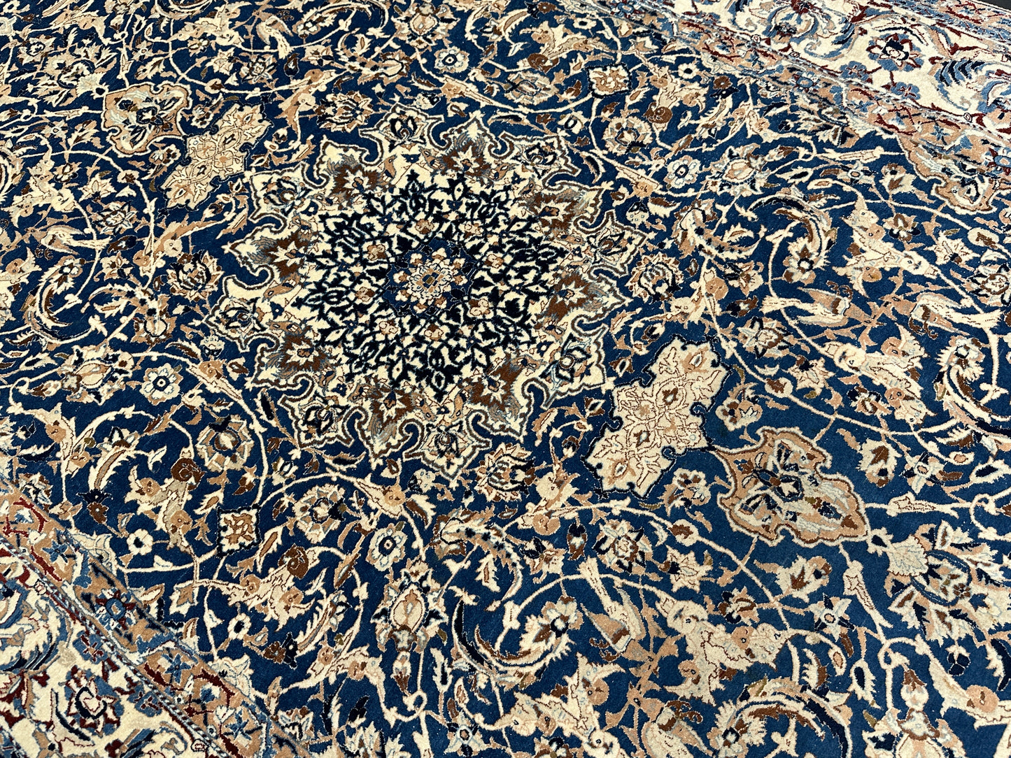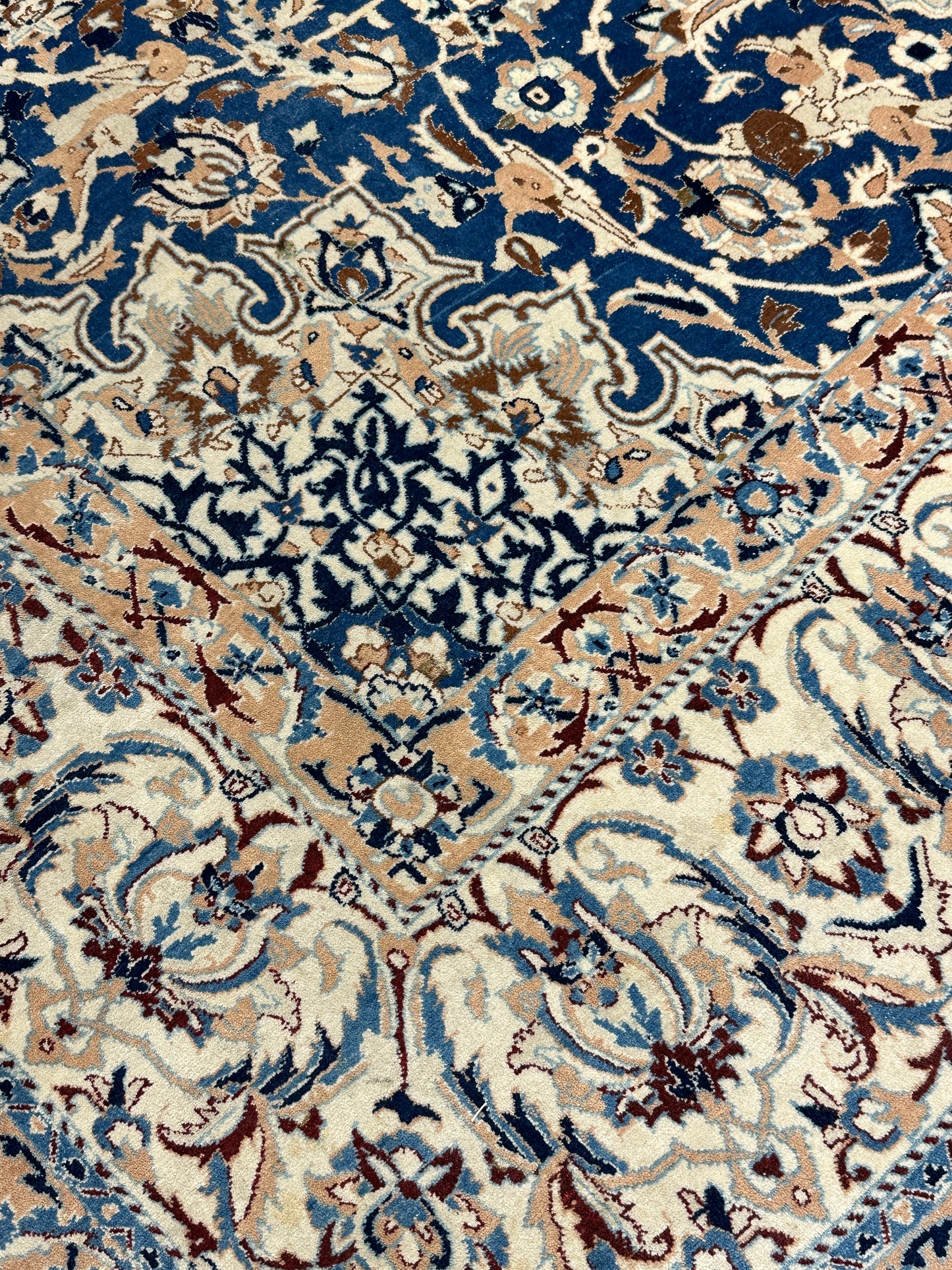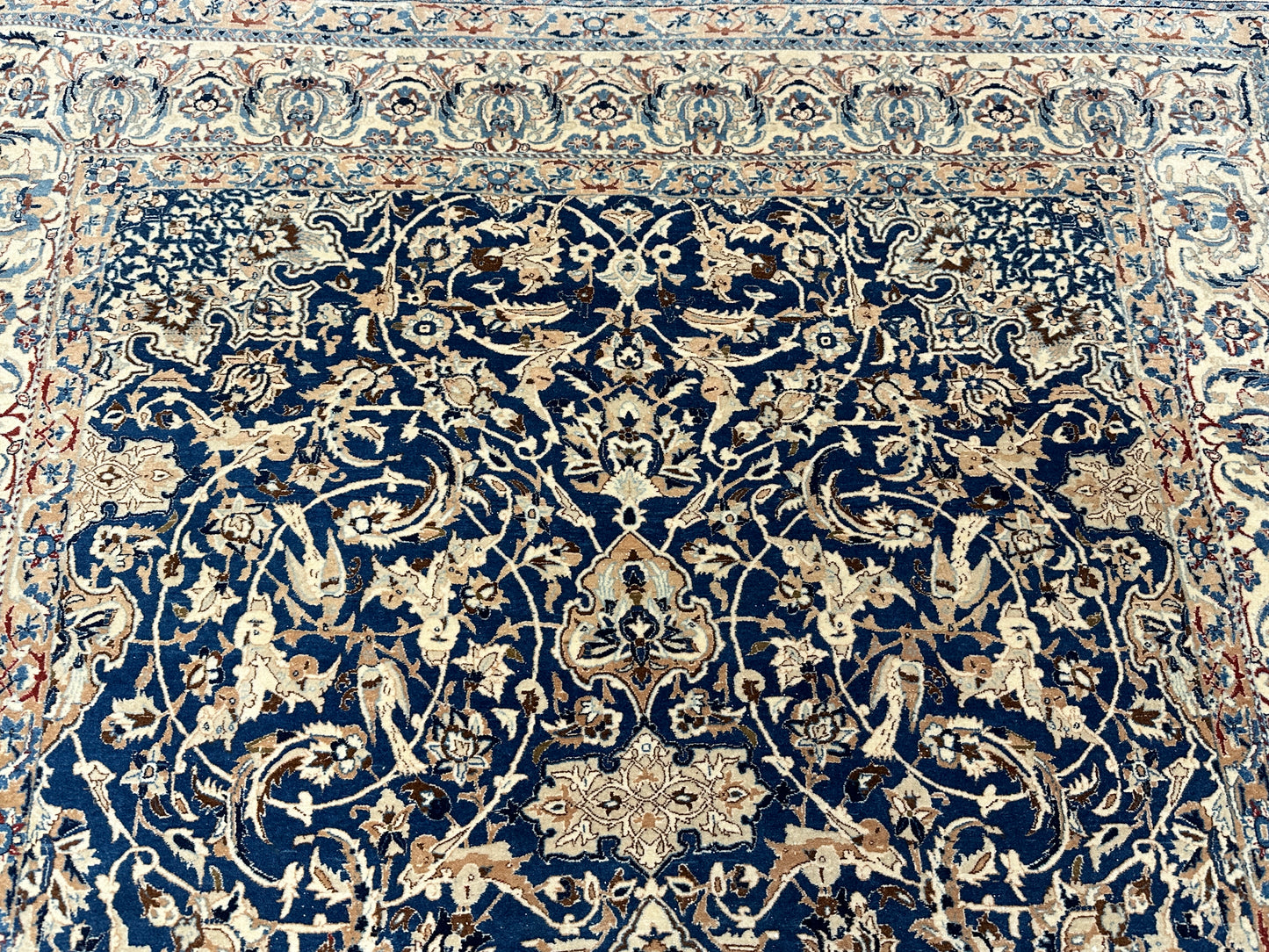 Der Zustand dieses Perserteppichs aus Nain ist gut und gebraucht, was bedeutet, dass er leichte Gebrauchsspuren aufweisen kann, die jedoch seinen Charme und die Authentizität des Teppichs unterstreichen. Dieser Teppich hat bereits eine Geschichte und wird Ihrer Einrichtung eine gewisse Tiefe und Charakter verleihen.