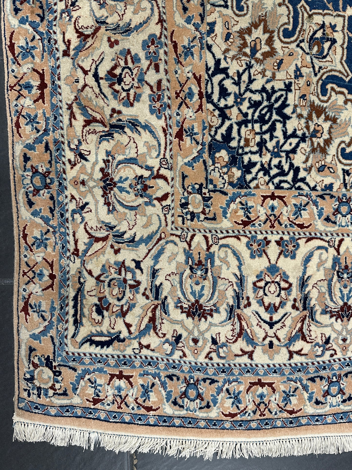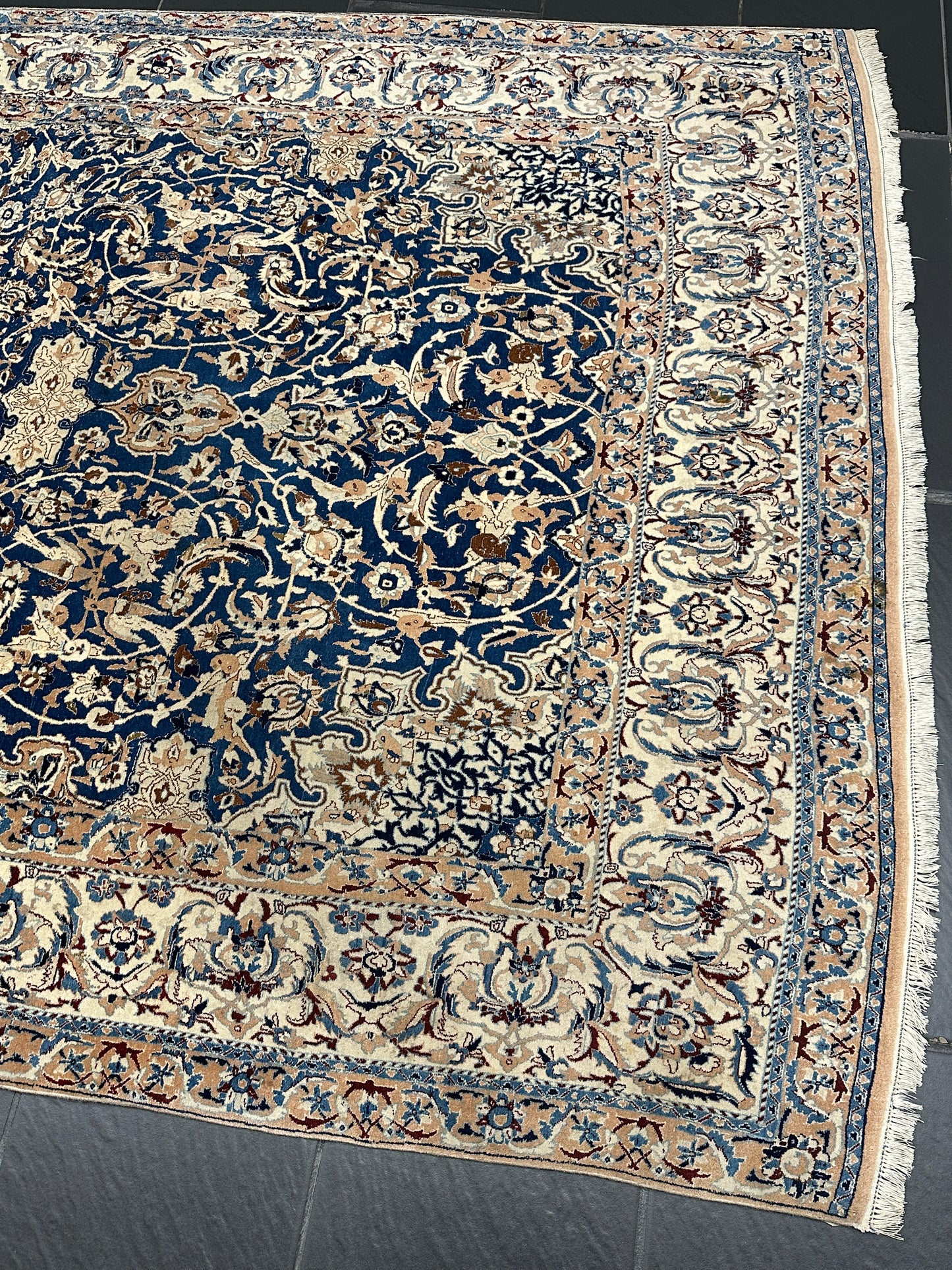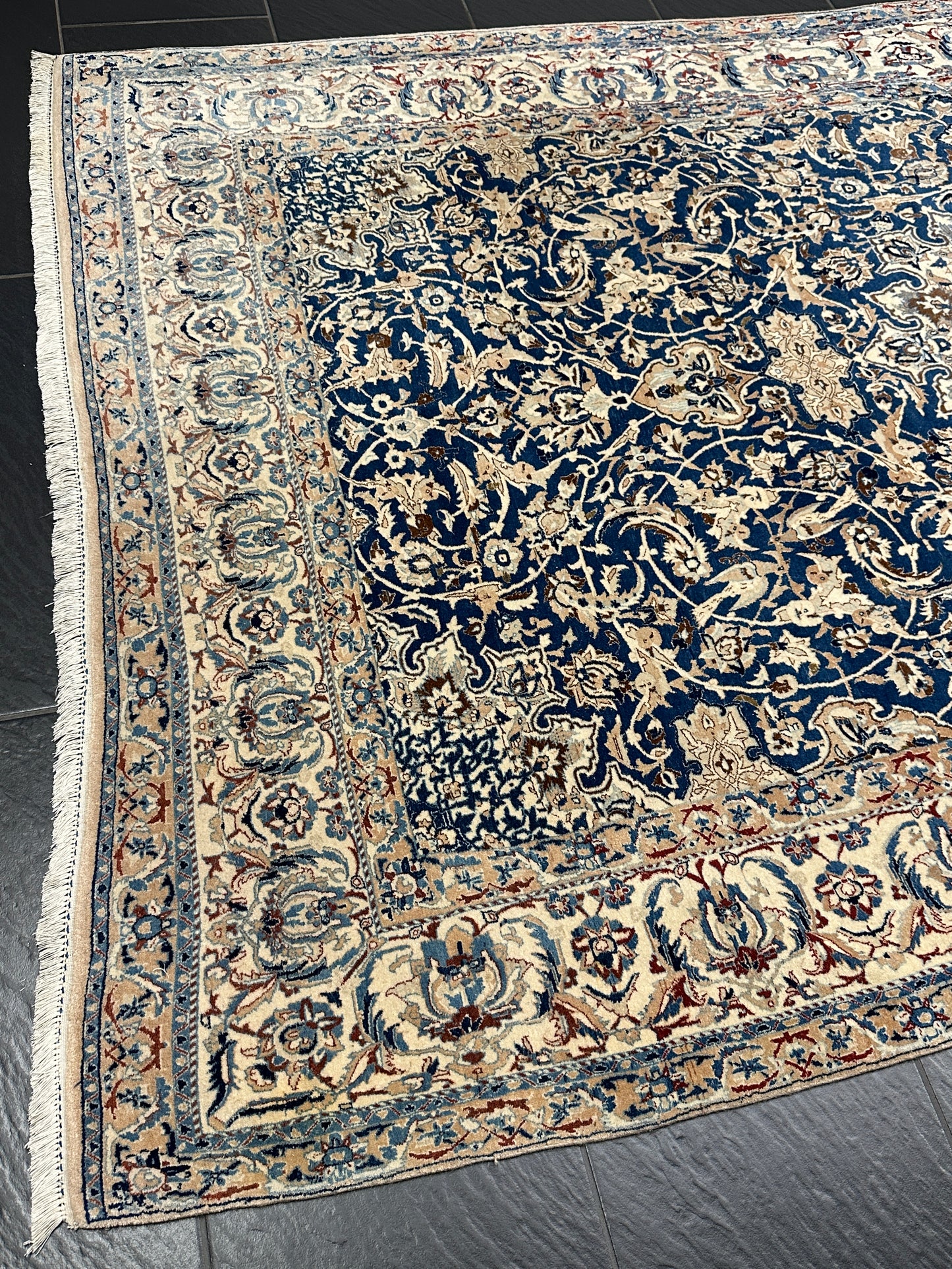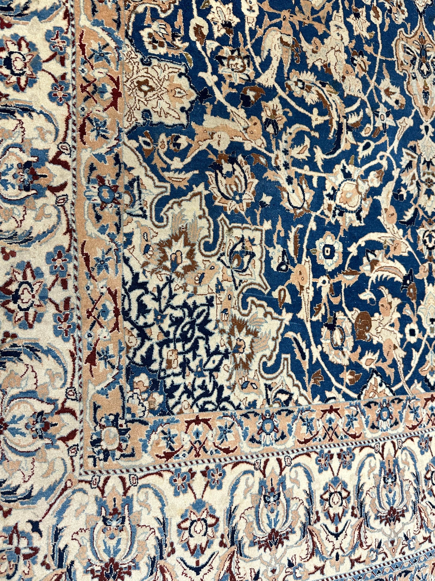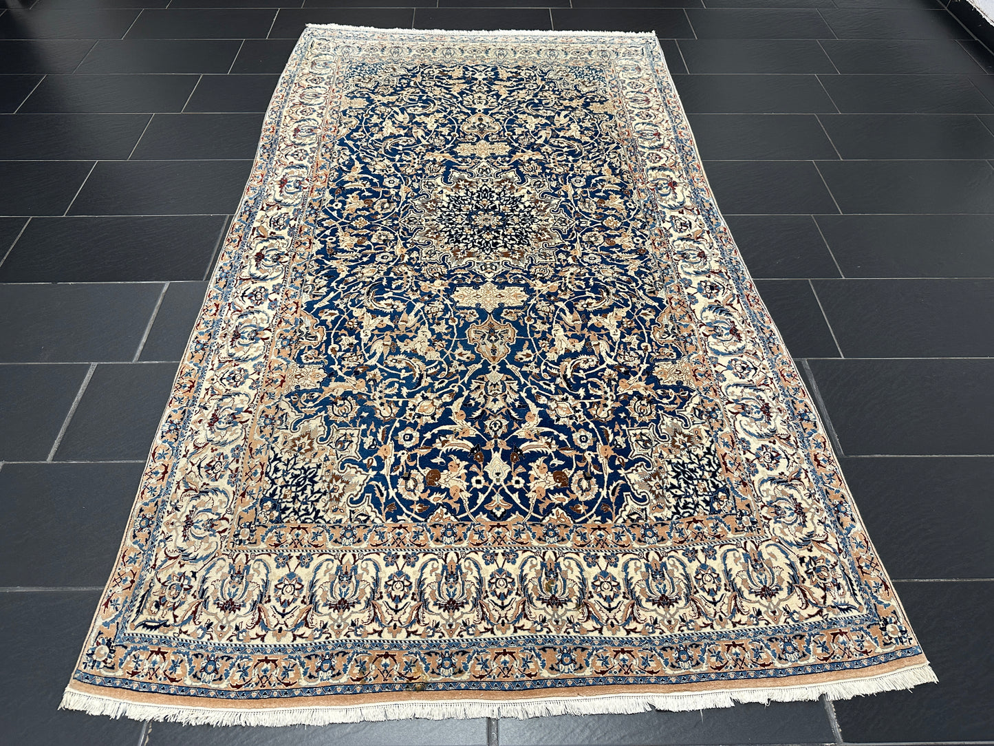 Der Zustand dieses Perserteppichs aus Nain ist gut und gebraucht, was bedeutet, dass er leichte Gebrauchsspuren aufweisen kann, die jedoch seinen Charme und die Authentizität des Teppichs unterstreichen. Dieser Teppich hat bereits eine Geschichte und wird Ihrer Einrichtung eine gewisse Tiefe und Charakter verleihen.
