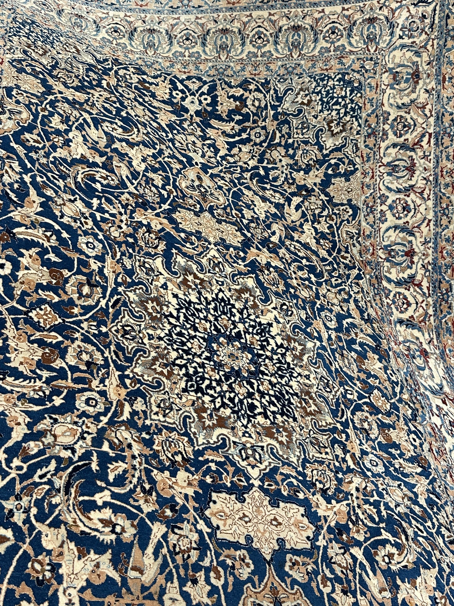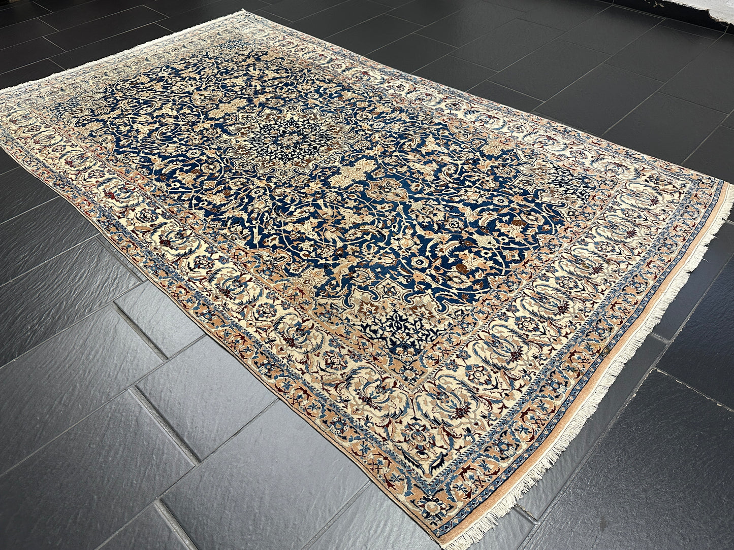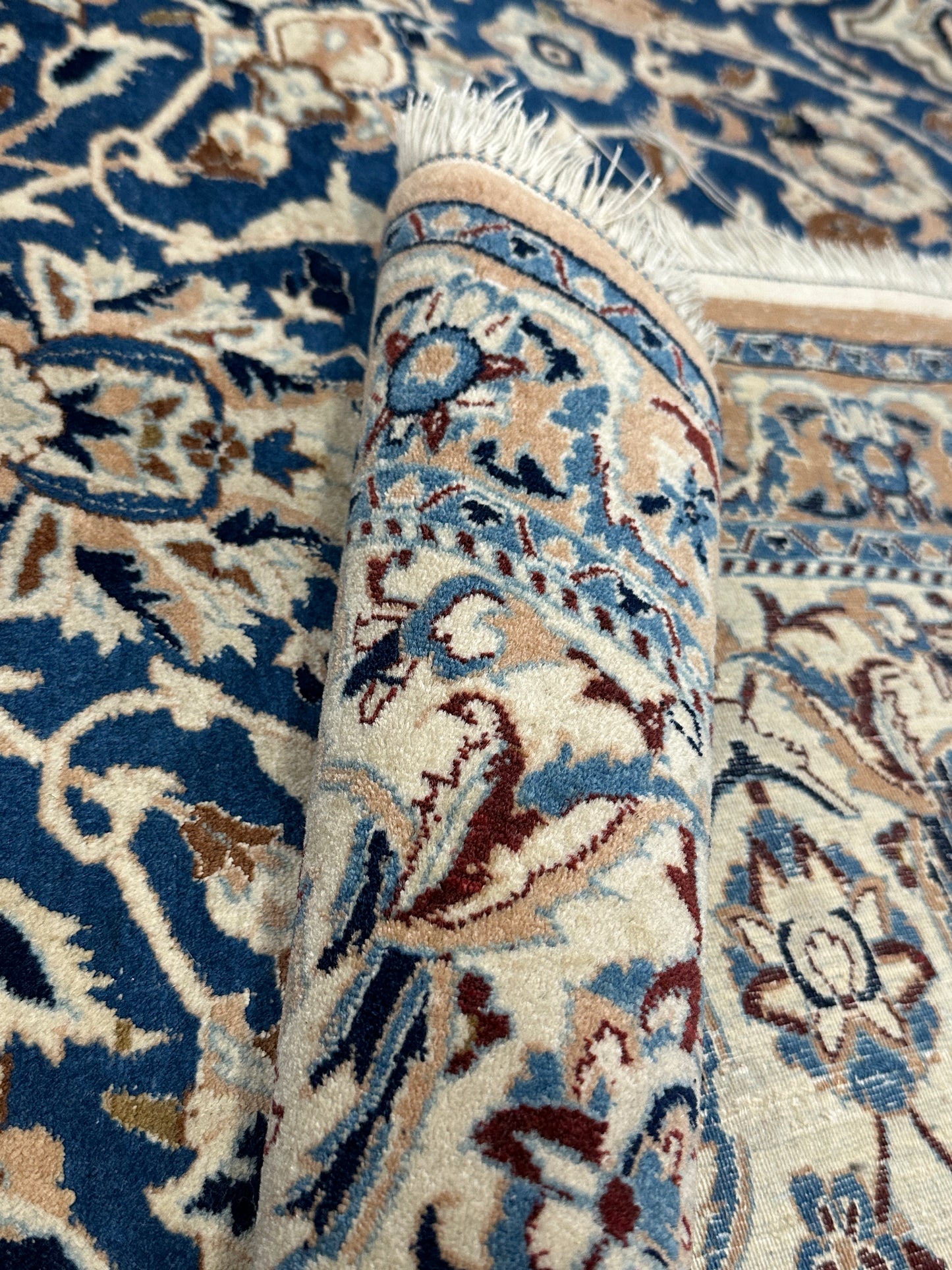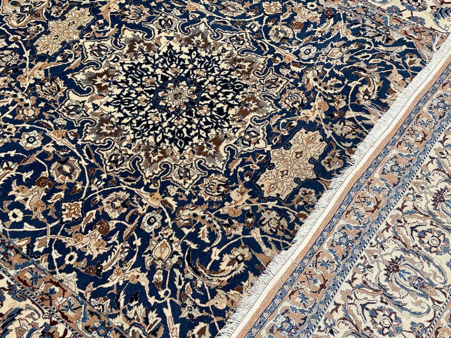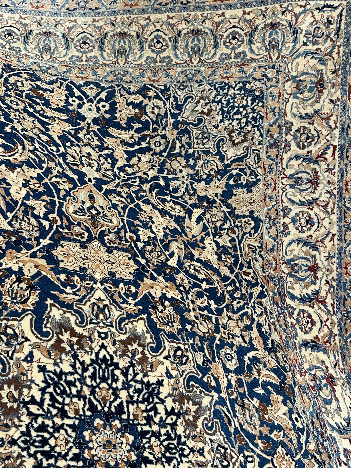 Der Zustand dieses Perserteppichs aus Nain ist gut und gebraucht, was bedeutet, dass er leichte Gebrauchsspuren aufweisen kann, die jedoch seinen Charme und die Authentizität des Teppichs unterstreichen. Dieser Teppich hat bereits eine Geschichte und wird Ihrer Einrichtung eine gewisse Tiefe und Charakter verleihen.