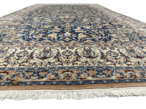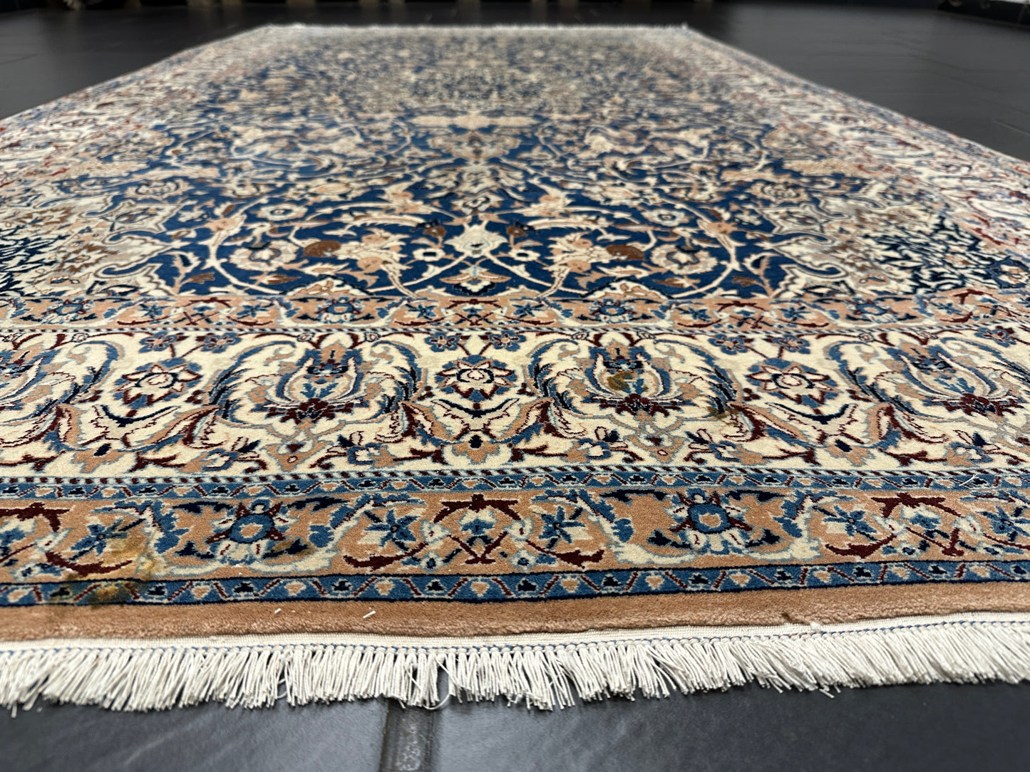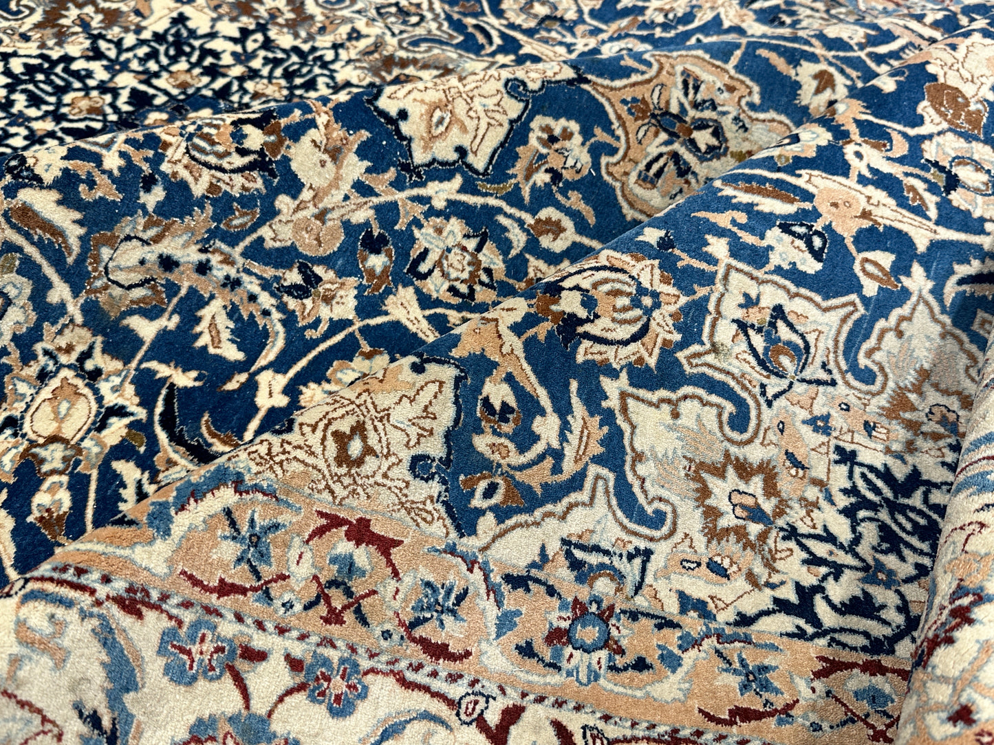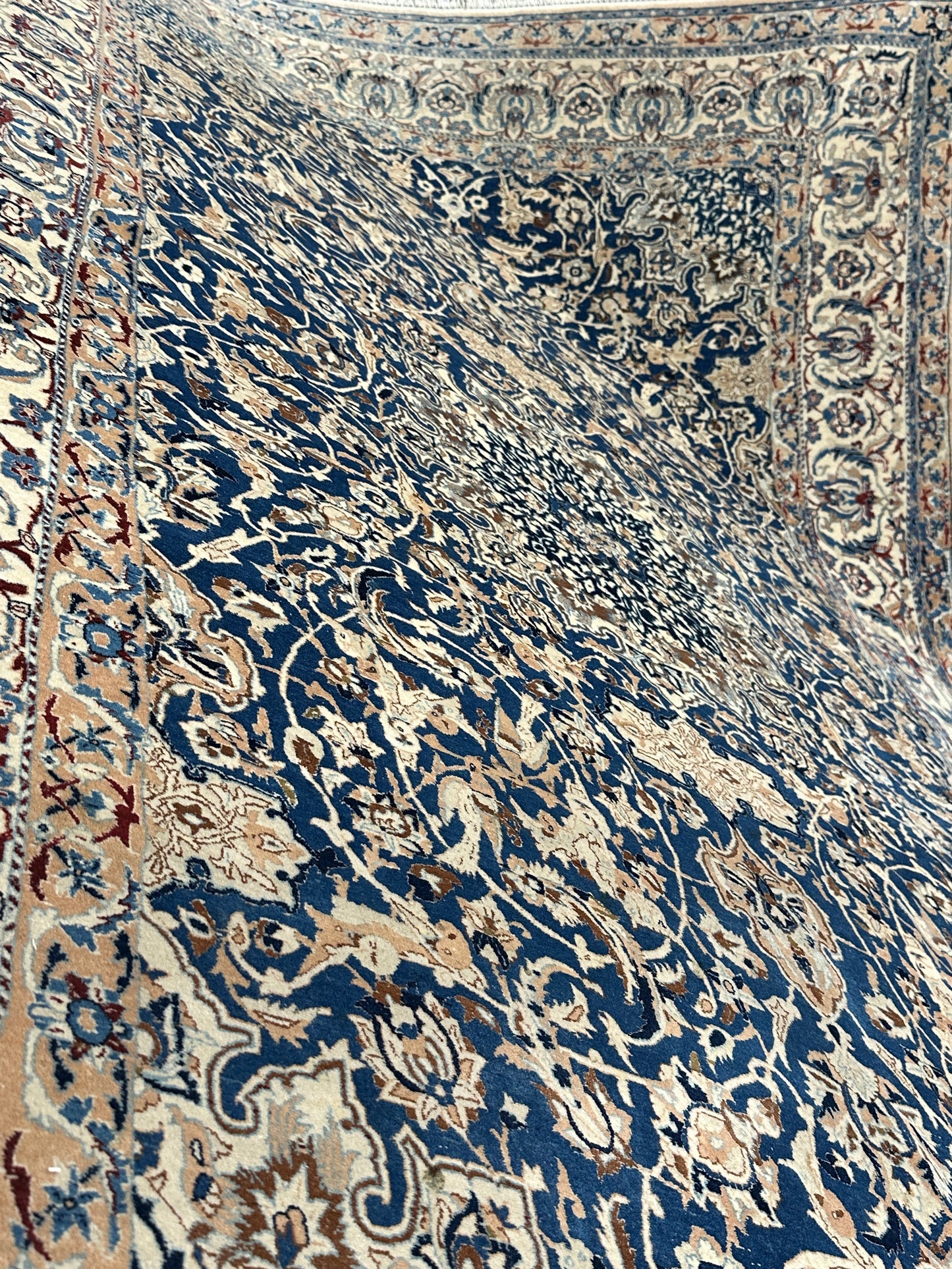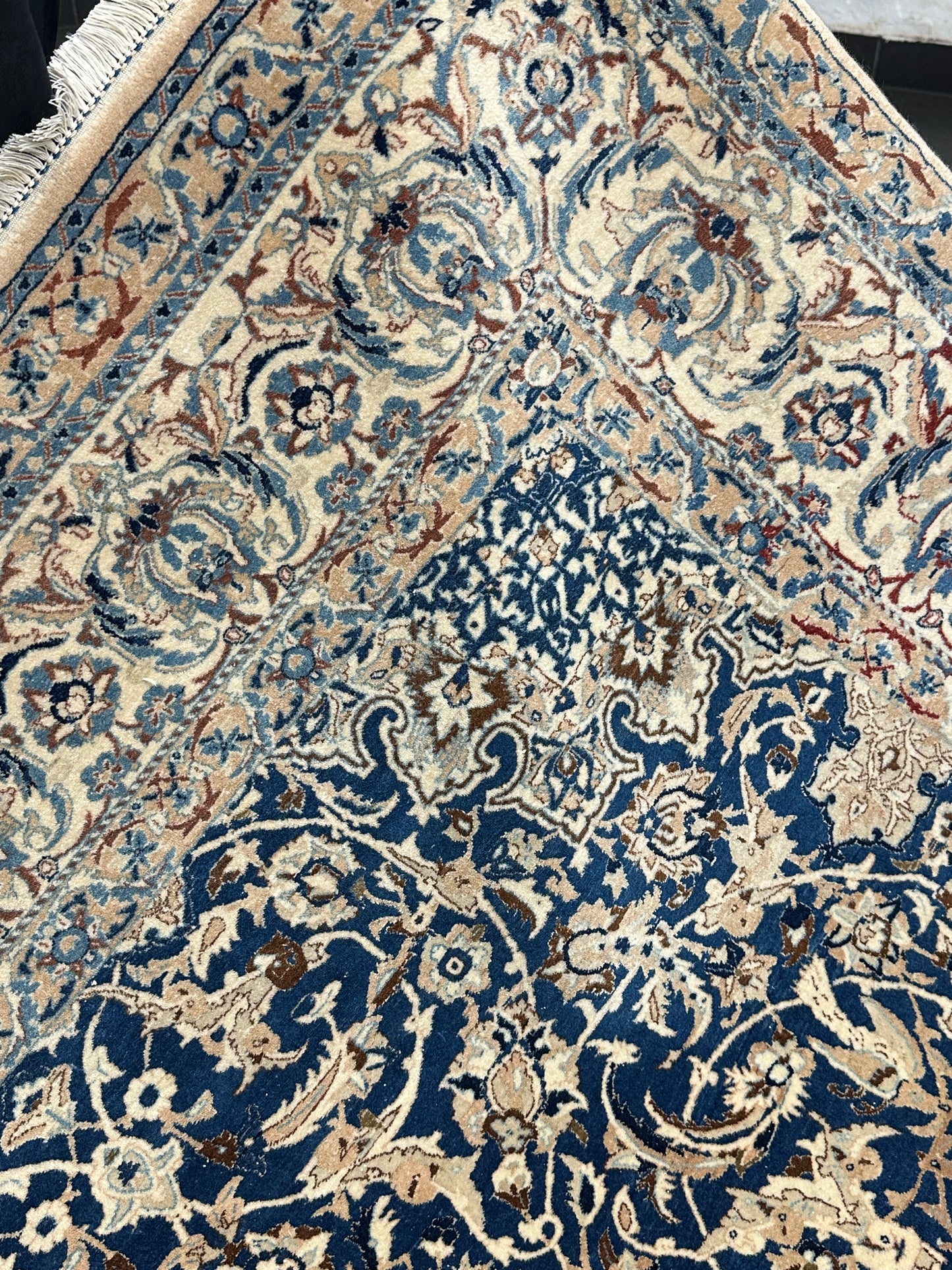 Der Zustand dieses Perserteppichs aus Nain ist gut und gebraucht, was bedeutet, dass er leichte Gebrauchsspuren aufweisen kann, die jedoch seinen Charme und die Authentizität des Teppichs unterstreichen. Dieser Teppich hat bereits eine Geschichte und wird Ihrer Einrichtung eine gewisse Tiefe und Charakter verleihen.