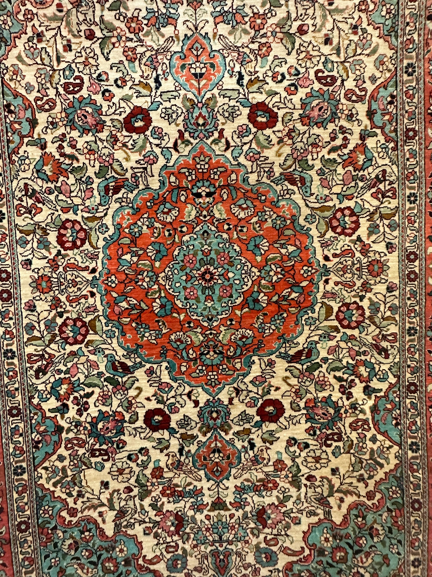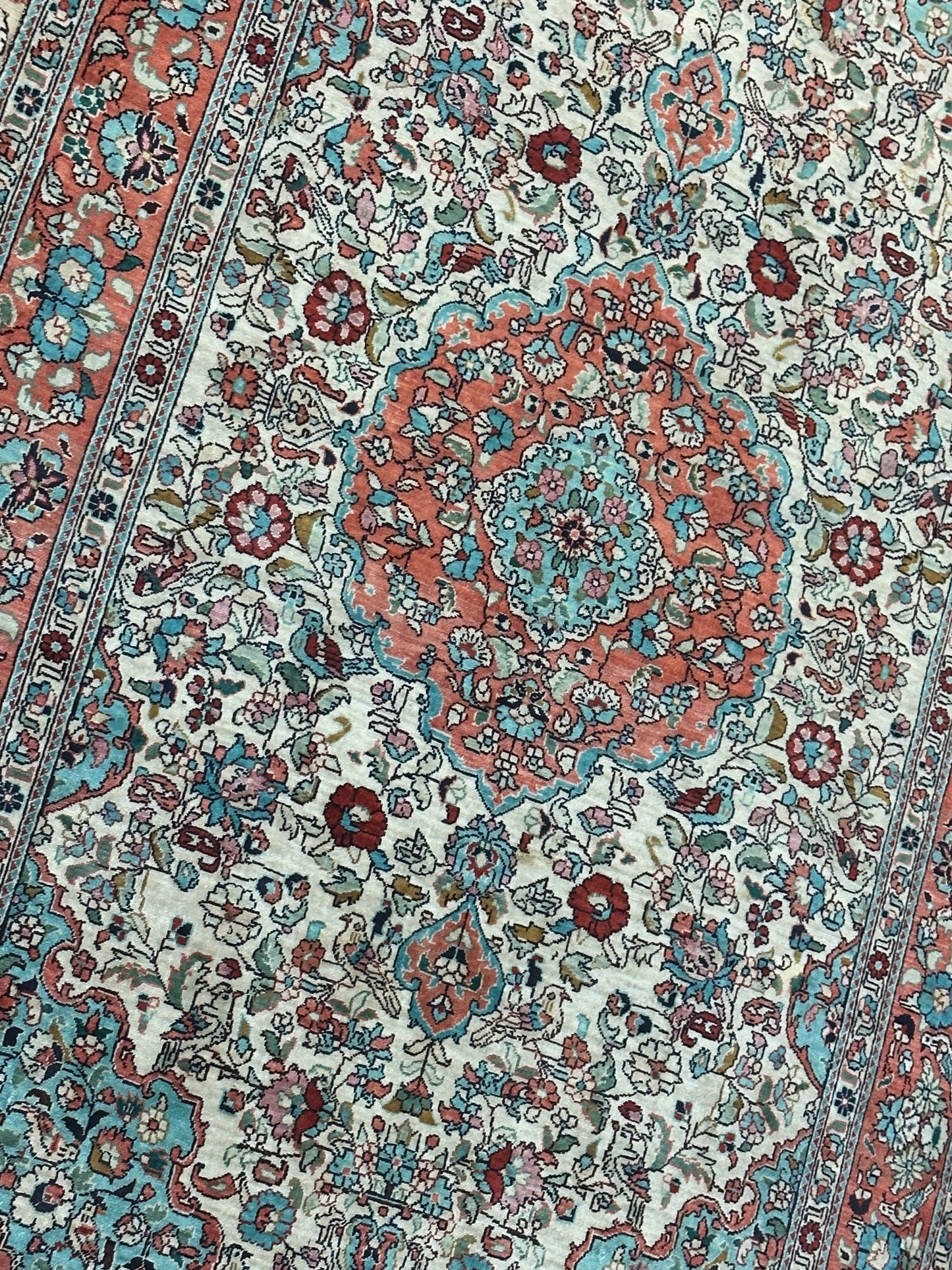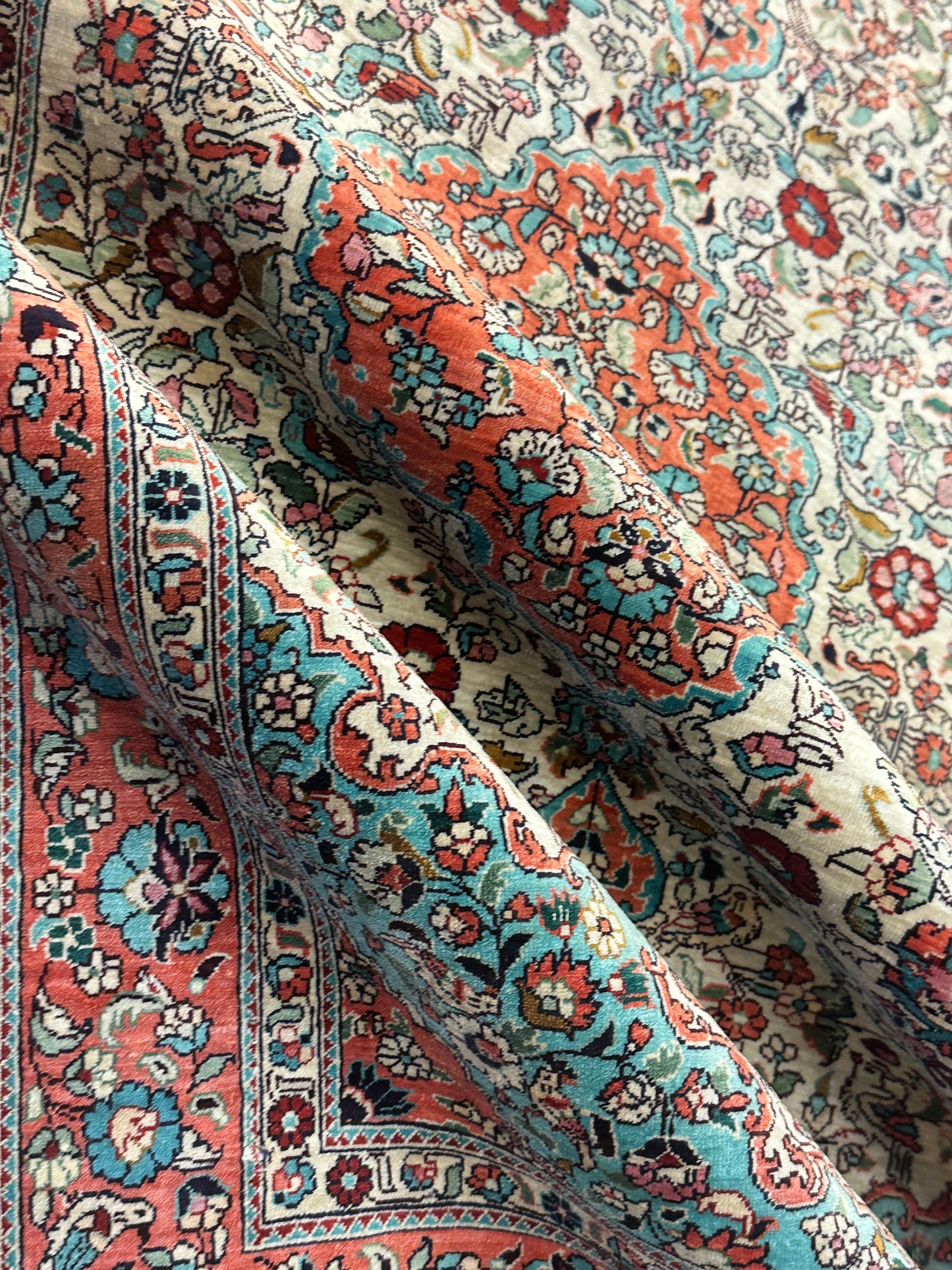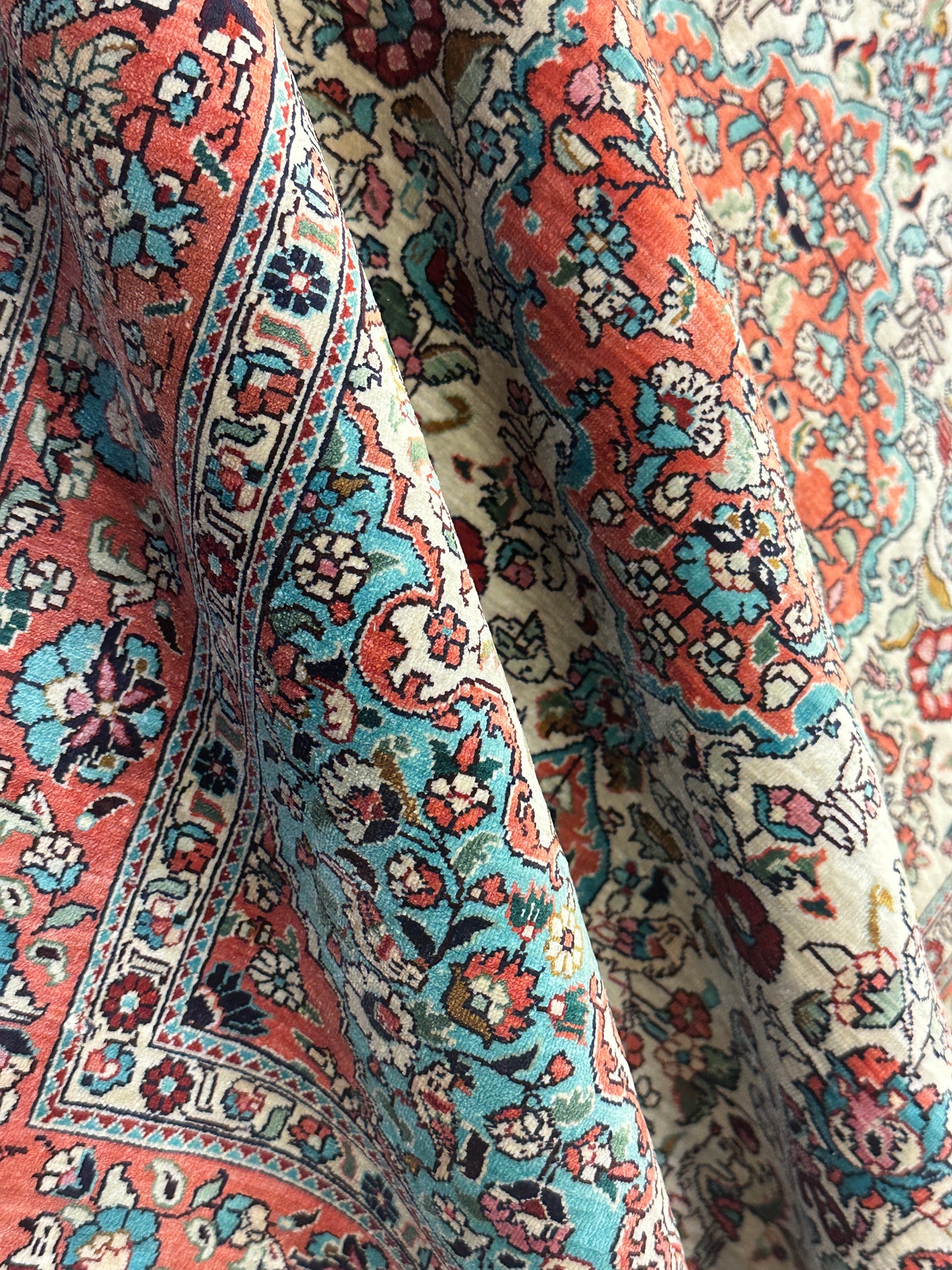 • Seidenmaterial: Die Verwendung von Seide in der Herstellung verleiht dem Teppich einen seidigen Glanz, eine luxuriöse Textur und eine bemerkenswerte Haltbarkeit.