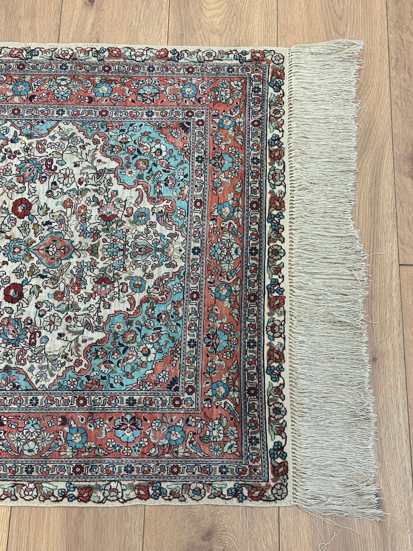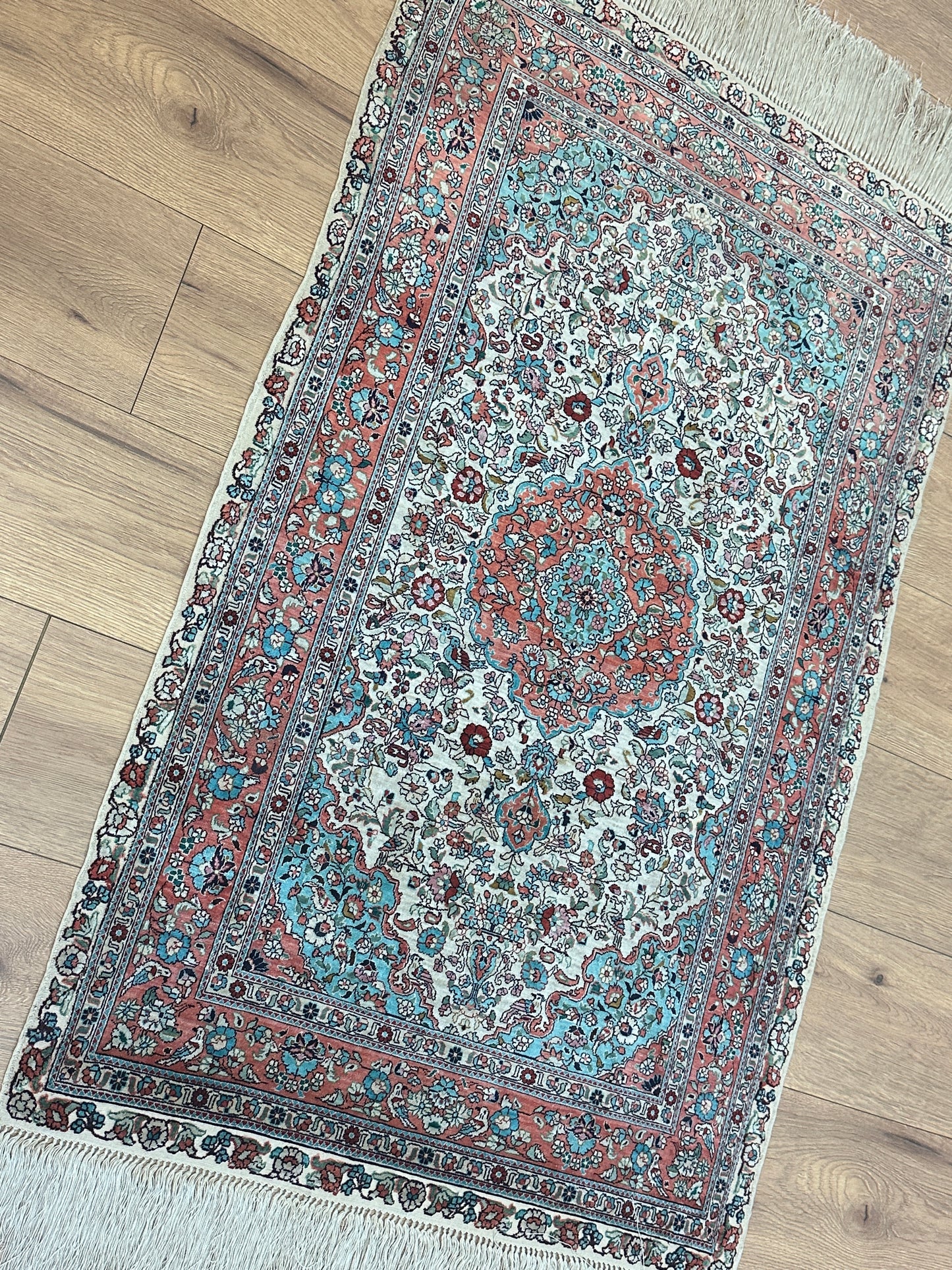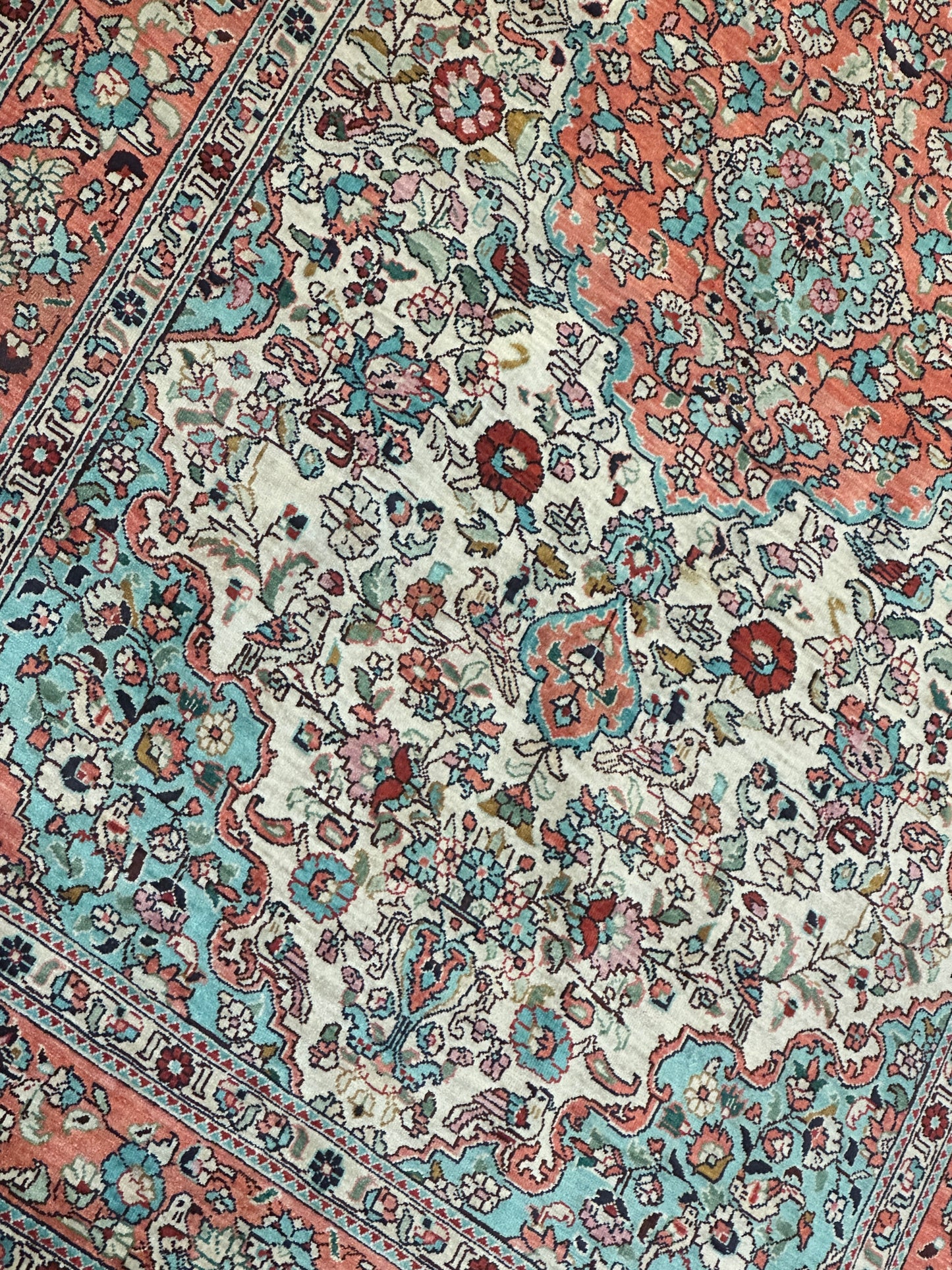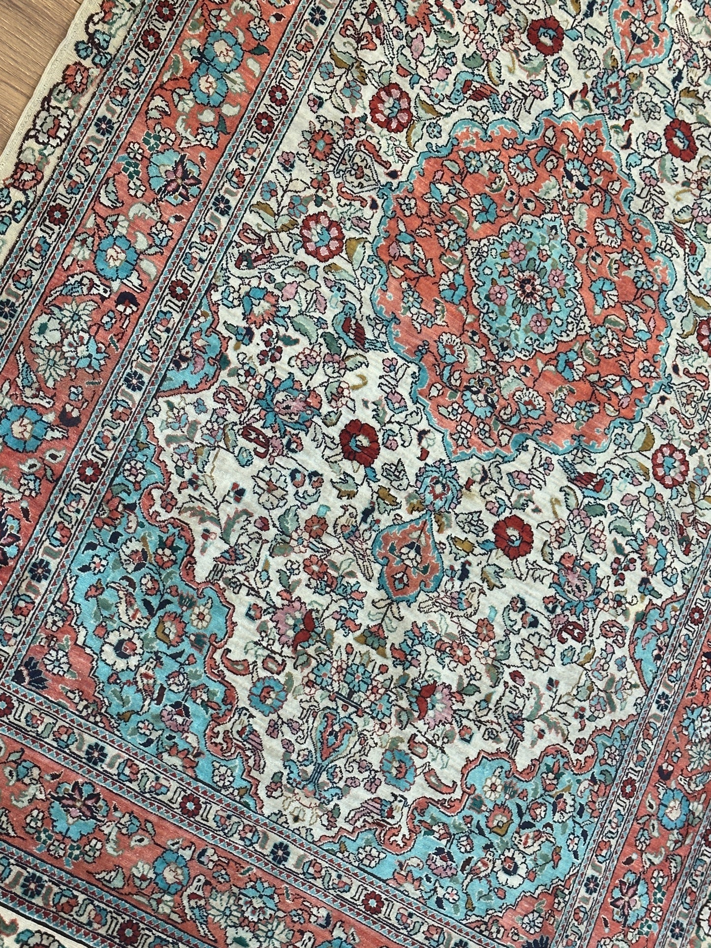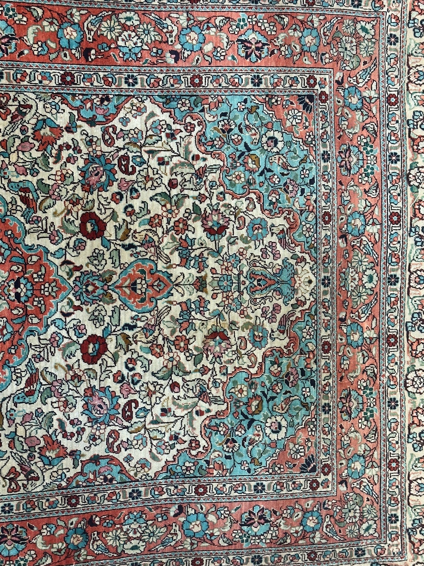 • Seidenmaterial: Die Verwendung von Seide in der Herstellung verleiht dem Teppich einen seidigen Glanz, eine luxuriöse Textur und eine bemerkenswerte Haltbarkeit.