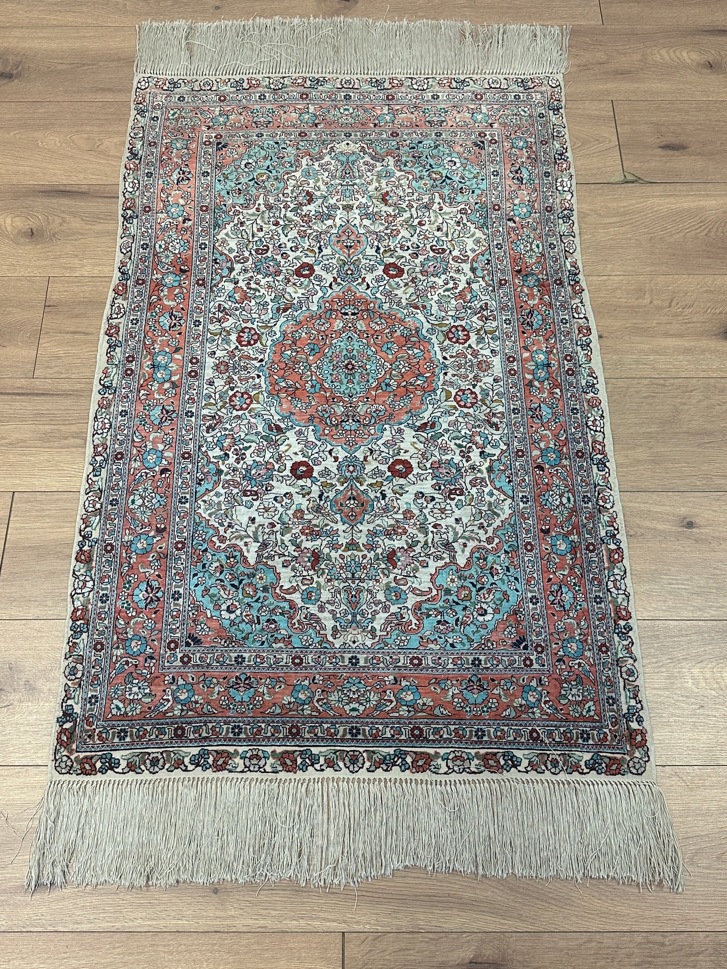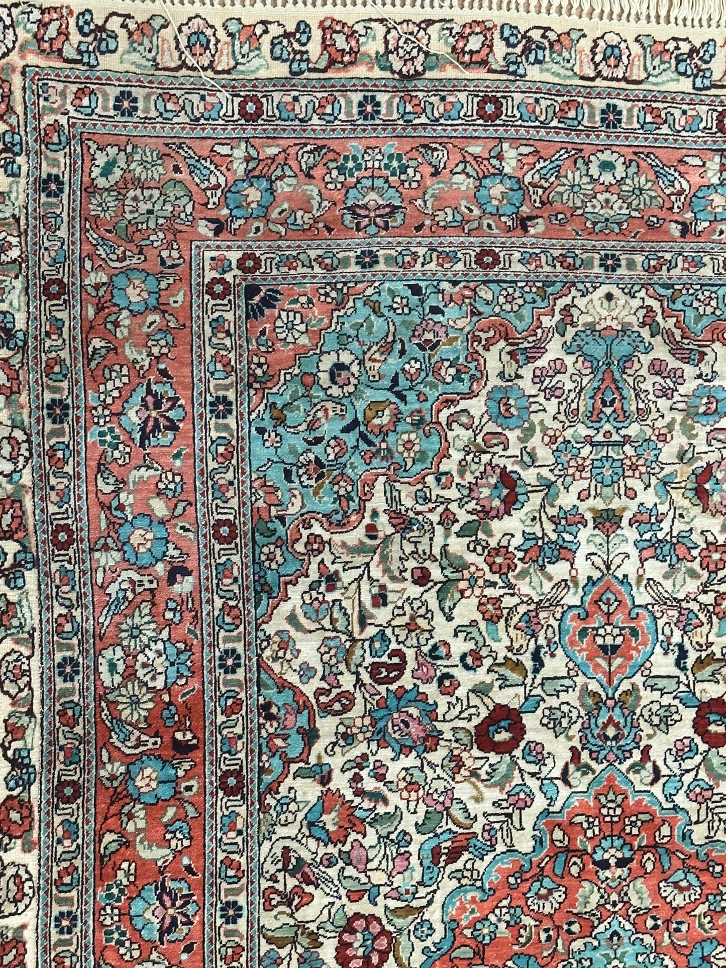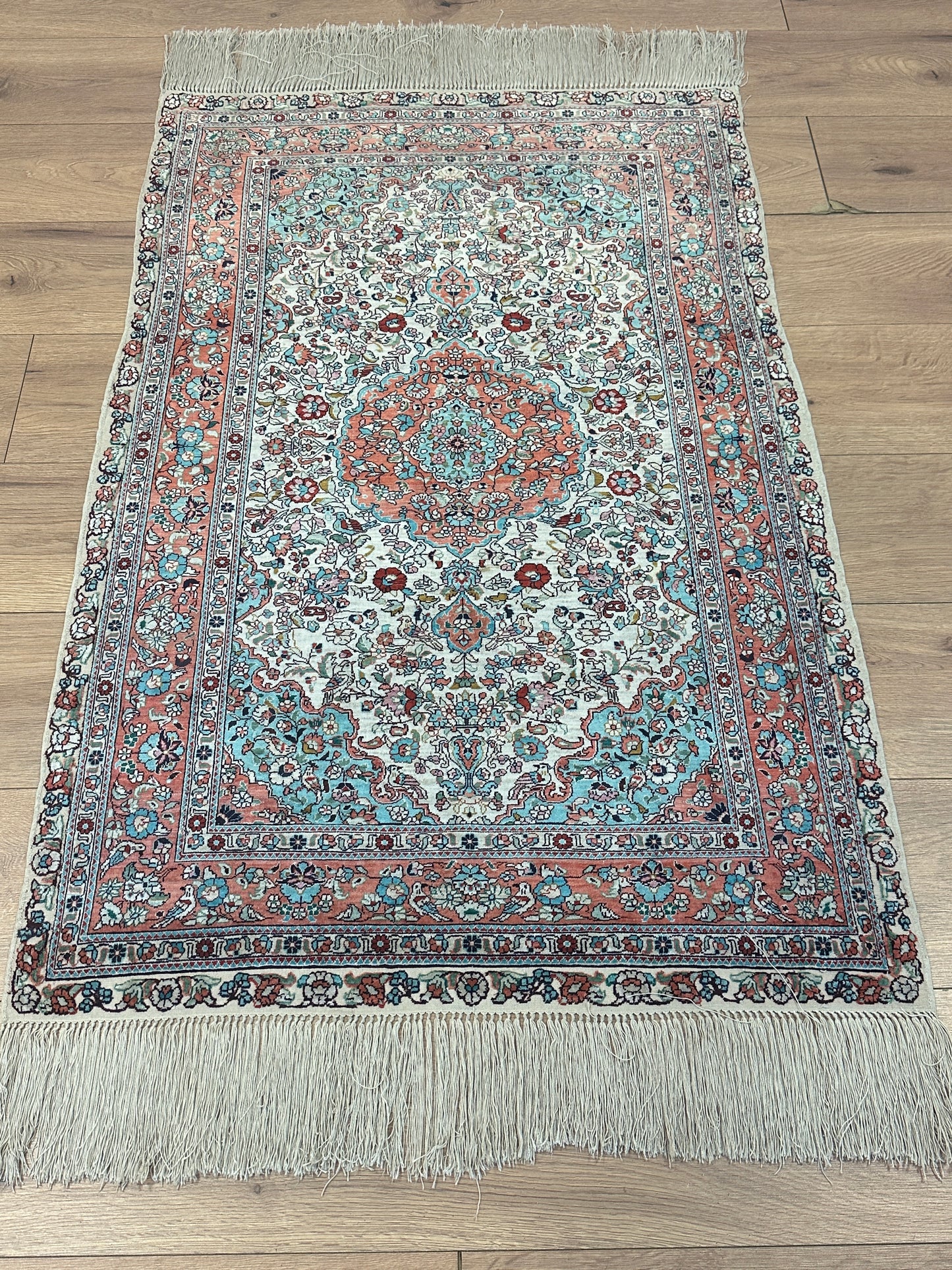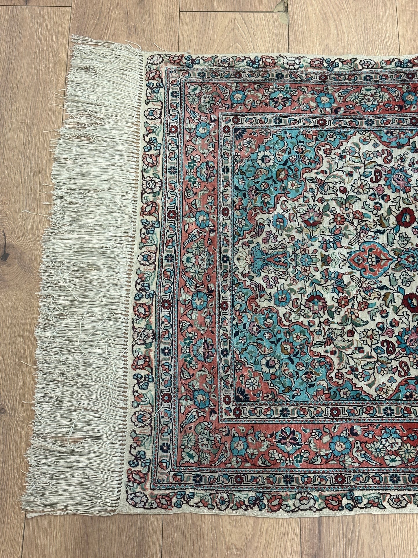 • Seidenmaterial: Die Verwendung von Seide in der Herstellung verleiht dem Teppich einen seidigen Glanz, eine luxuriöse Textur und eine bemerkenswerte Haltbarkeit.