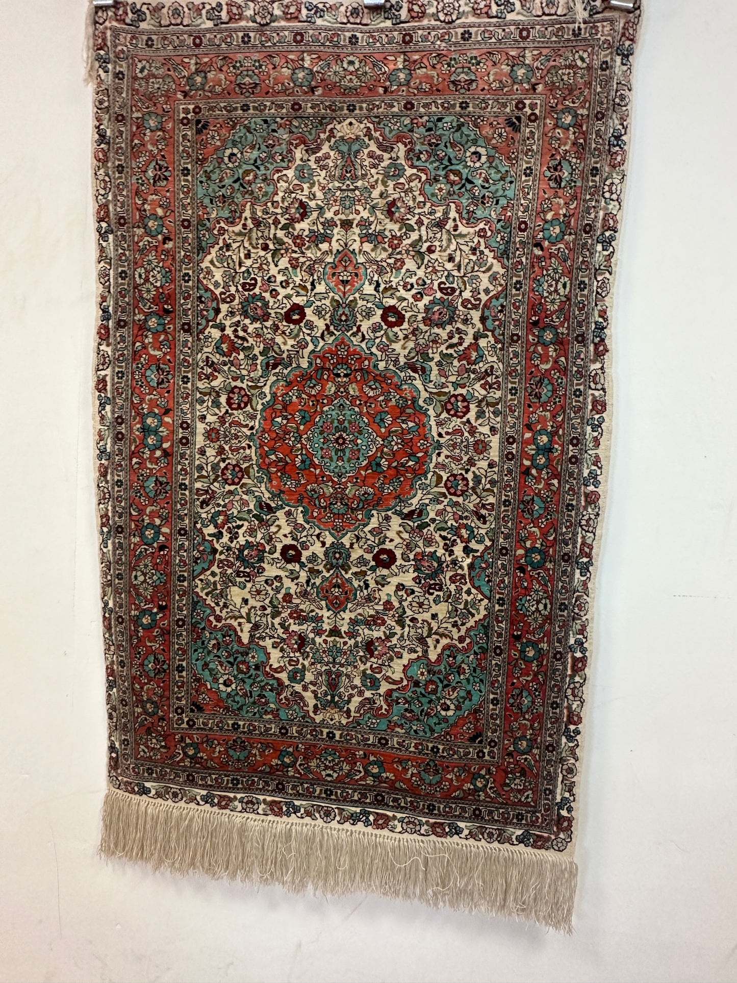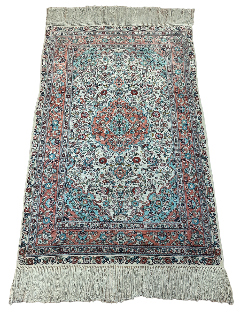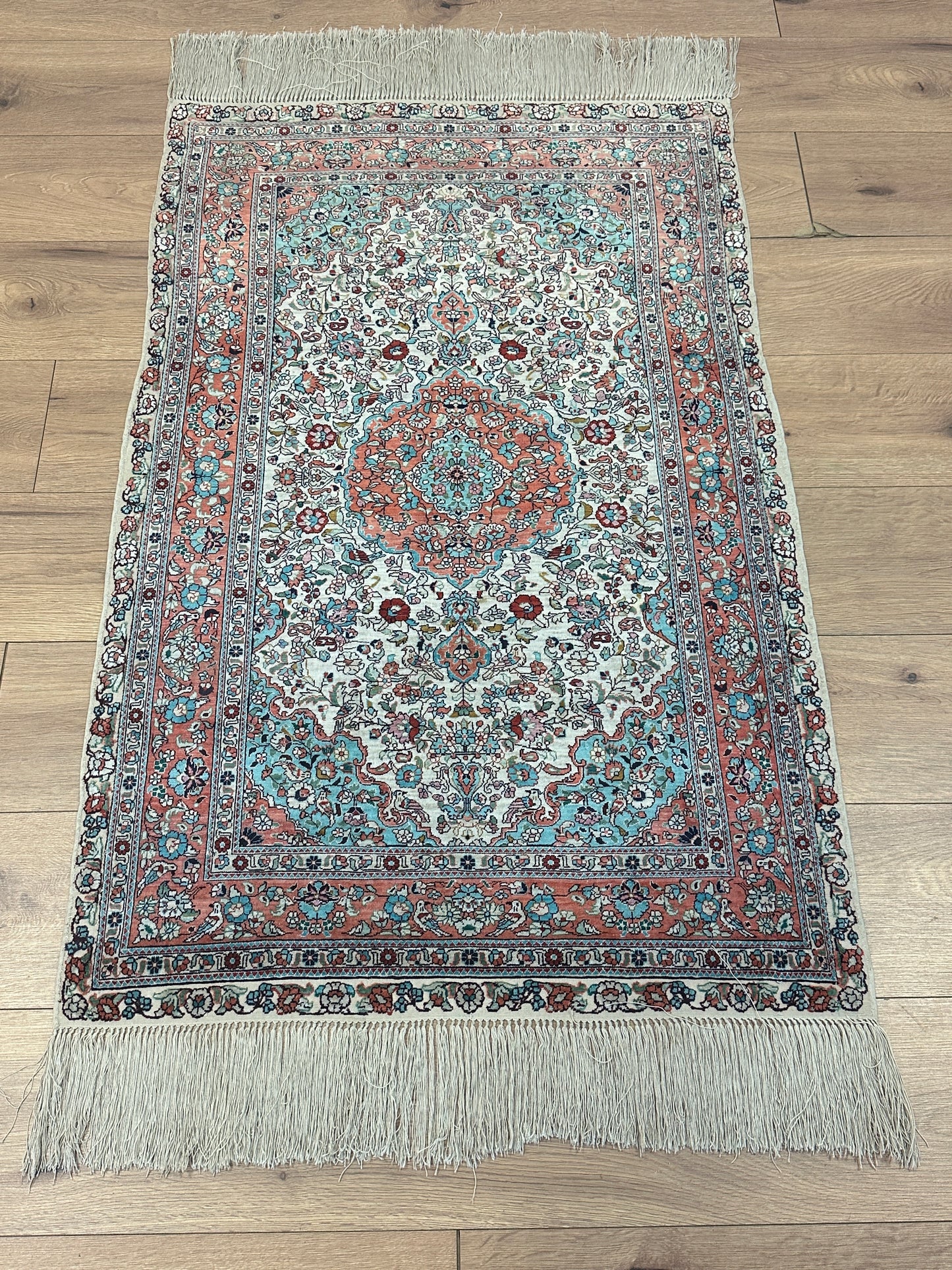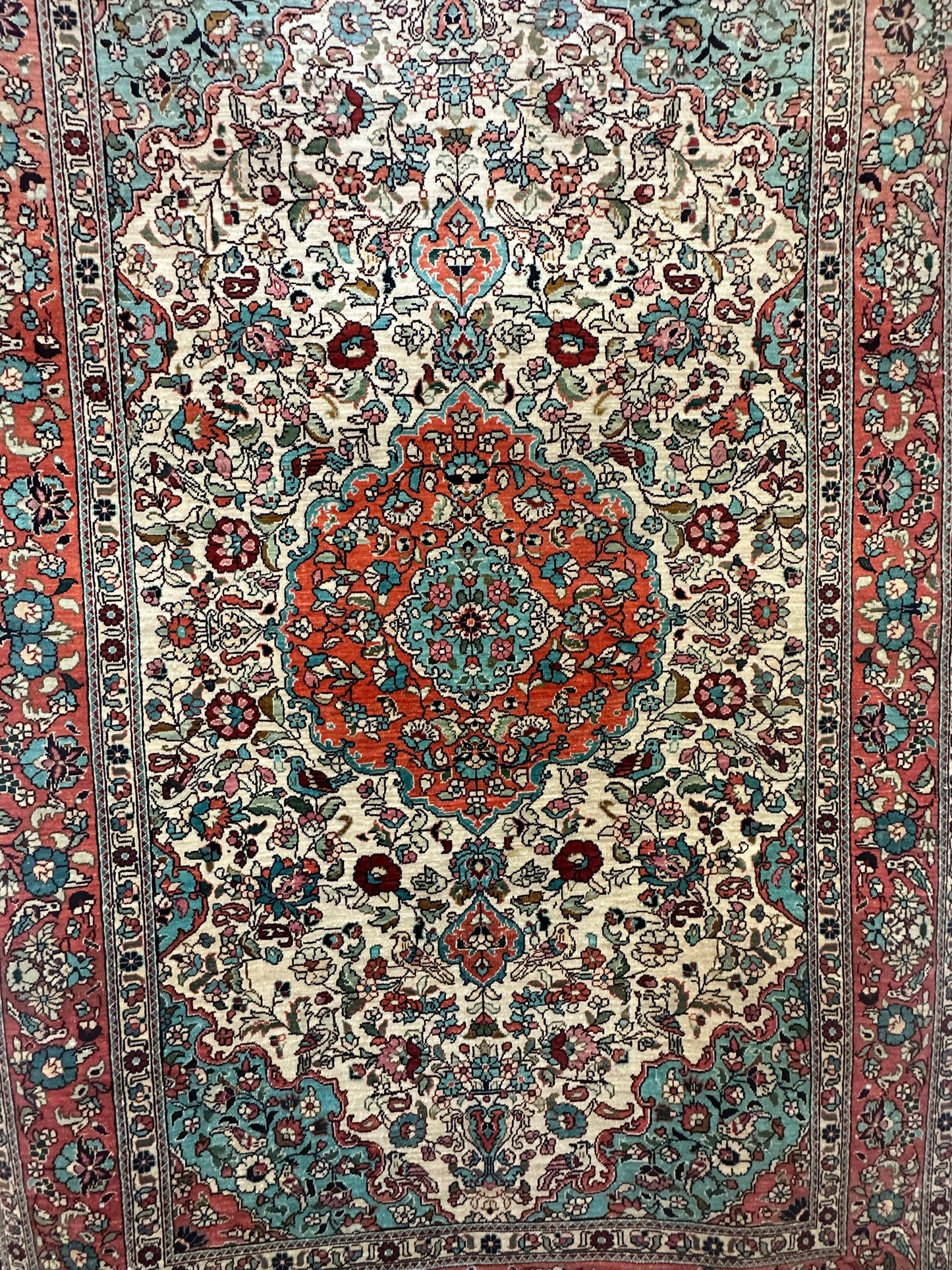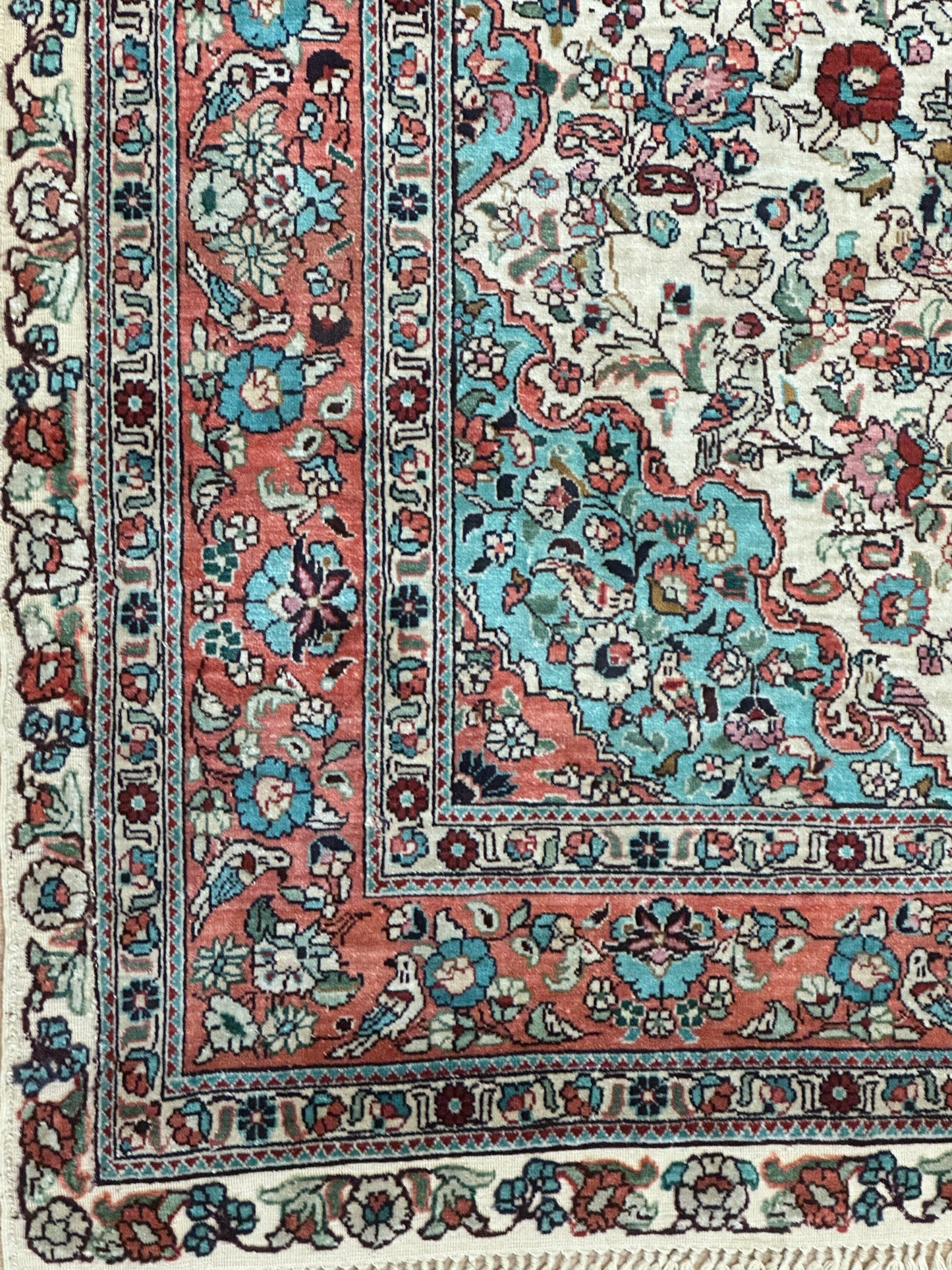 • Seidenmaterial: Die Verwendung von Seide in der Herstellung verleiht dem Teppich einen seidigen Glanz, eine luxuriöse Textur und eine bemerkenswerte Haltbarkeit.