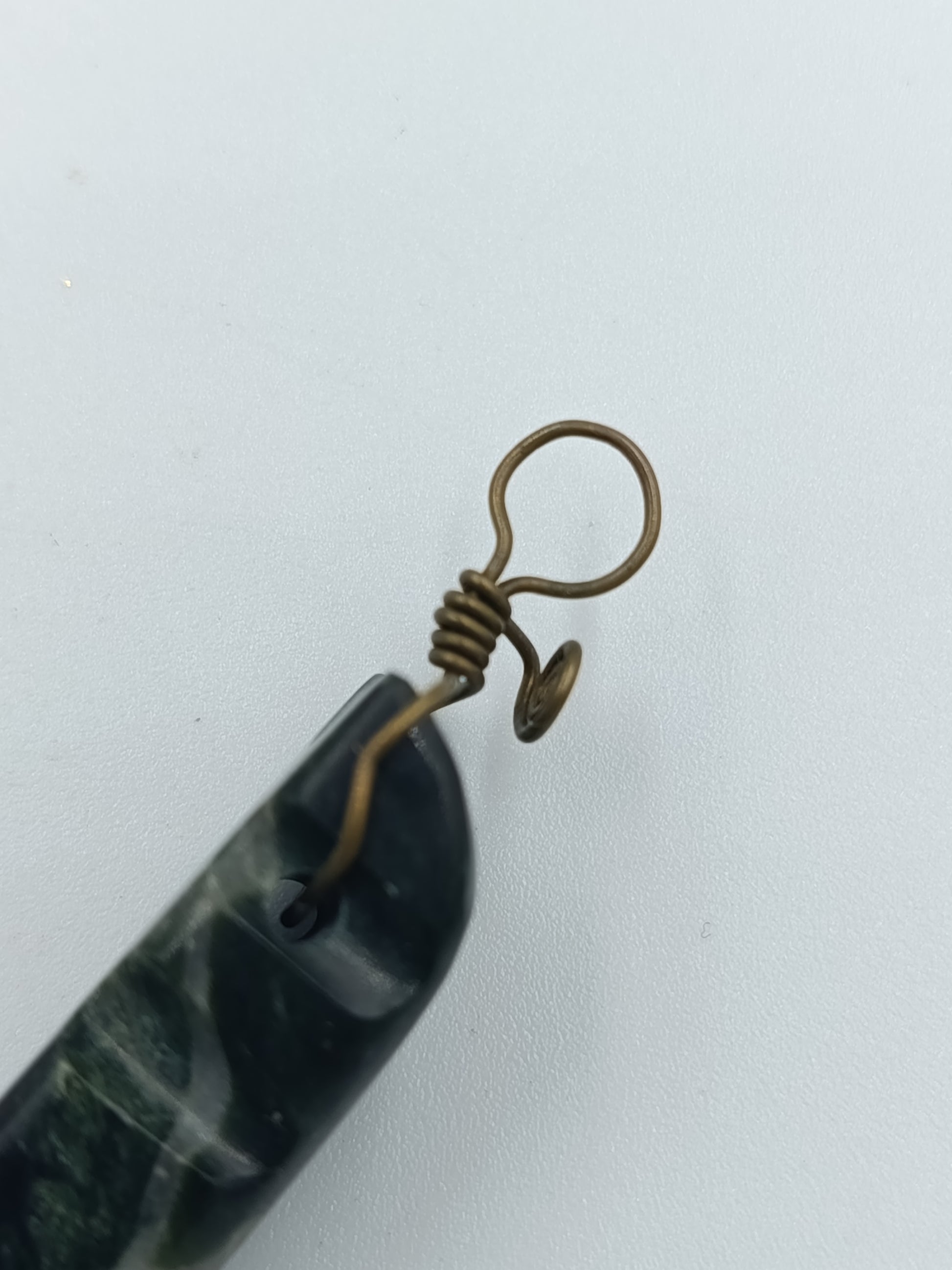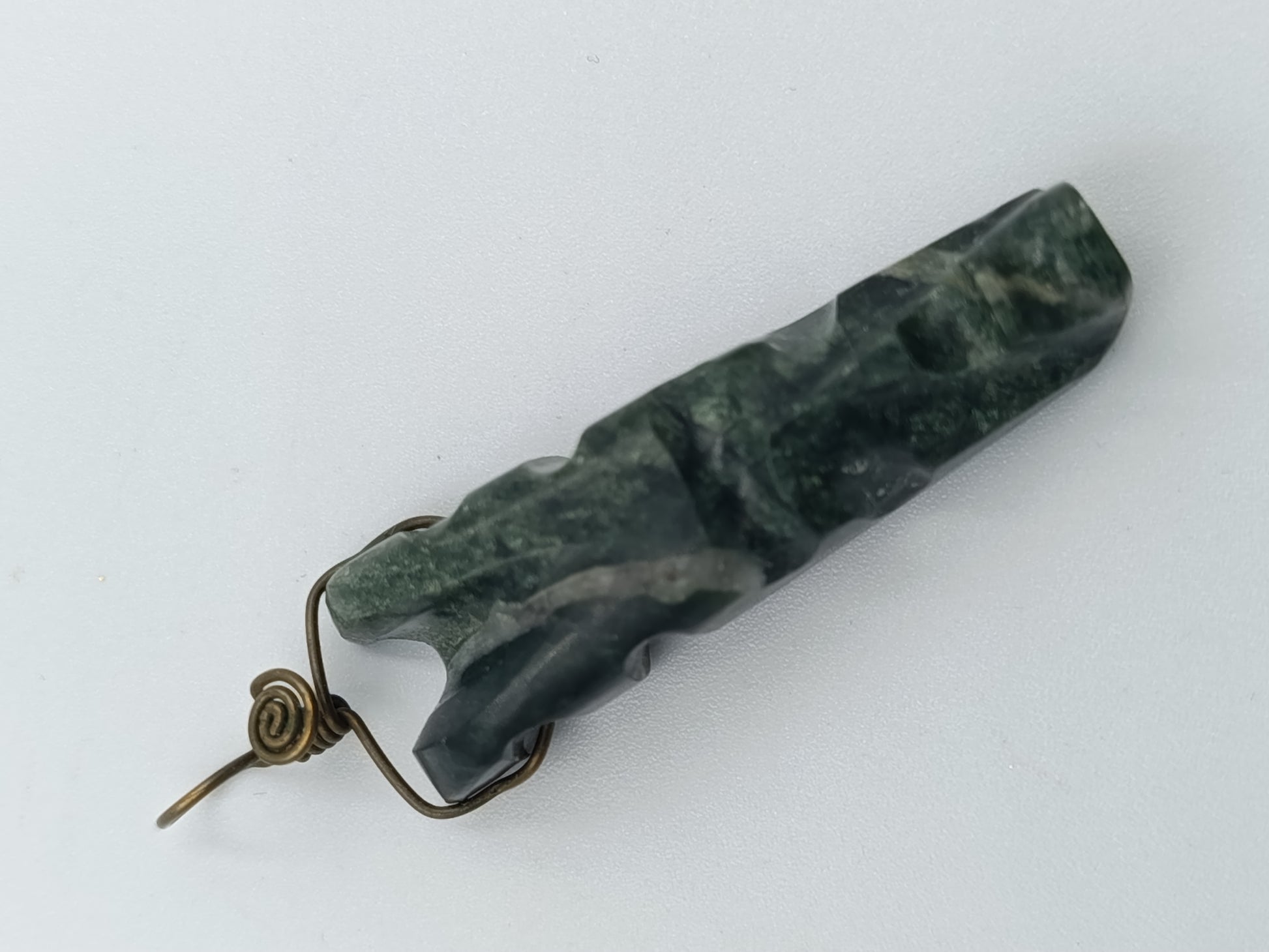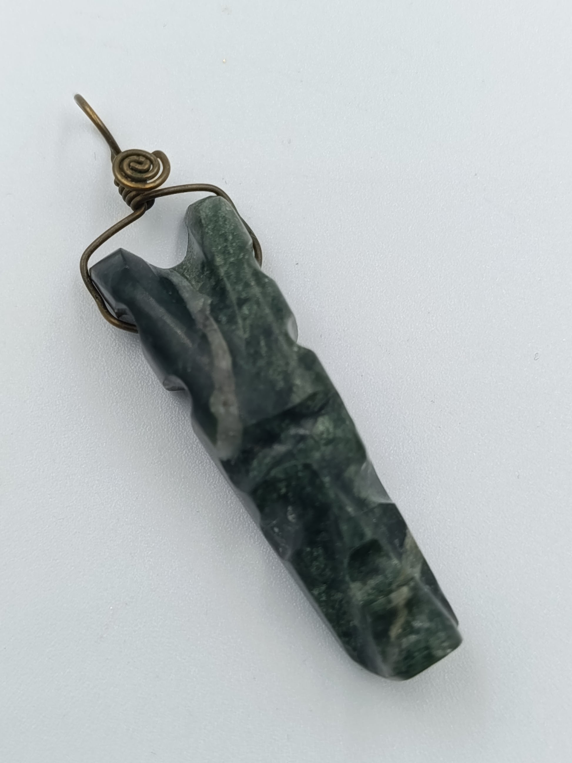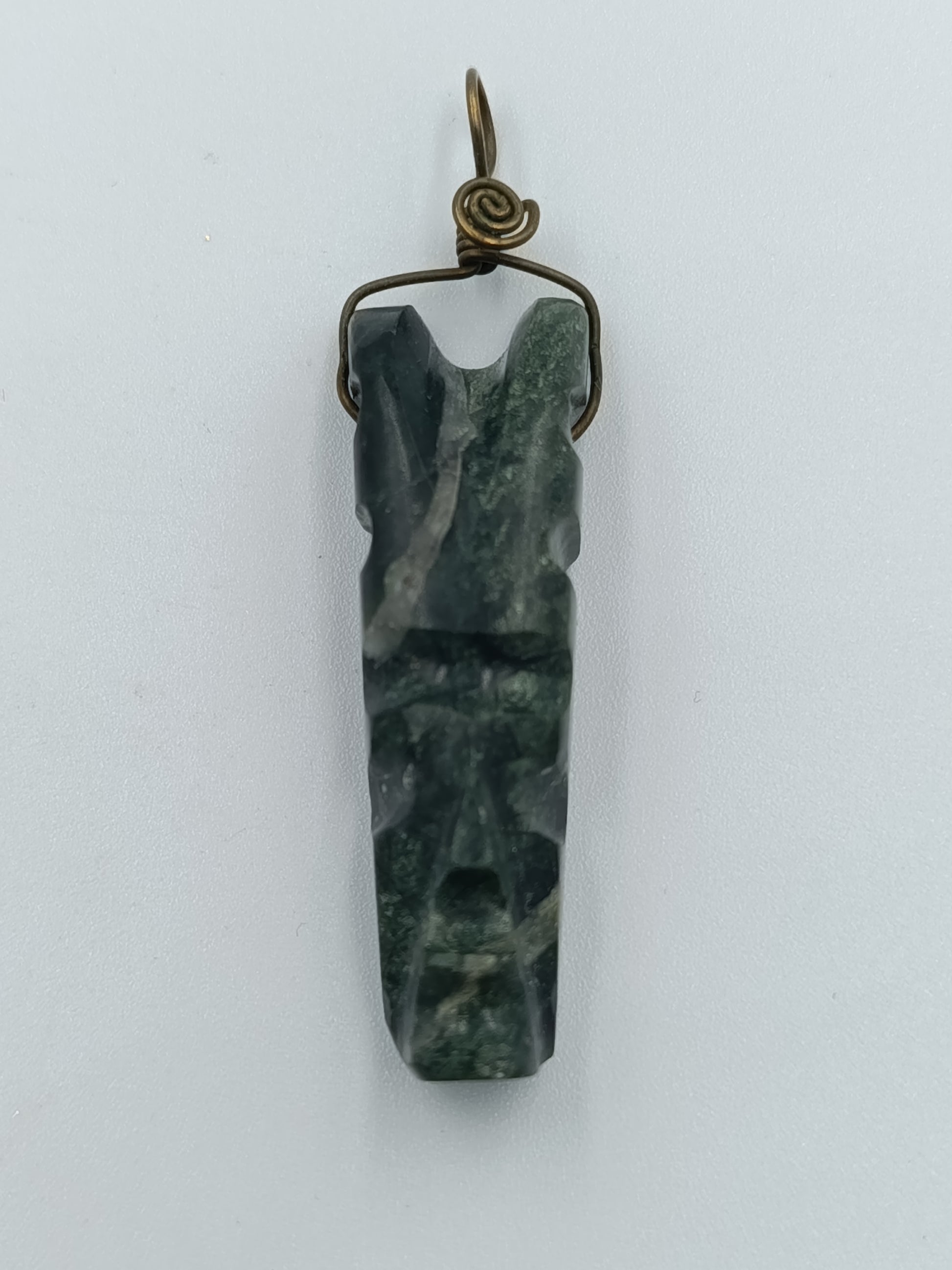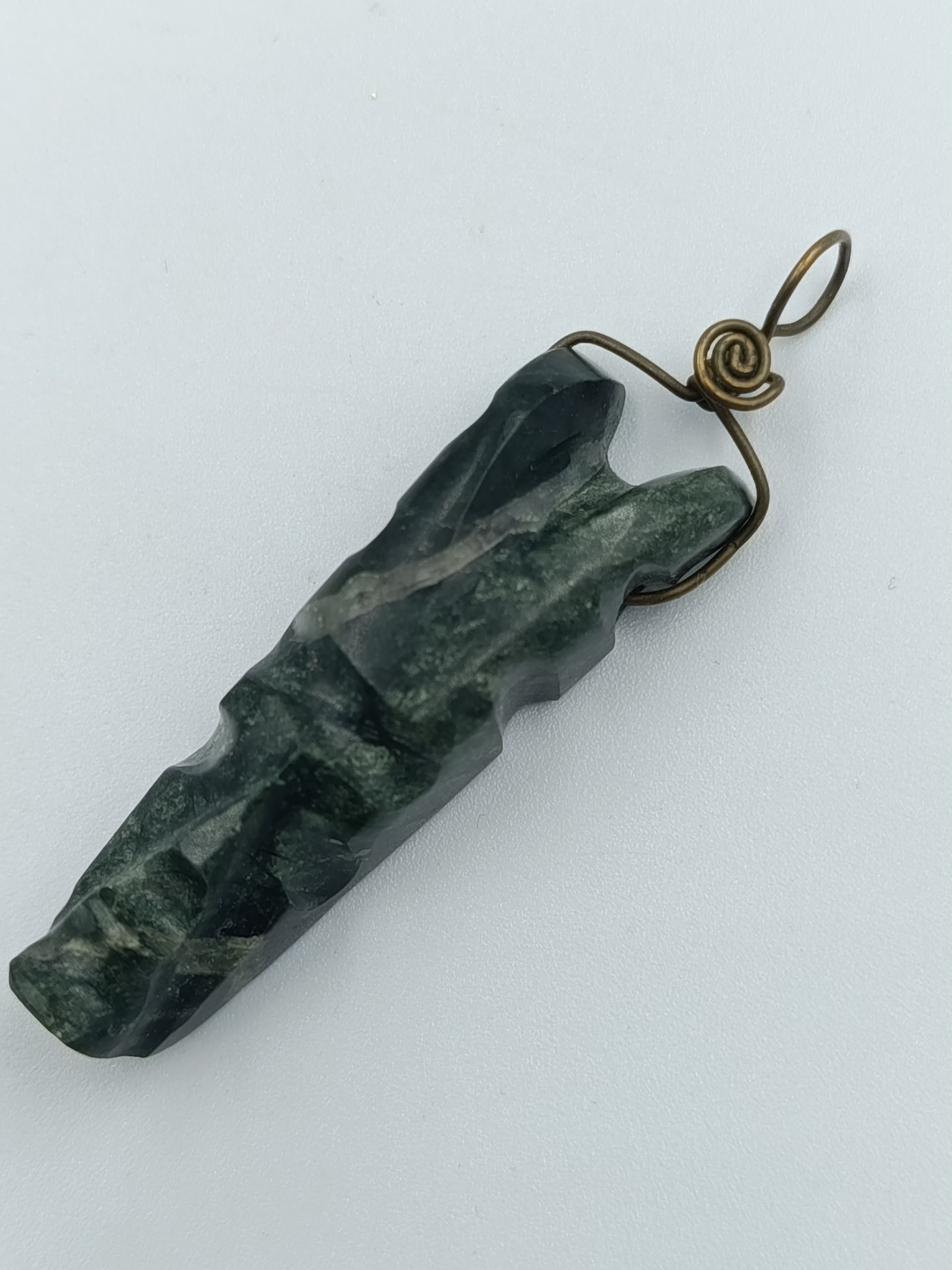 Außergewöhnlicher Anhänger aus dunkelgrünem Naturstein mit markanter Maserung. Der Stein ist von Hand geschnitzt und mit einer dekorativen Messingdraht-Fassung versehen – ein schöner Mix aus Naturmaterial und Handwerkskunst.