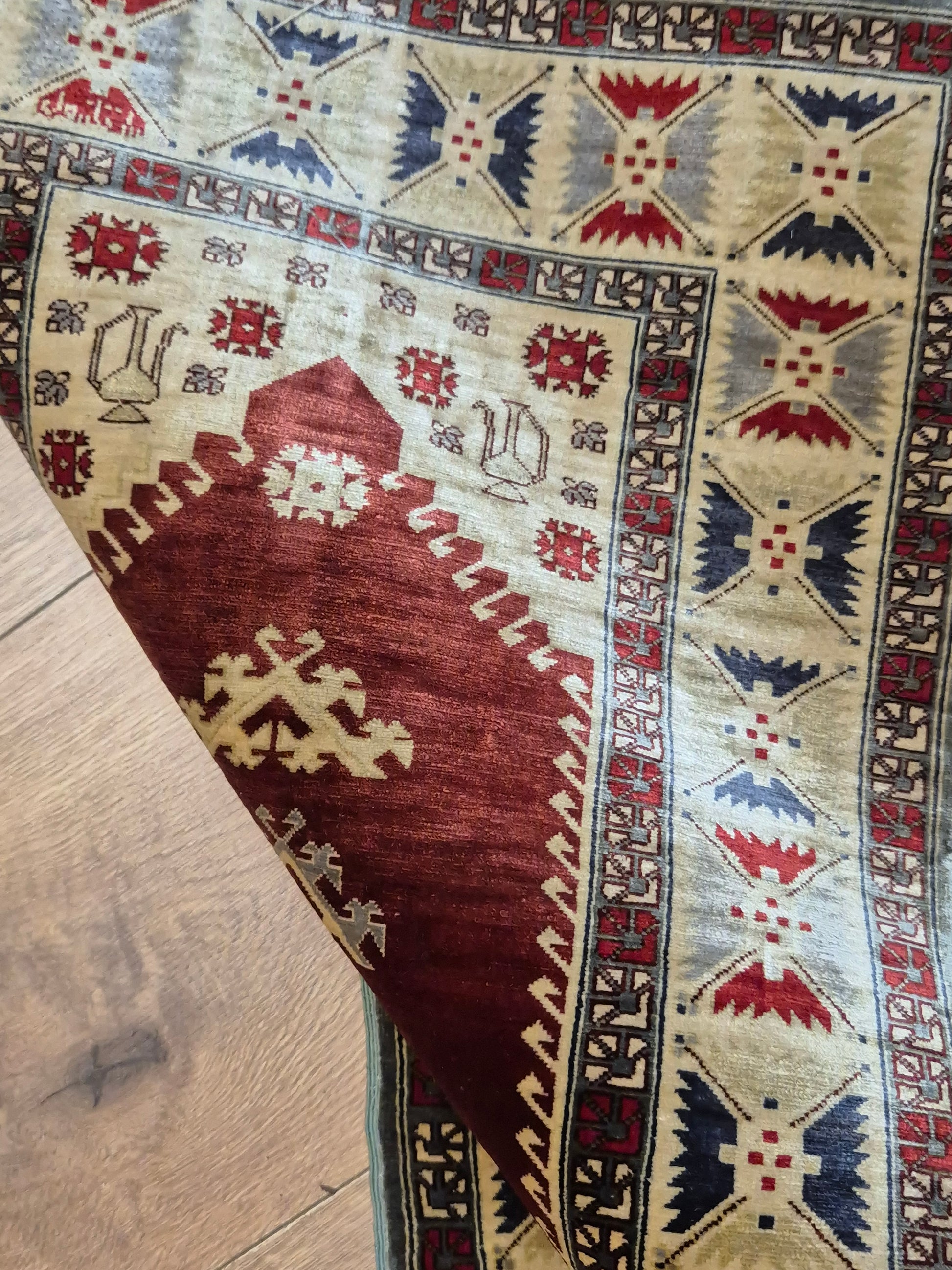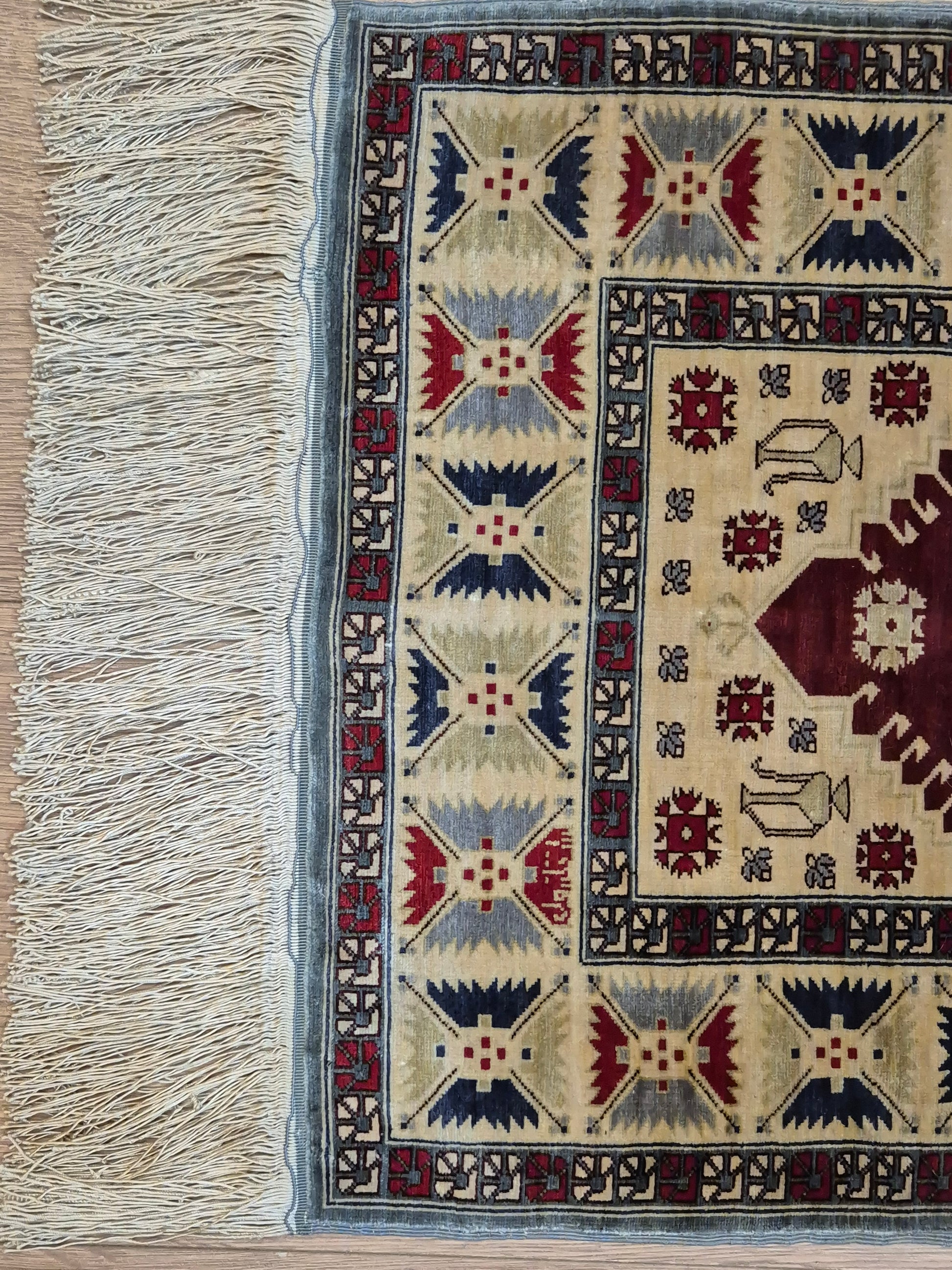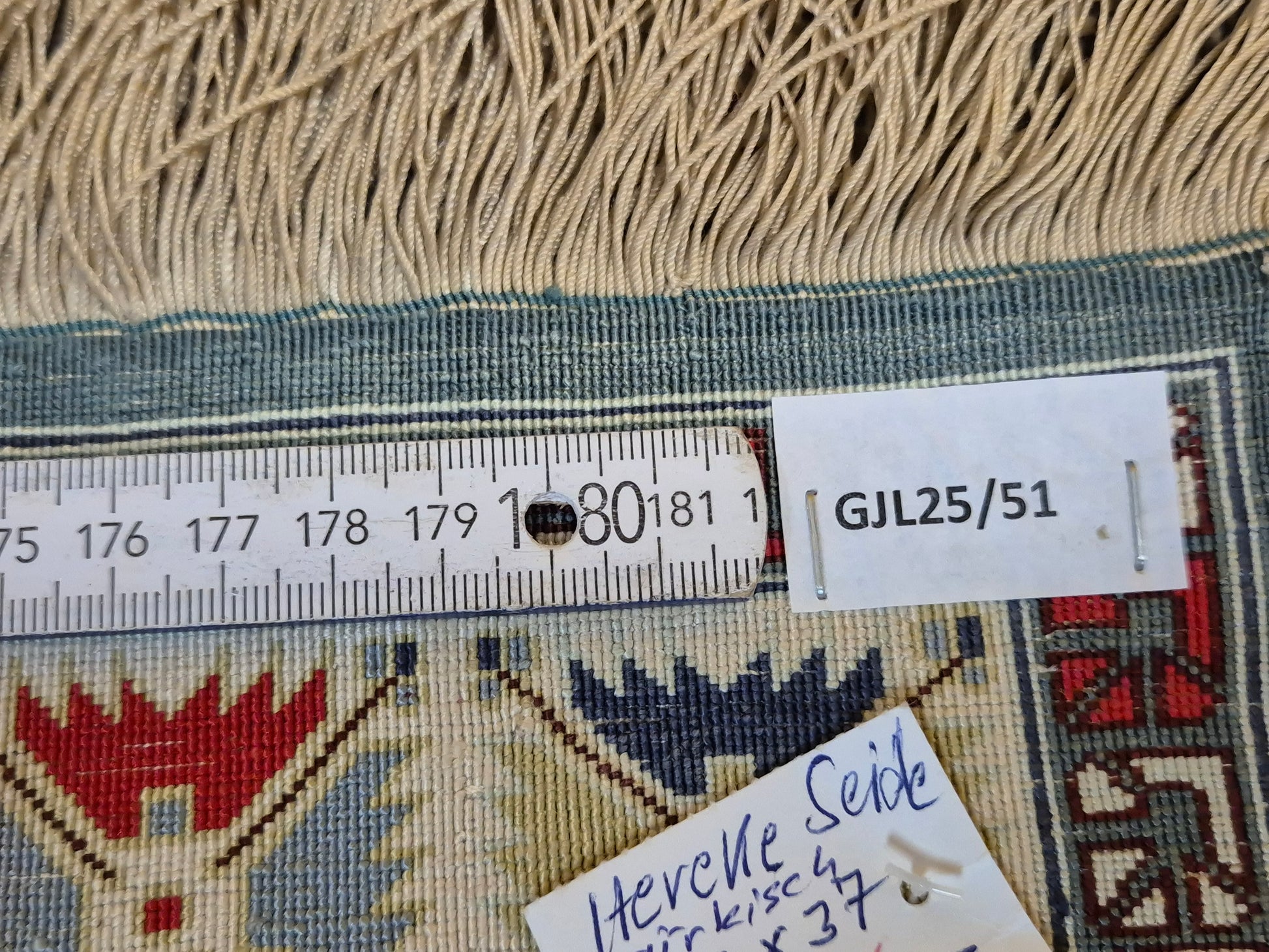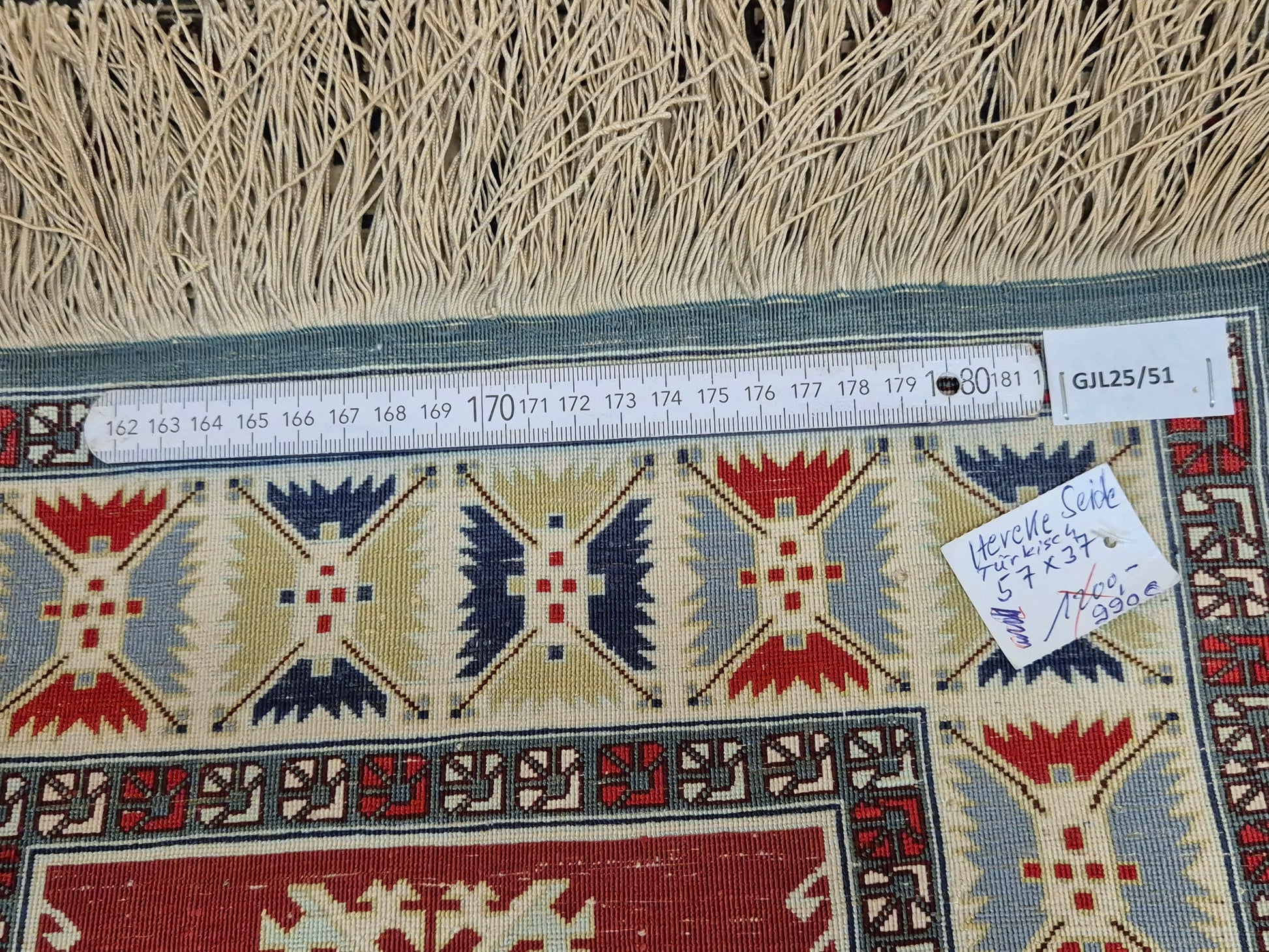angeboten wird ein seltener Hereke Teppich aus reiner Seide, handgeknüpft in feiner Qualität. Das Design zeigt die typische Gebetsteppich-Form mit Mihrab-Nische, akzentuiert durch geometrische Ornamente und stilisierte Rauten- sowie Hakenmotive. Die Bordüre ist reich verziert mit symmetrischen Mustern in kontrastreichen Farben, die dem Teppich eine klare, rhythmische Struktur verleihen.