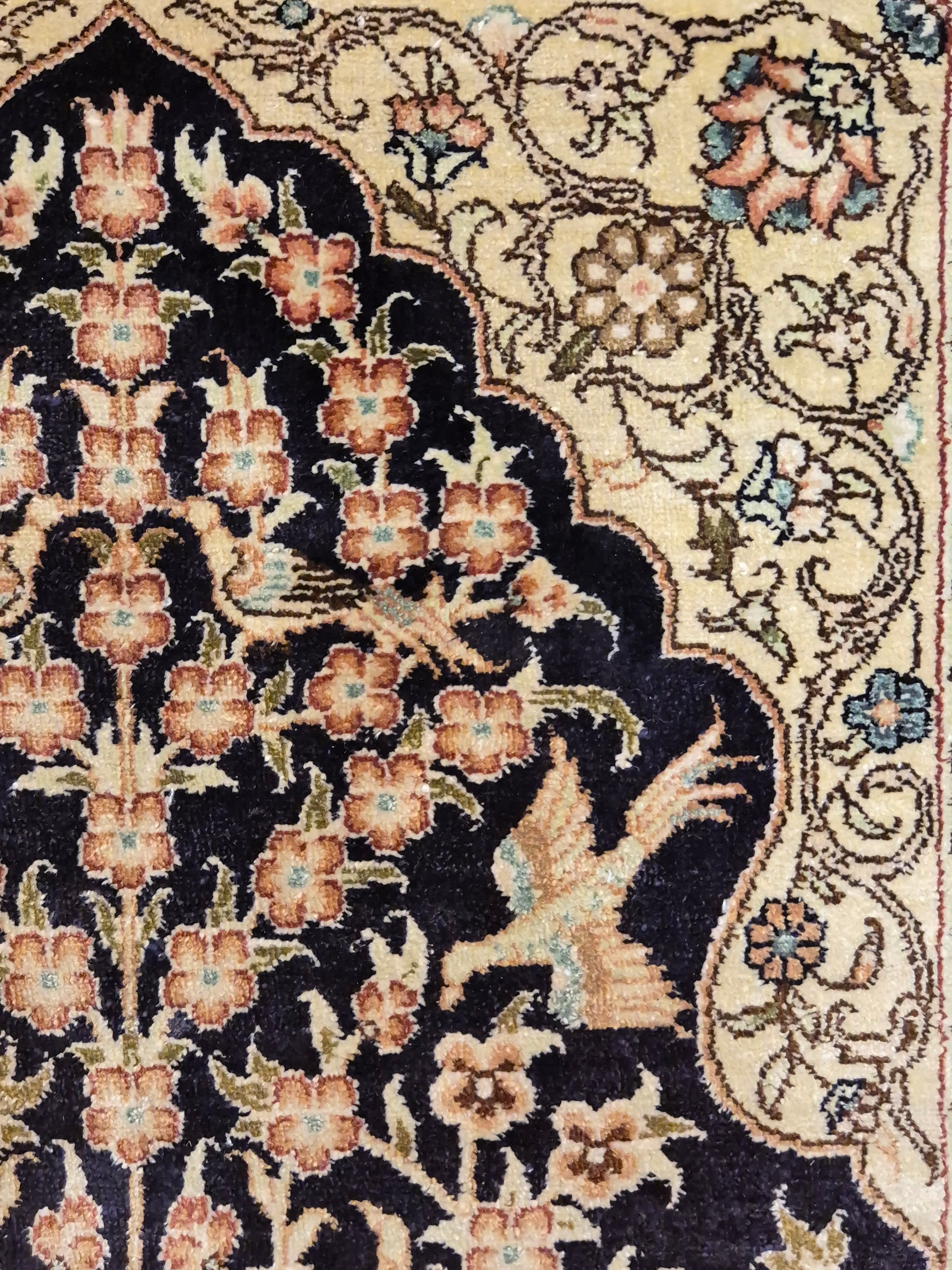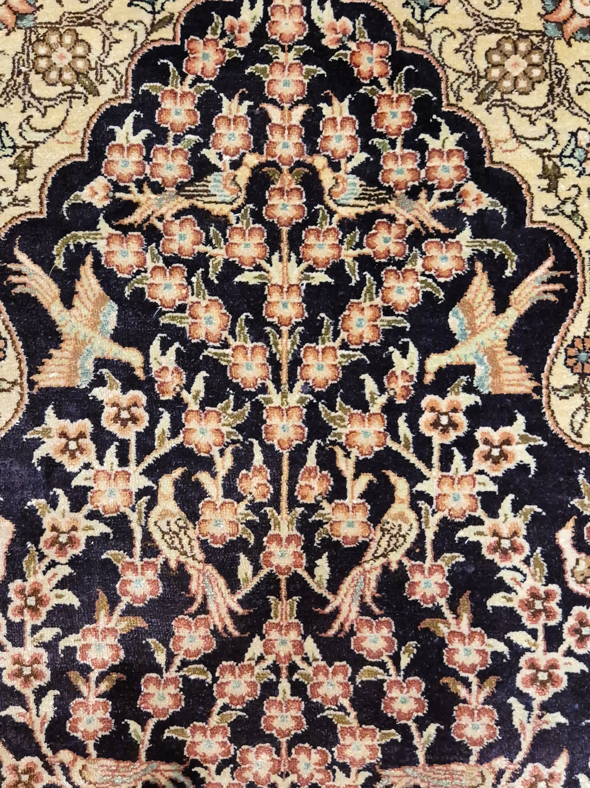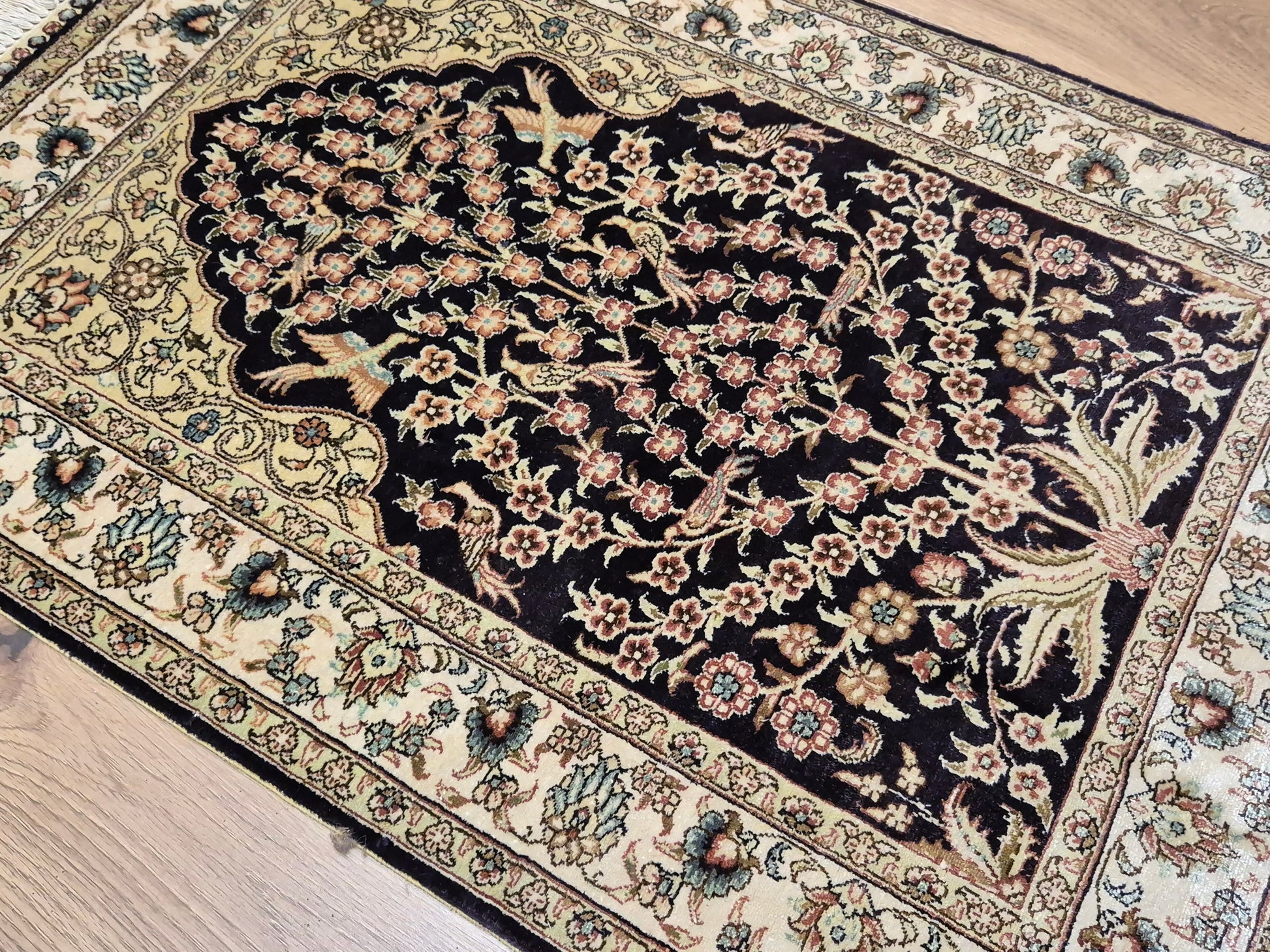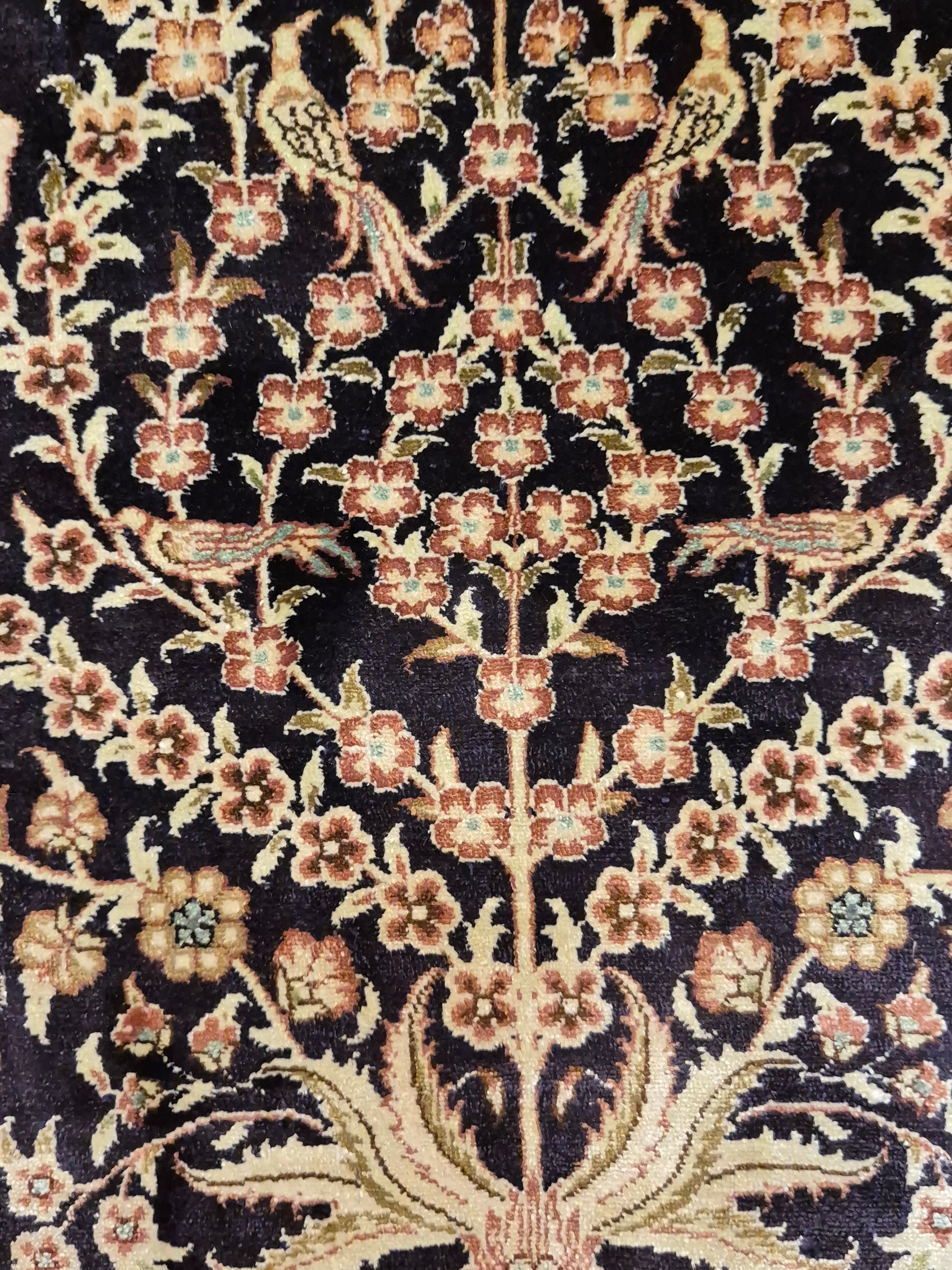 angeboten wird ein edler Hereke Teppich aus reiner Seide auf Seide, handgeknüpft in feinster Knüpfkunst und mit Signatur versehen. Das Design zeigt das klassische Motiv „Baum des Lebens“, das in kunstvoller Symmetrie mit filigranen Blüten, Vögeln und feinen Ranken ausgearbeitet ist. Der dunkle Fond bildet einen wirkungsvollen Kontrast zu den zarten Pastelltönen, wodurch die floralen Details und die kunstvolle Knüpftechnik besonders hervortreten.