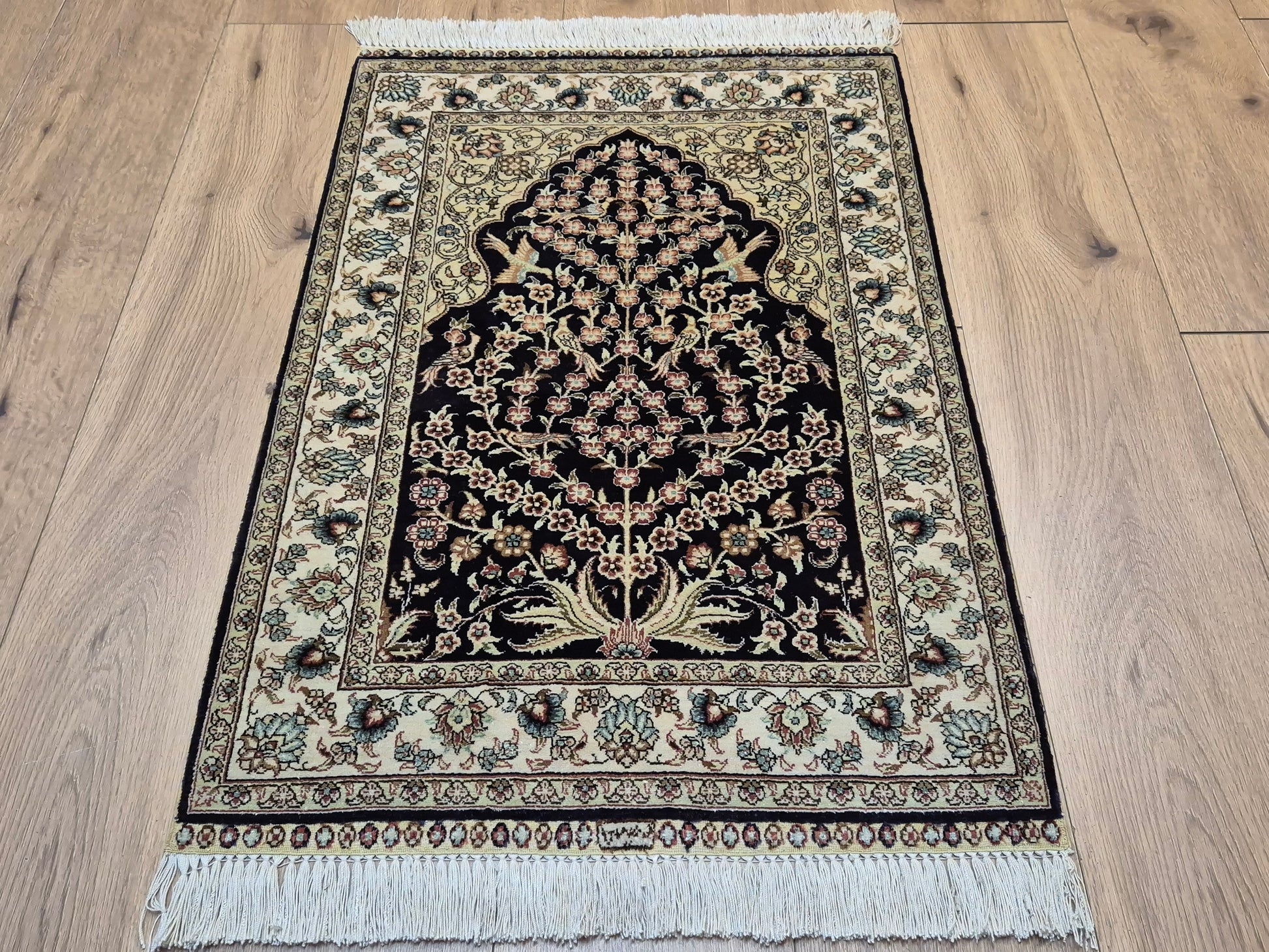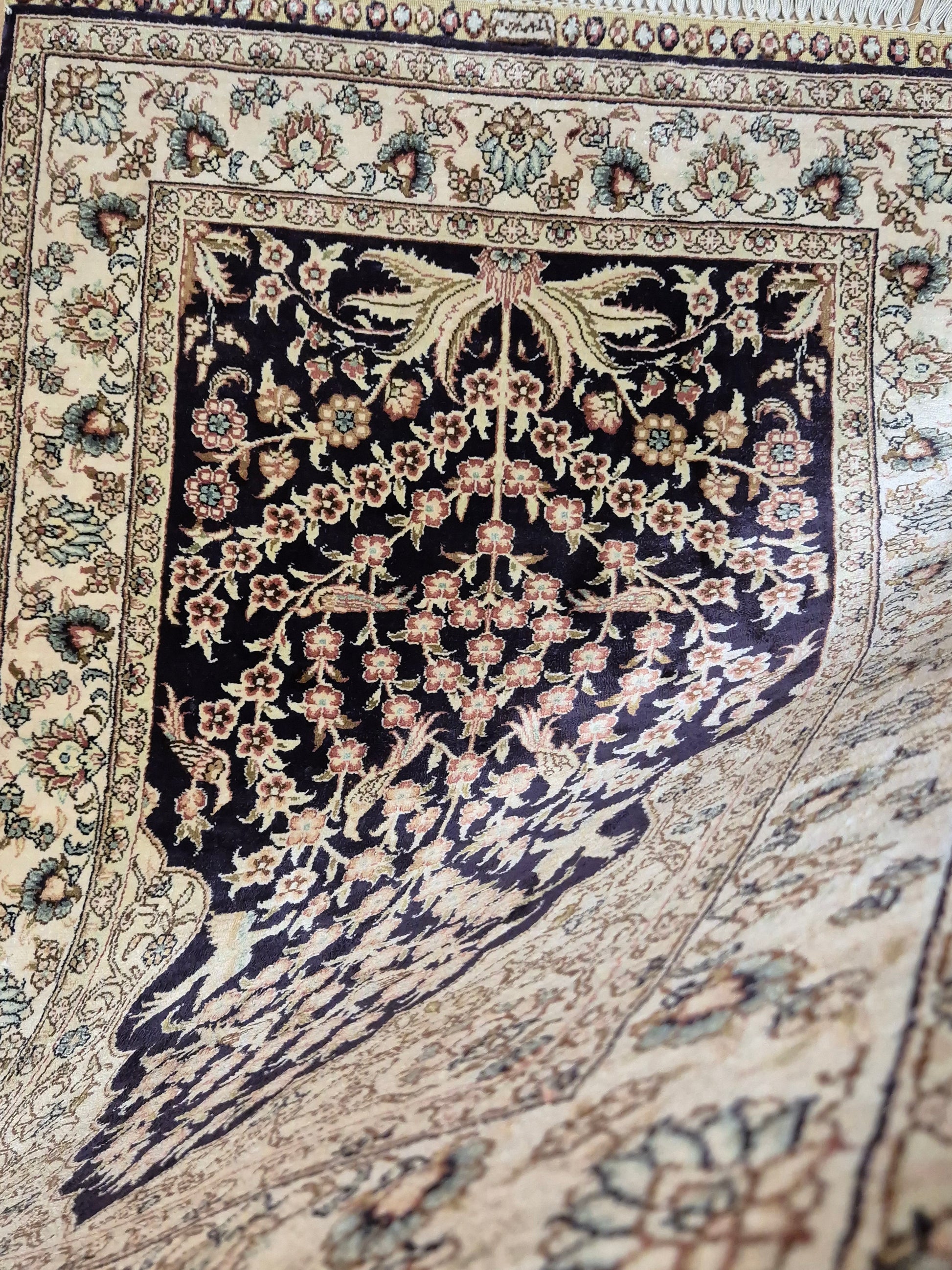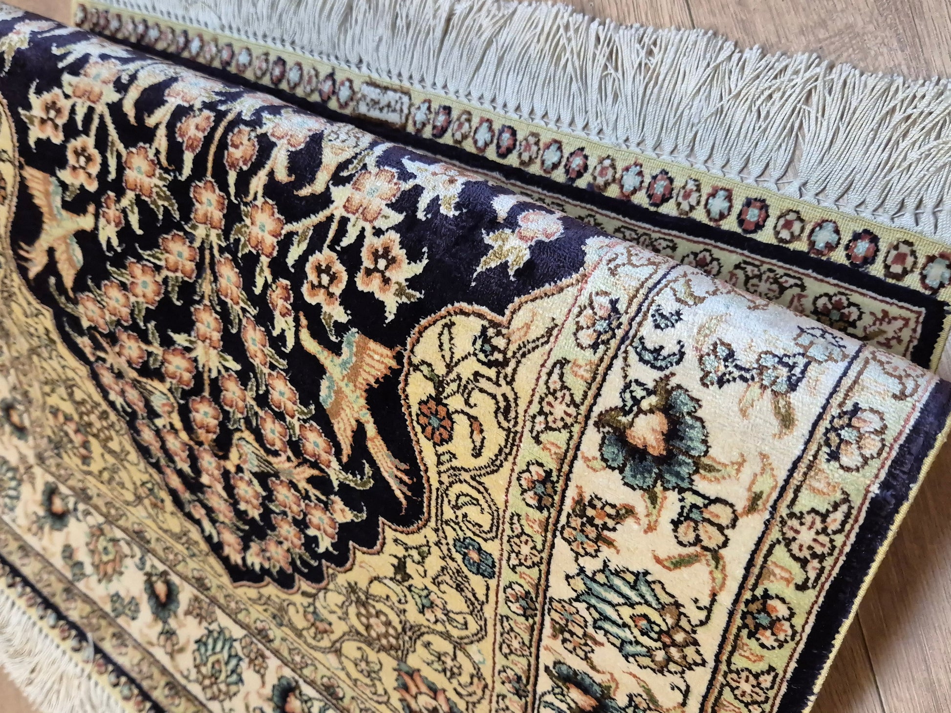angeboten wird ein edler Hereke Teppich aus reiner Seide auf Seide, handgeknüpft in feinster Knüpfkunst und mit Signatur versehen. Das Design zeigt das klassische Motiv „Baum des Lebens“, das in kunstvoller Symmetrie mit filigranen Blüten, Vögeln und feinen Ranken ausgearbeitet ist. Der dunkle Fond bildet einen wirkungsvollen Kontrast zu den zarten Pastelltönen, wodurch die floralen Details und die kunstvolle Knüpftechnik besonders hervortreten.