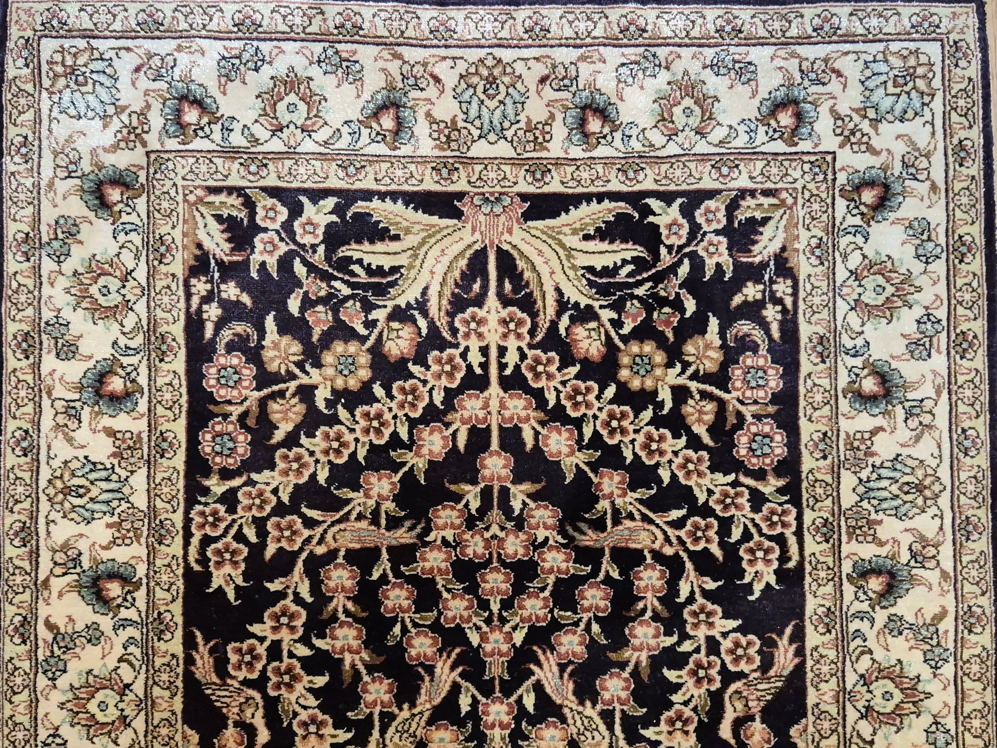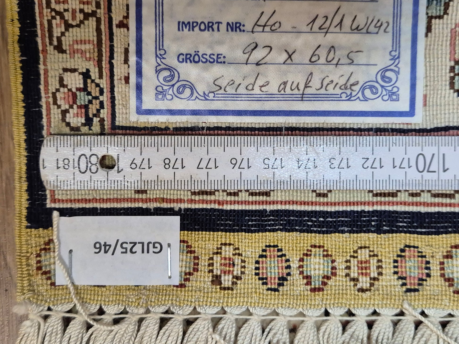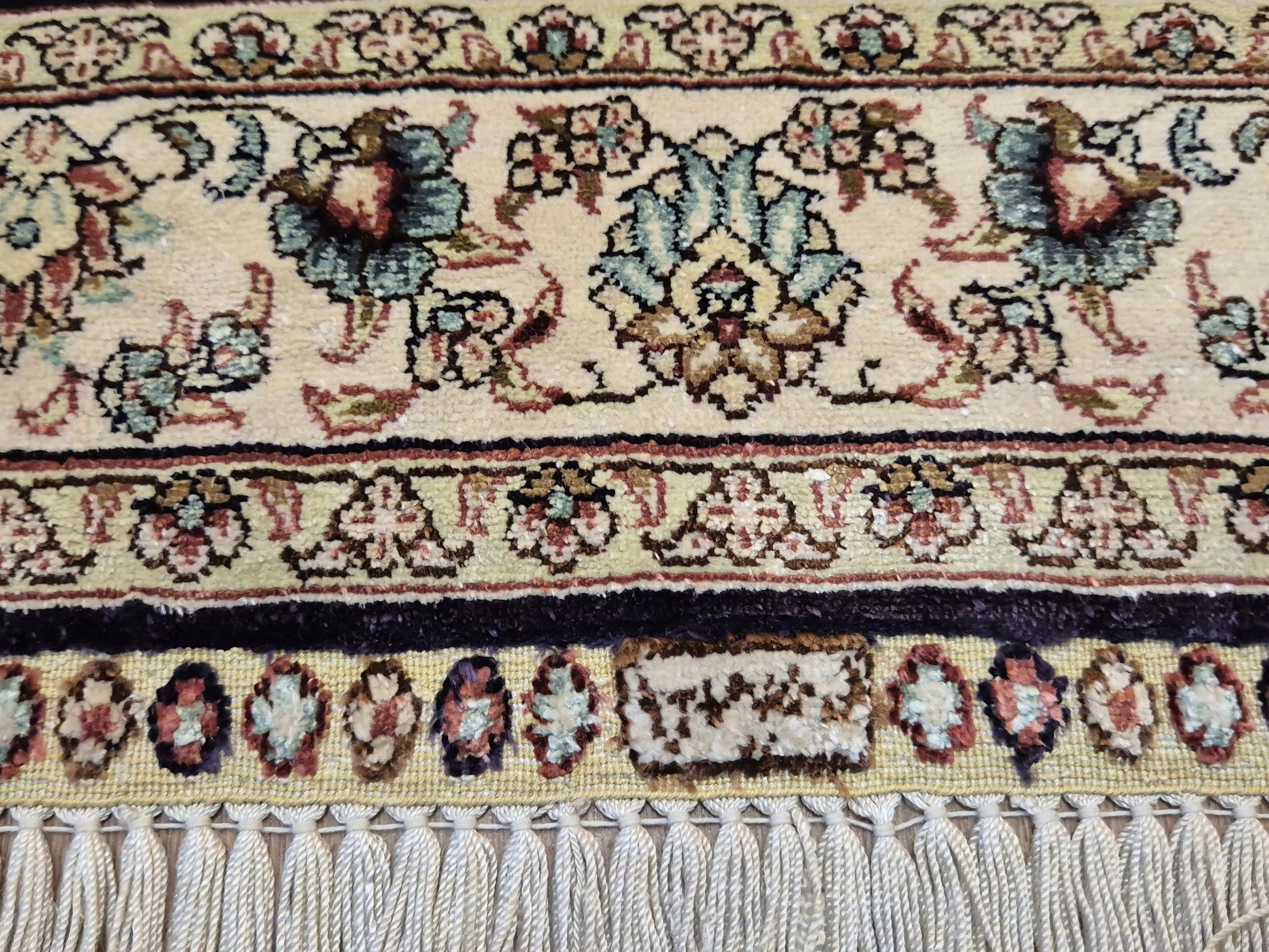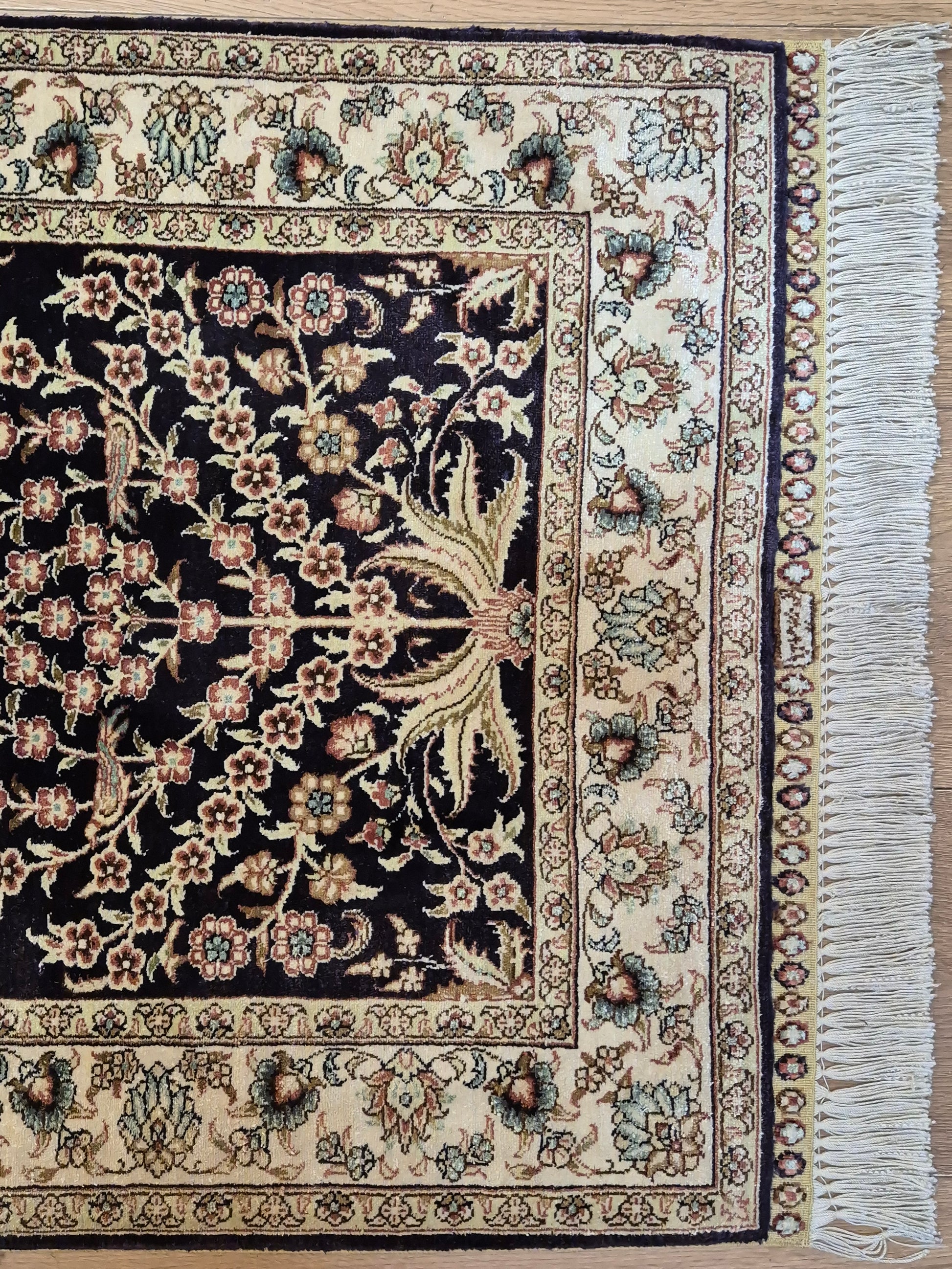 angeboten wird ein edler Hereke Teppich aus reiner Seide auf Seide, handgeknüpft in feinster Knüpfkunst und mit Signatur versehen. Das Design zeigt das klassische Motiv „Baum des Lebens“, das in kunstvoller Symmetrie mit filigranen Blüten, Vögeln und feinen Ranken ausgearbeitet ist. Der dunkle Fond bildet einen wirkungsvollen Kontrast zu den zarten Pastelltönen, wodurch die floralen Details und die kunstvolle Knüpftechnik besonders hervortreten.