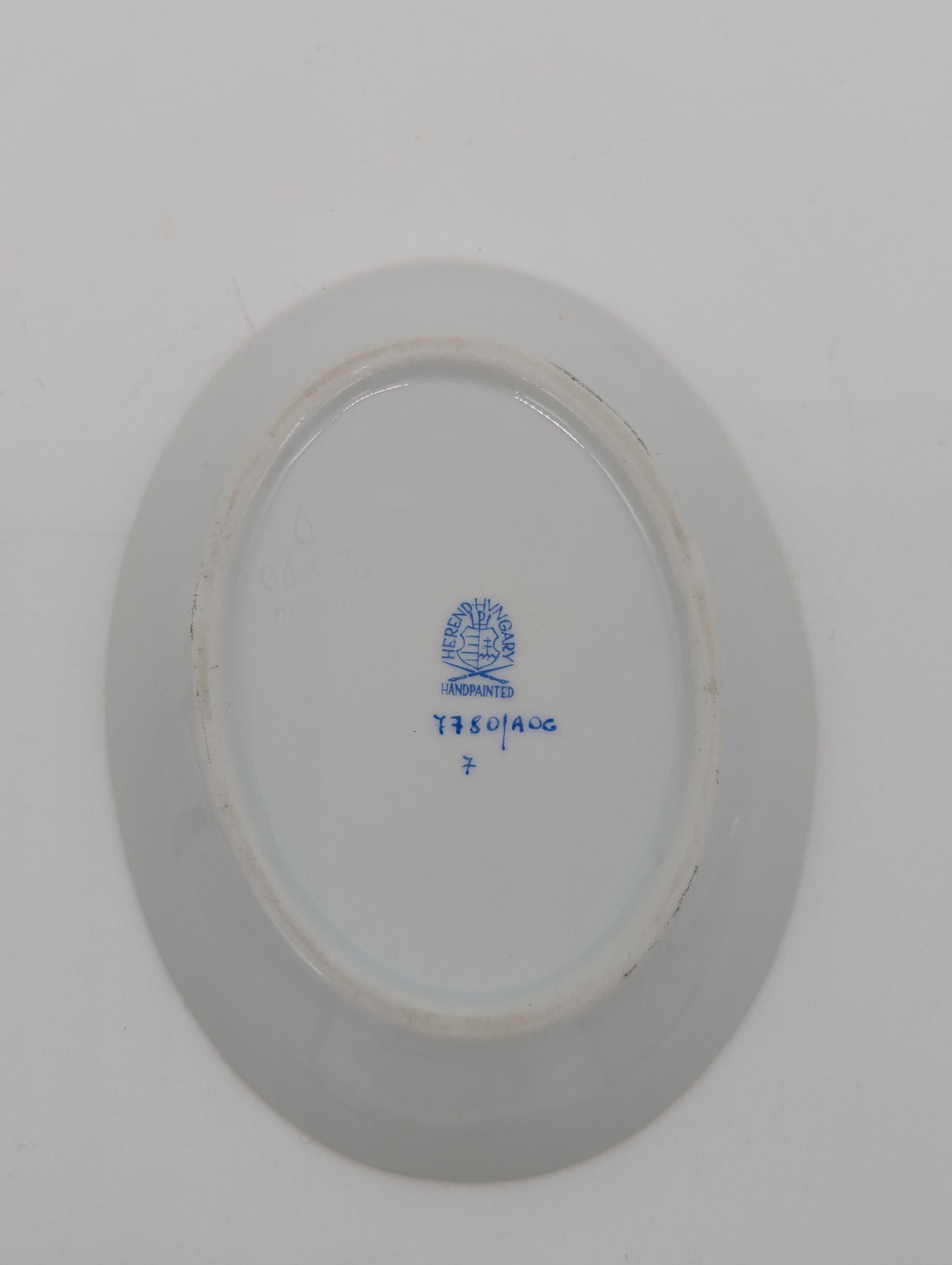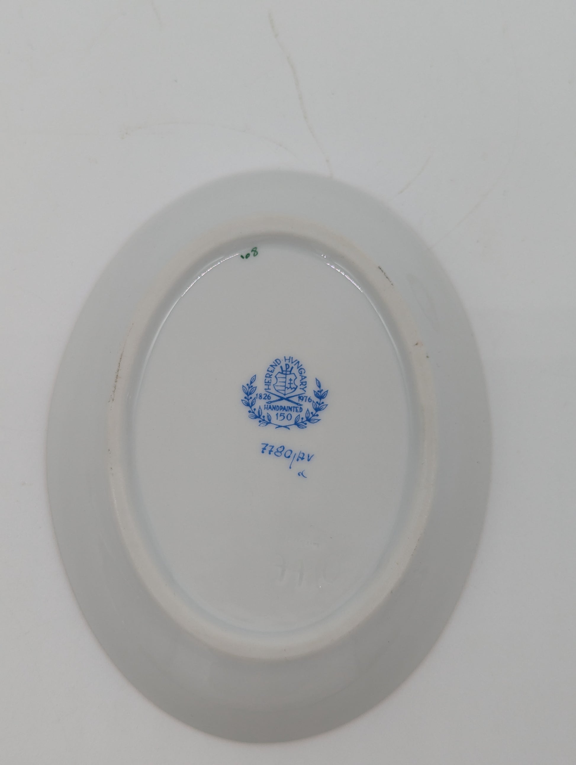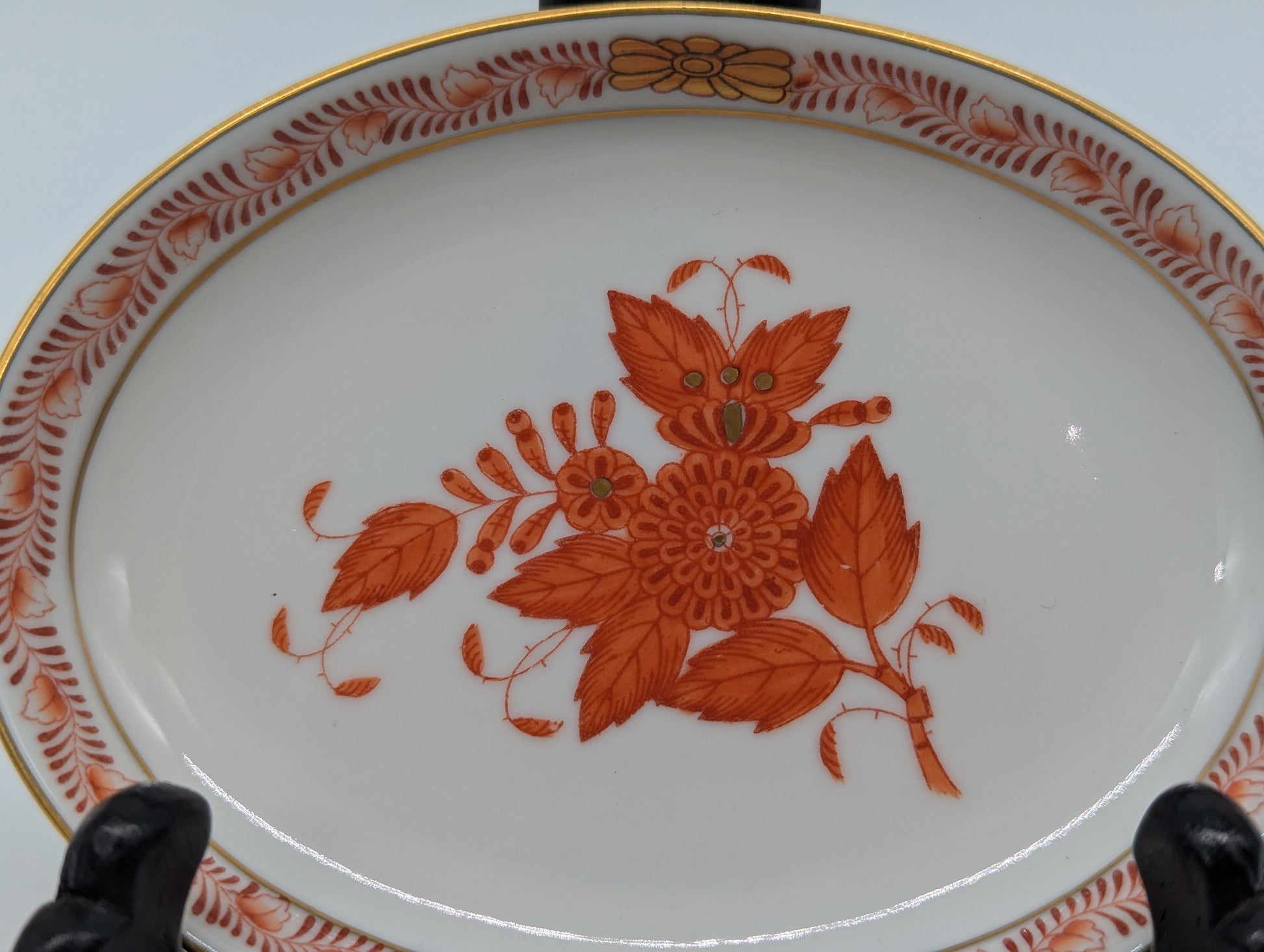 Dieses edle Herend Porzellan Schälchen Set besteht aus zwei ovalen Schalen in den klassischen Dekoren Apponyi Grün und Apponyi Orange. Beide Stücke sind fein handbemalt und mit goldenen Akzenten verziert. Die Schalen vereinen zeitlose Eleganz und präzise Handwerkskunst der ungarischen Porzellanmanufaktur Herend – ideal als Sammlerstücke oder für dekorative Zwecke.