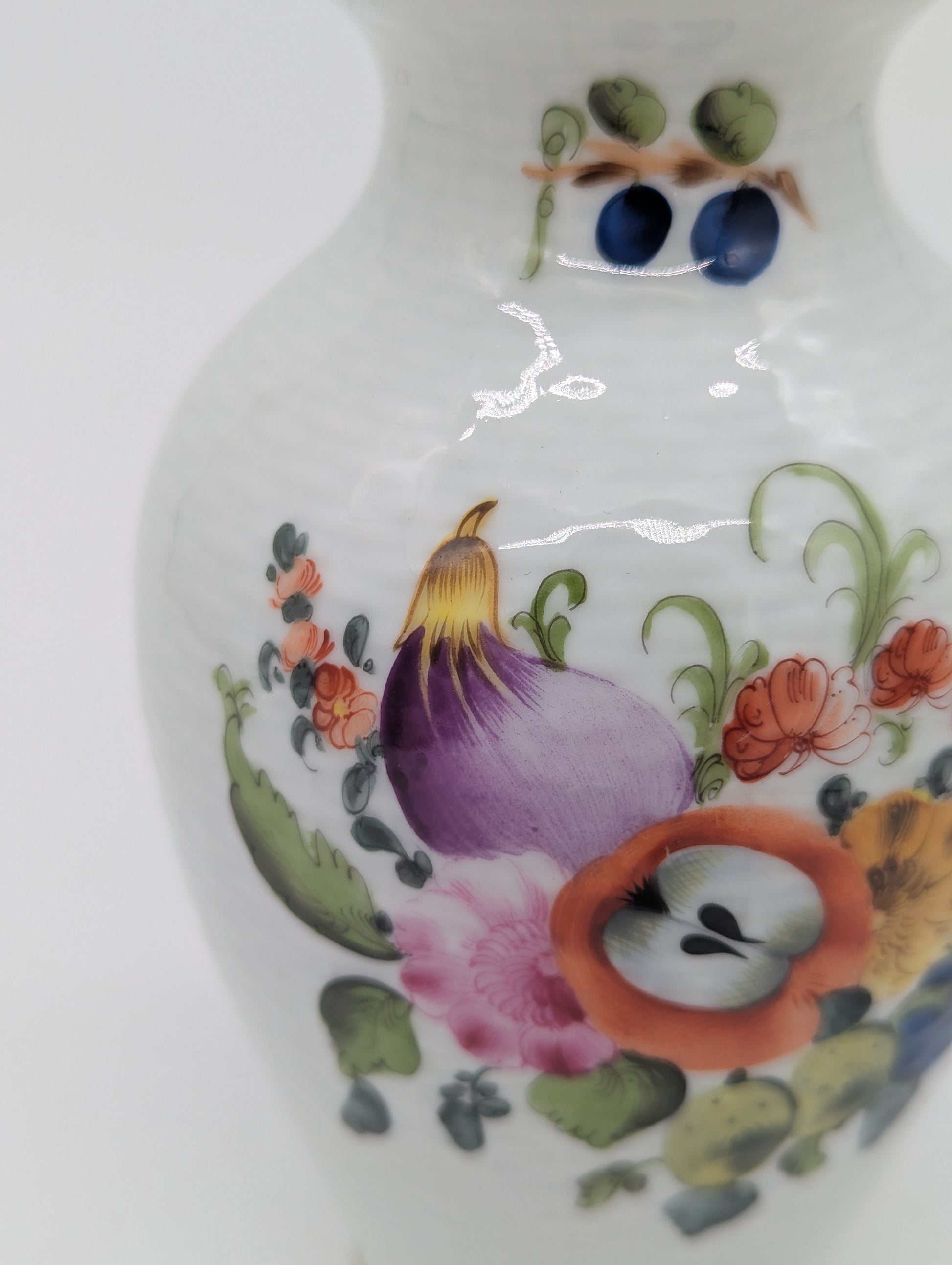 Diese edle Herend Porzellan Vase aus Ungarn zeigt ein klassisches handbemaltes Blumenmotiv in kräftigen Farben. Die fein gearbeitete Form mit leicht gewölbter Schulter und schmalem Hals wird durch einen zarten Goldrand veredelt. Typisch für Herend ist die präzise Handmalerei mit liebevollen Details und hoher Farbbrillanz – ein elegantes Sammlerstück ungarischer Porzellankunst.