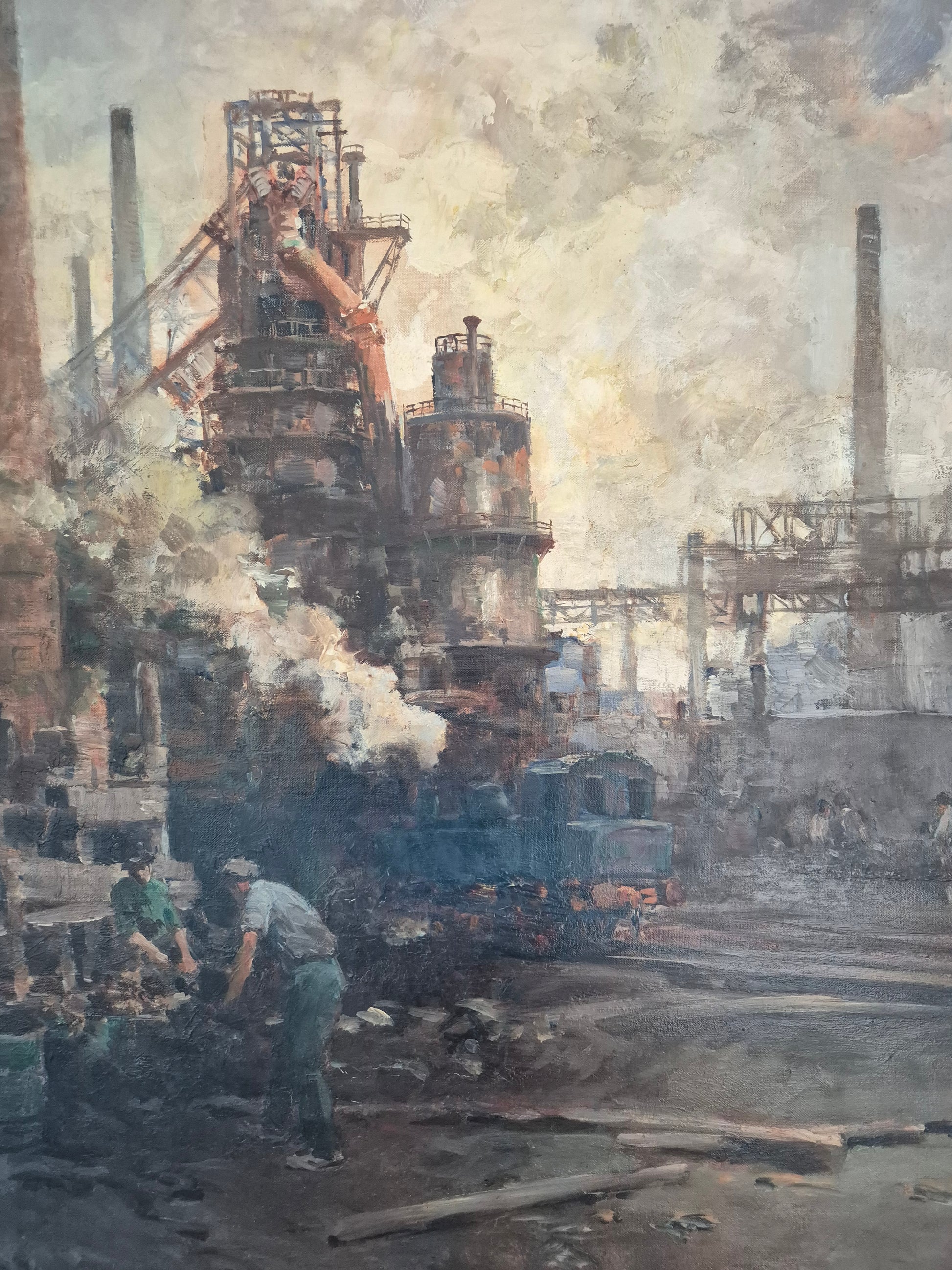 Herzlich willkommen, angeboten wird ein eindrucksvolles Ölgemälde von Hermann Schmidtmann, das eine beeindruckende Industrieanlage mit einem Hochofen zeigt. Die kraftvolle Darstellung der industriellen Szene spiegelt die Dynamik und den Fortschritt der Zeit wider und verleiht dem Werk eine monumentale Präsenz. Schmidtmanns meisterhafte Technik und Detailtreue lassen die Szene lebendig wirken und vermitteln einen tiefen Eindruck der damaligen Industrialisierung.