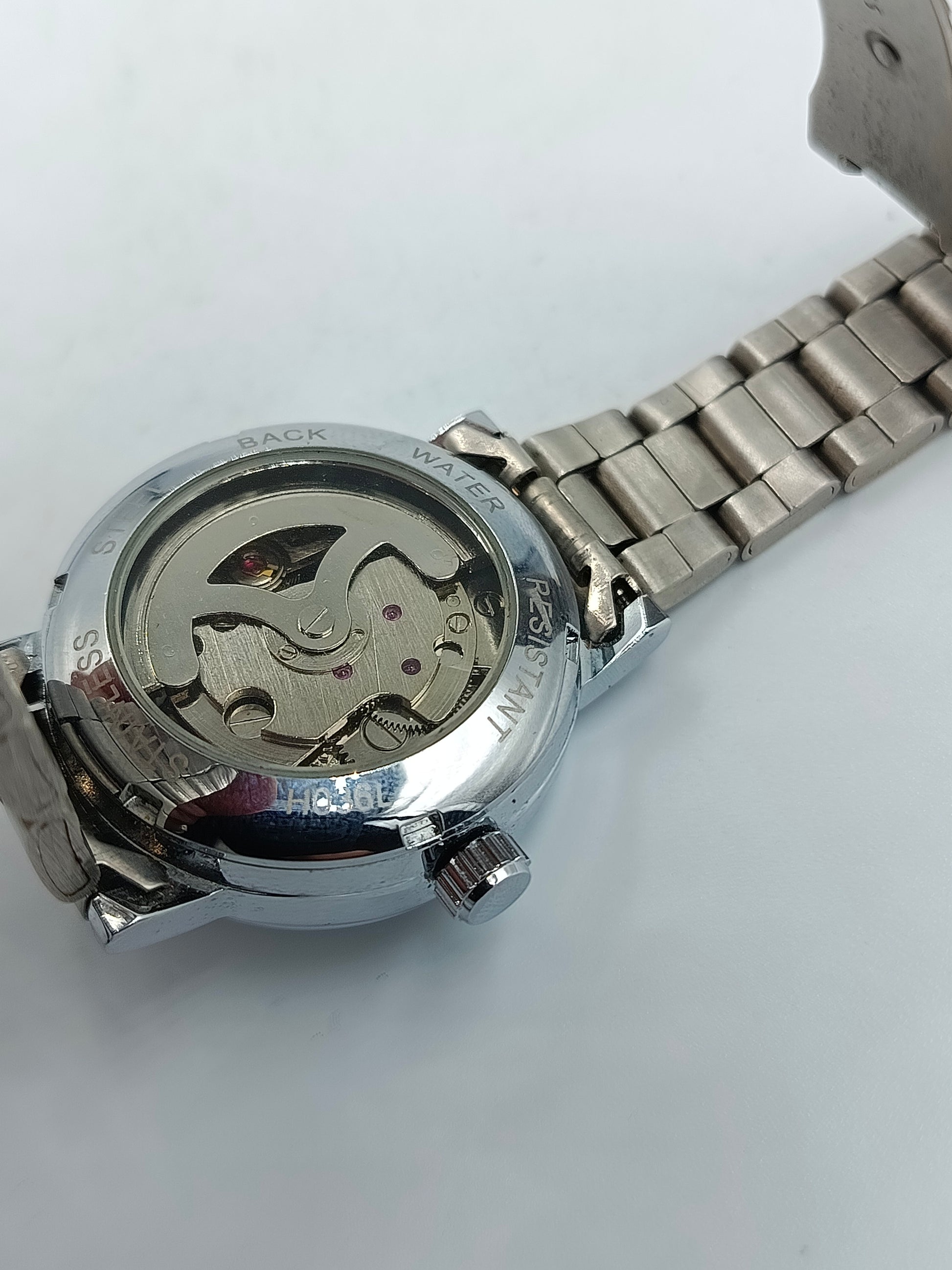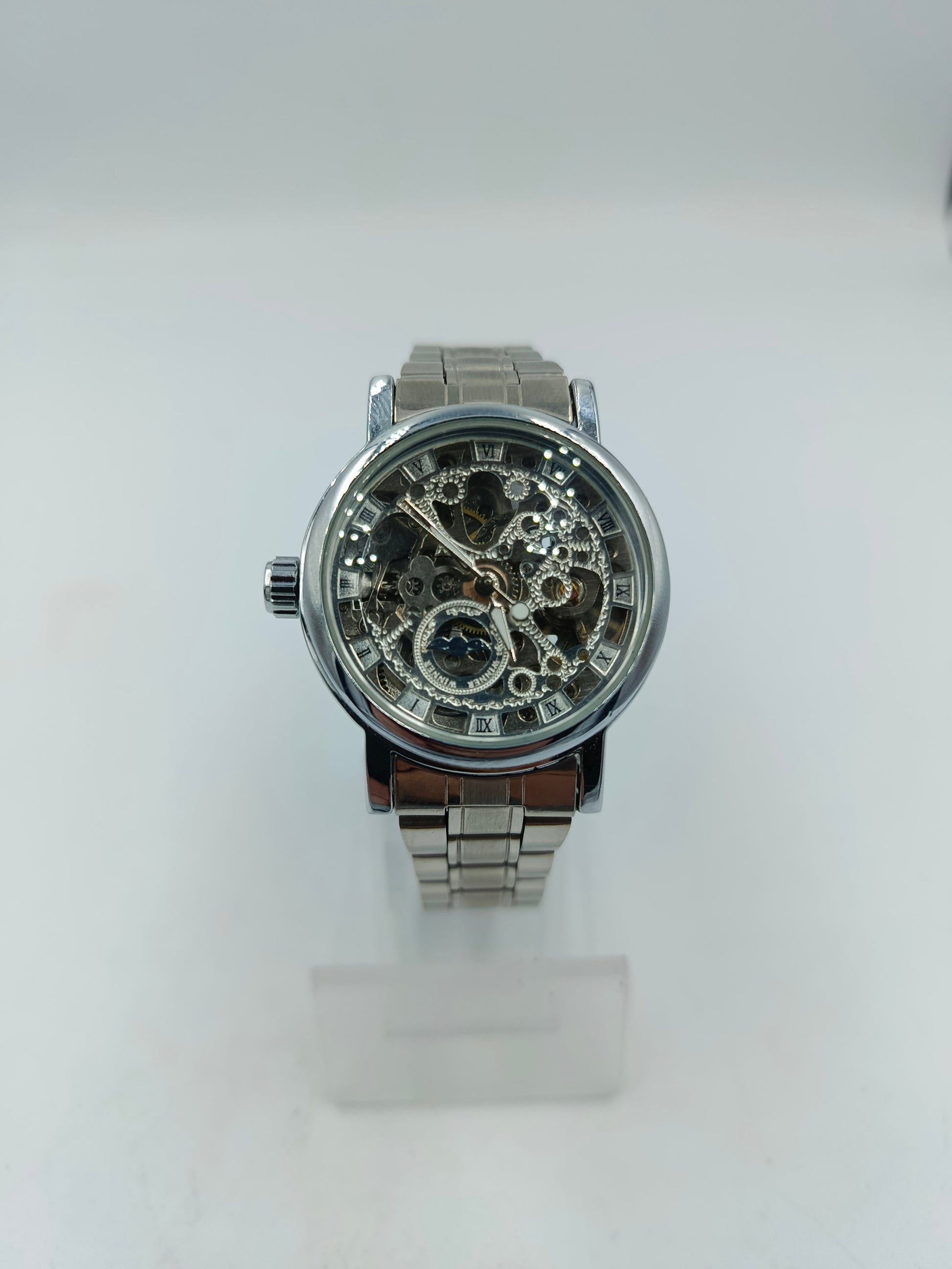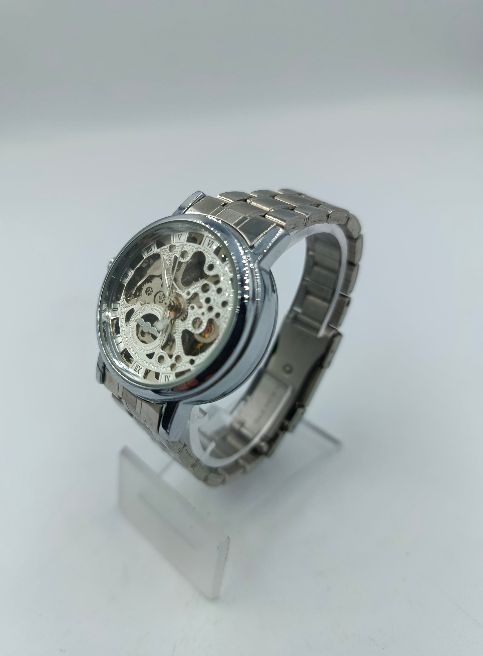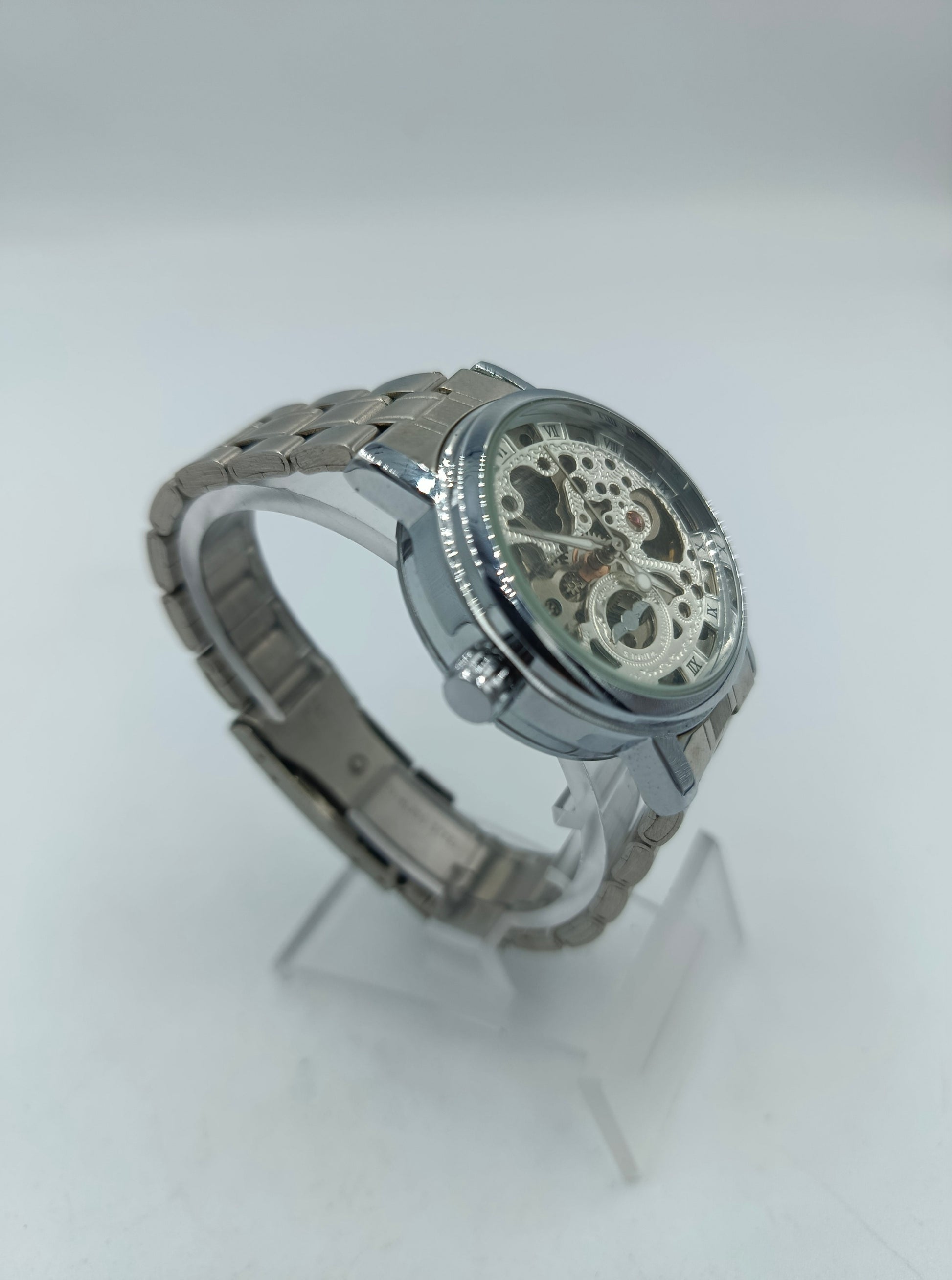 Auffällige Herrenarmbanduhr im modernen Skelett-Design. Das sichtbare Uhrwerk verleiht der Uhr einen technischen und eleganten Look. Gefertigt aus silberfarbenem Metall mit Gliederarmband – ein echter Hingucker für Liebhaber mechanischer Uhren.