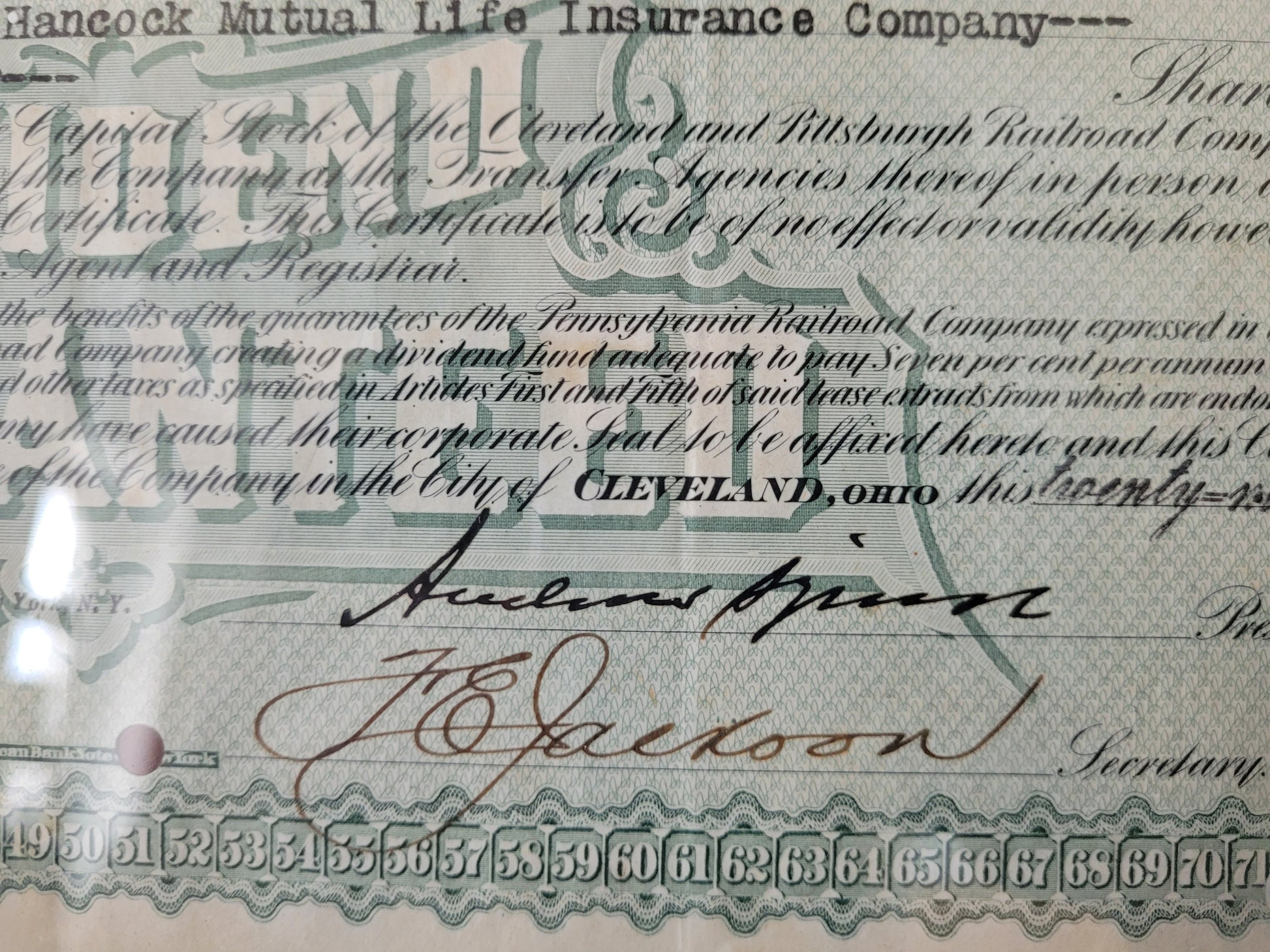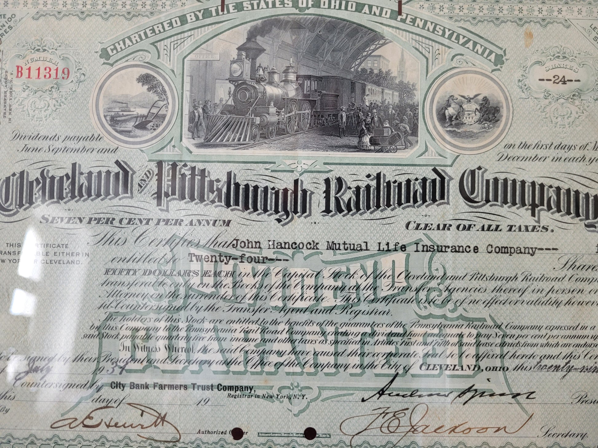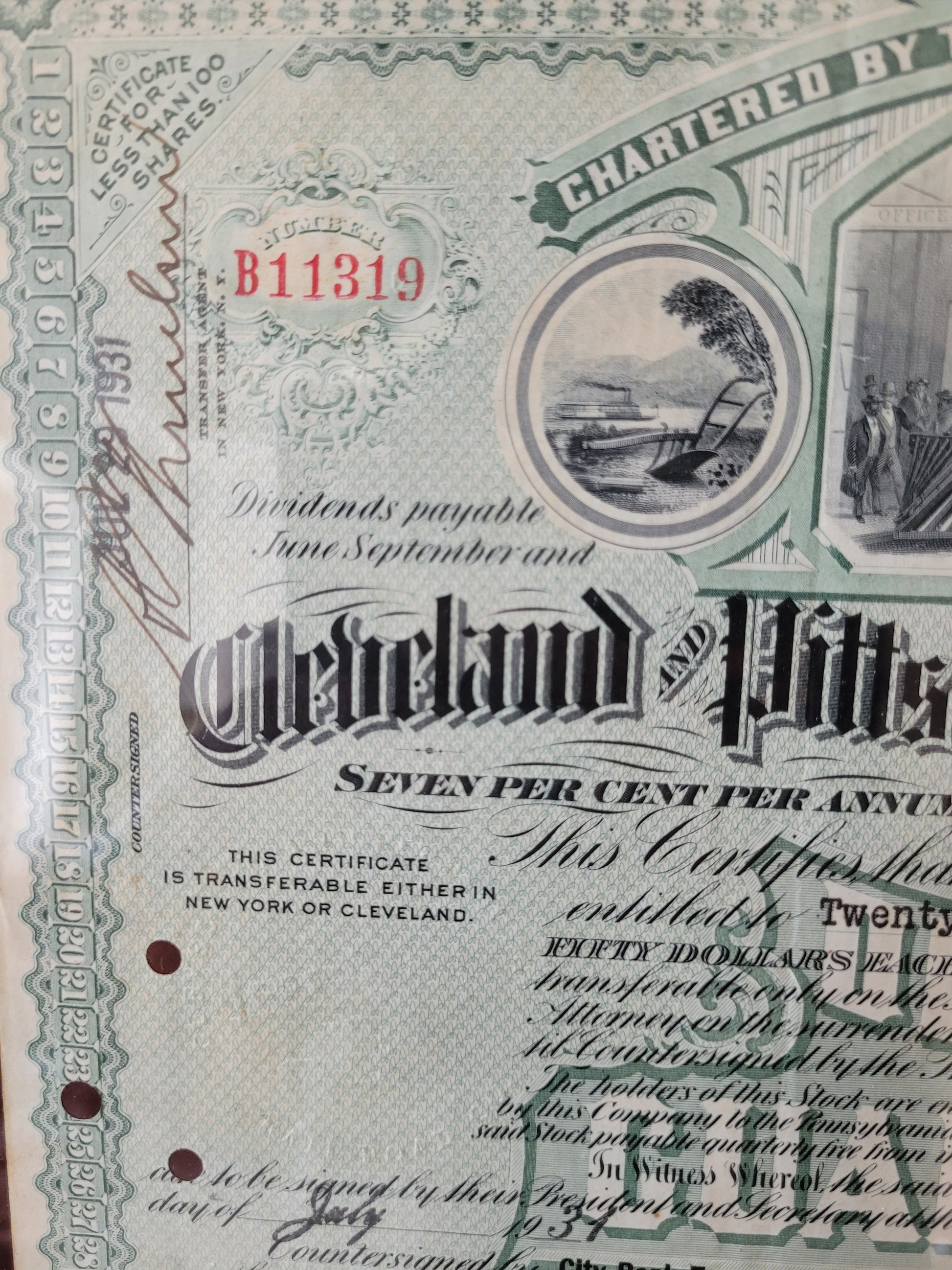 Angeboten wird eine historische Aktie der Cleveland and Pittsburgh Railroad, die einen faszinierenden Einblick in die Geschichte des amerikanischen Eisenbahnwesens gewährt. Diese antike Wertpapierurkunde stammt aus einer Zeit, in der Eisenbahngesellschaften die industrielle Entwicklung vorantrieben und wesentliche Transportverbindungen schufen. Die kunstvoll gestaltete Aktie ist ein bedeutendes Sammlerstück und ein wertvolles Dokument der US-amerikanischen Eisenbahngeschichte.