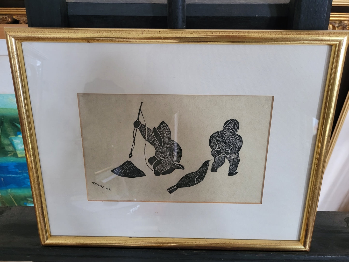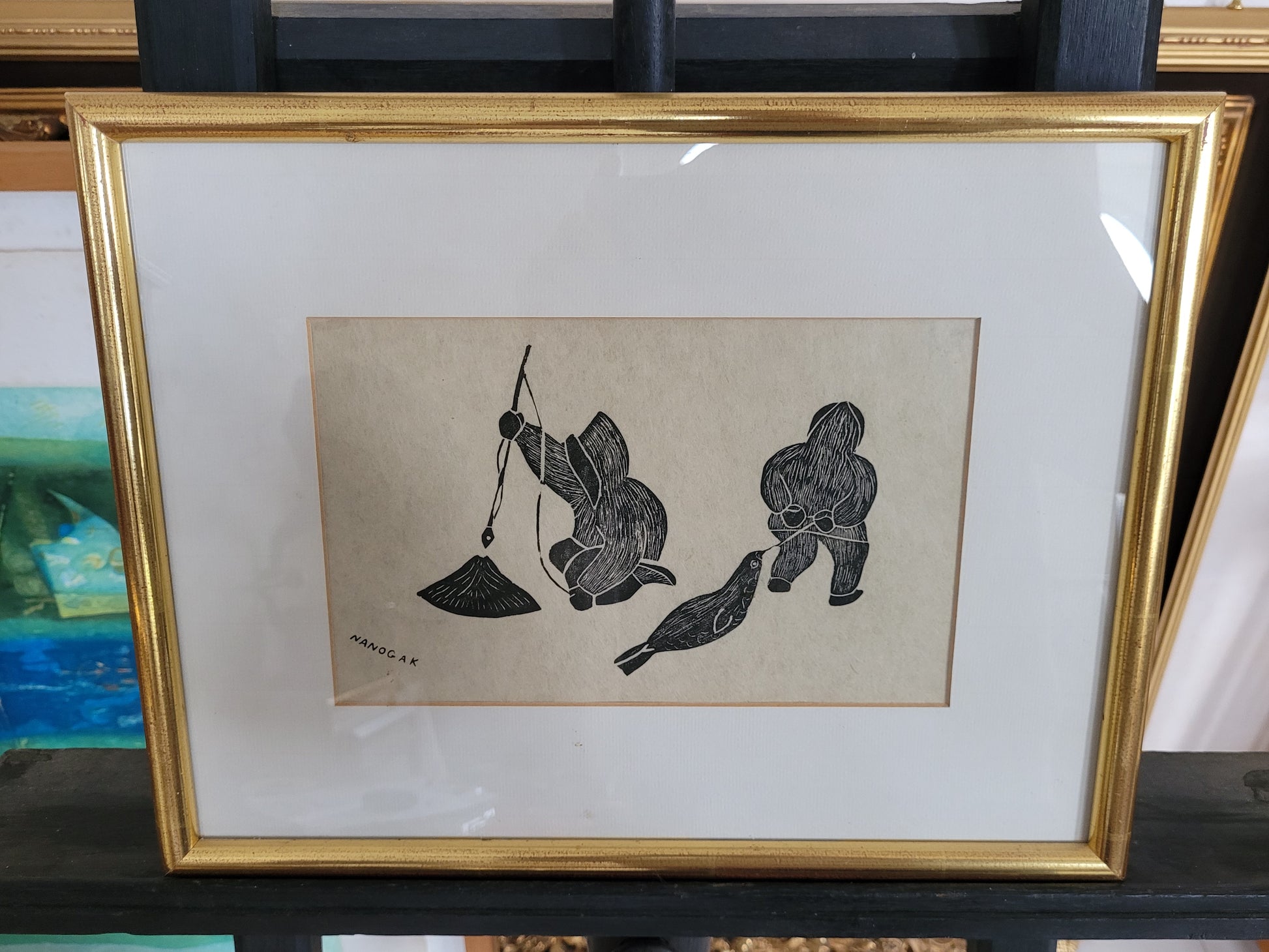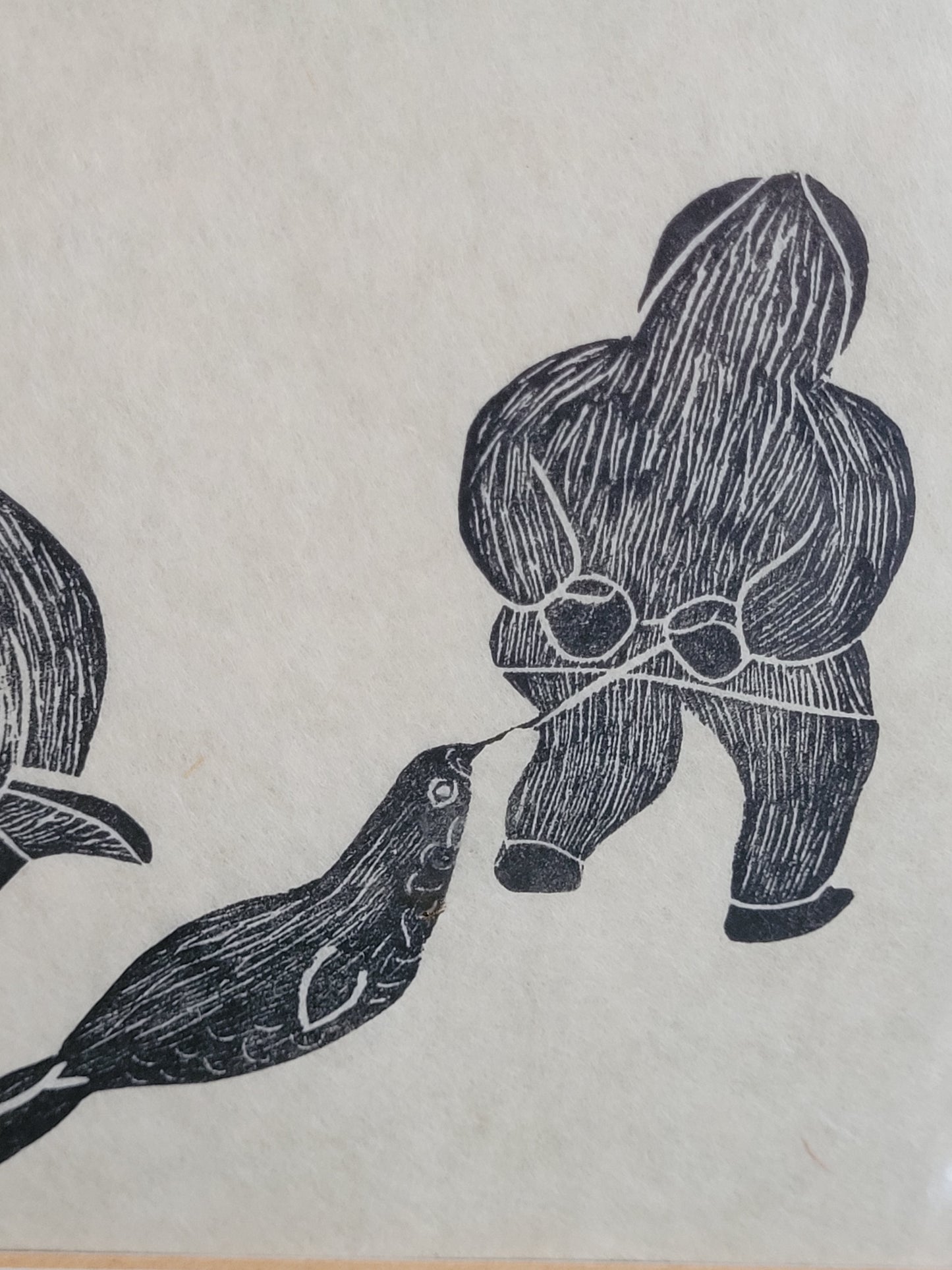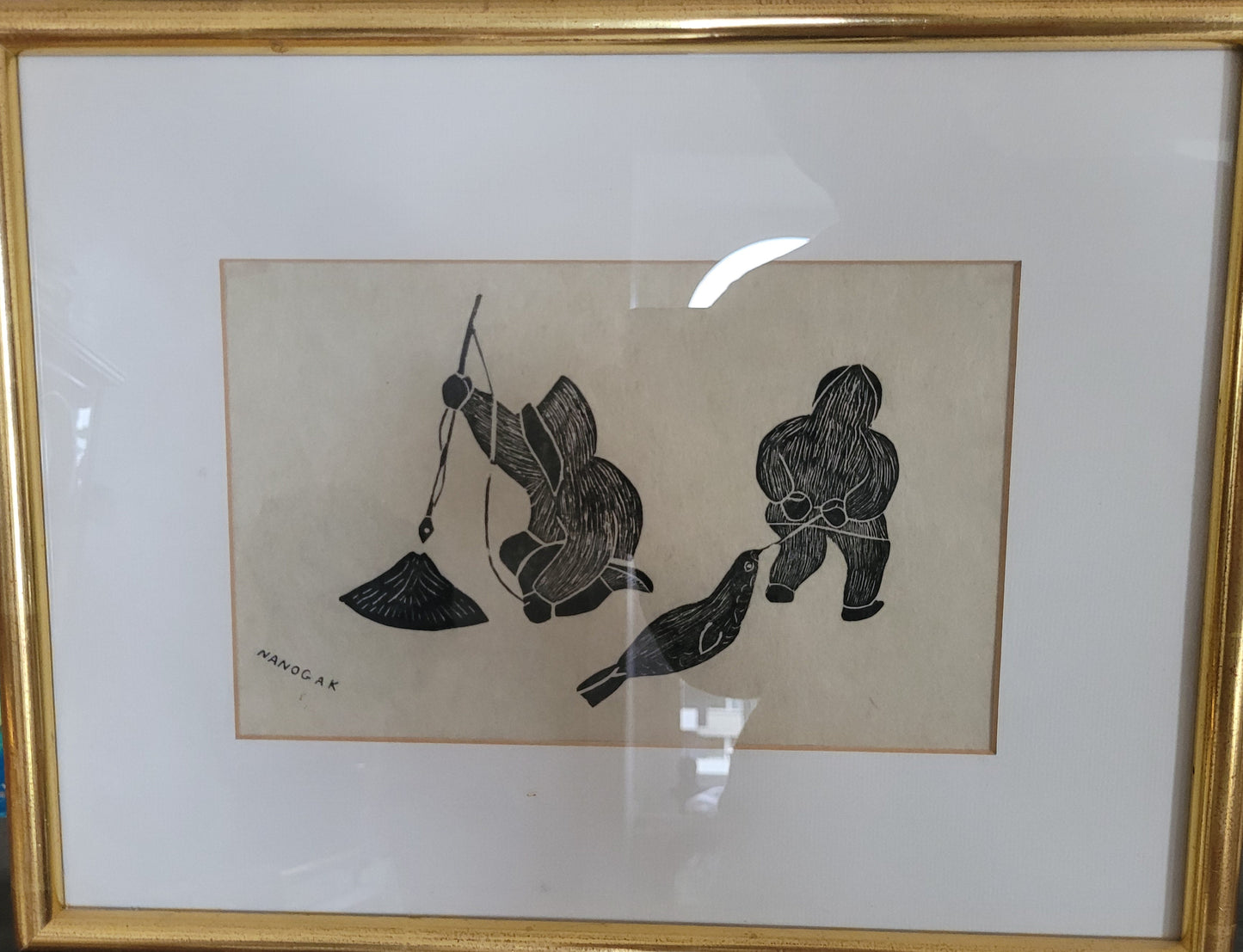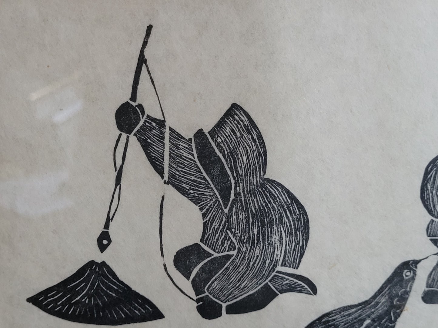 Dieser eindrucksvolle Holzschnitt zeigt zwei Fischer, wahrscheinlich Inuit, die in einer stimmungsvollen Szene beim Fischen zu sehen sind. Einer der Fischer hat sogar einen Seehund gefangen, was der Darstellung eine besondere Bedeutung verleiht. Das Kunstwerk ist signiert und in einem hochwertigen Rahmen präsentiert, dessen Maße 100 x 90 cm betragen. Ohne den Rahmen misst der Holzschnitt 70 x 60 cm.