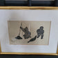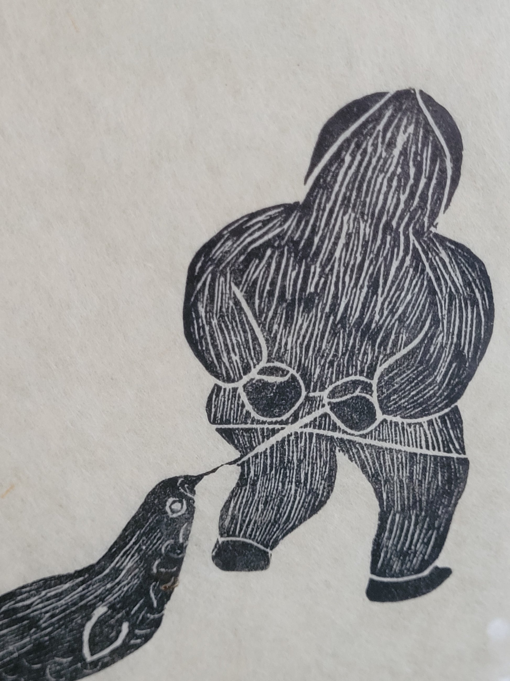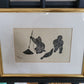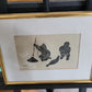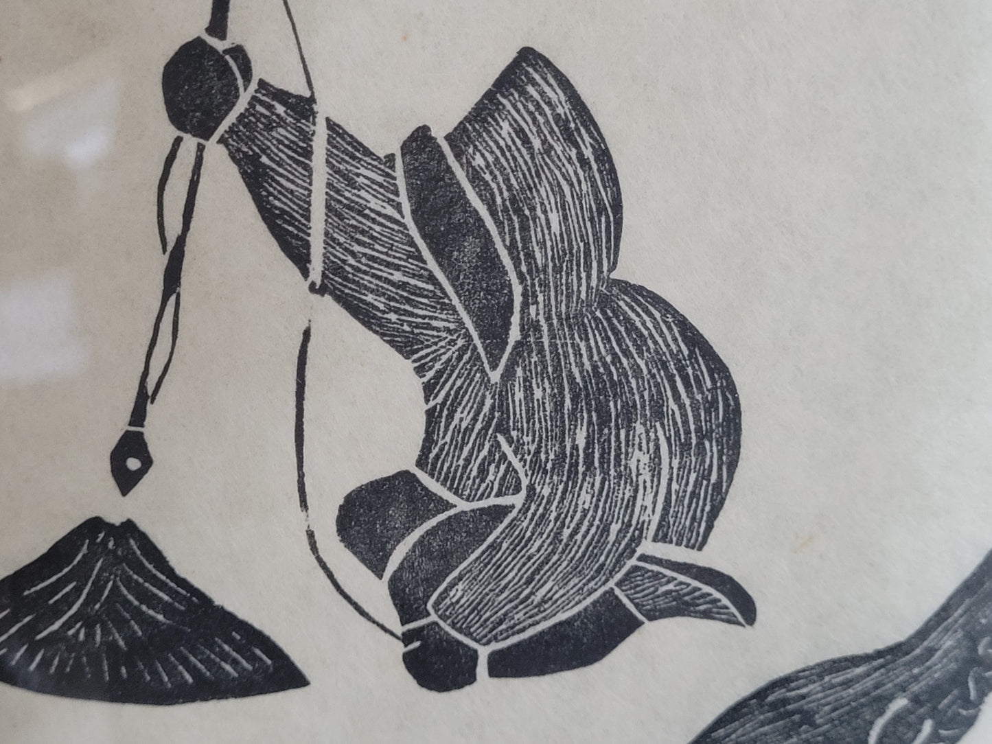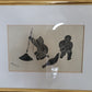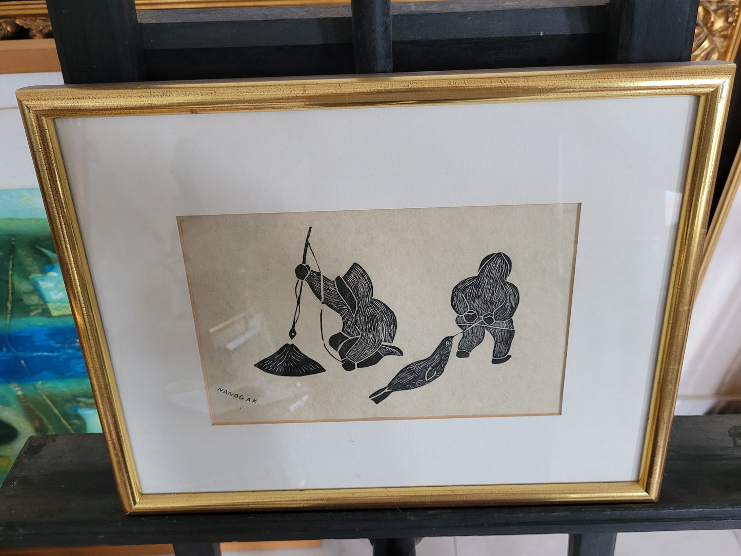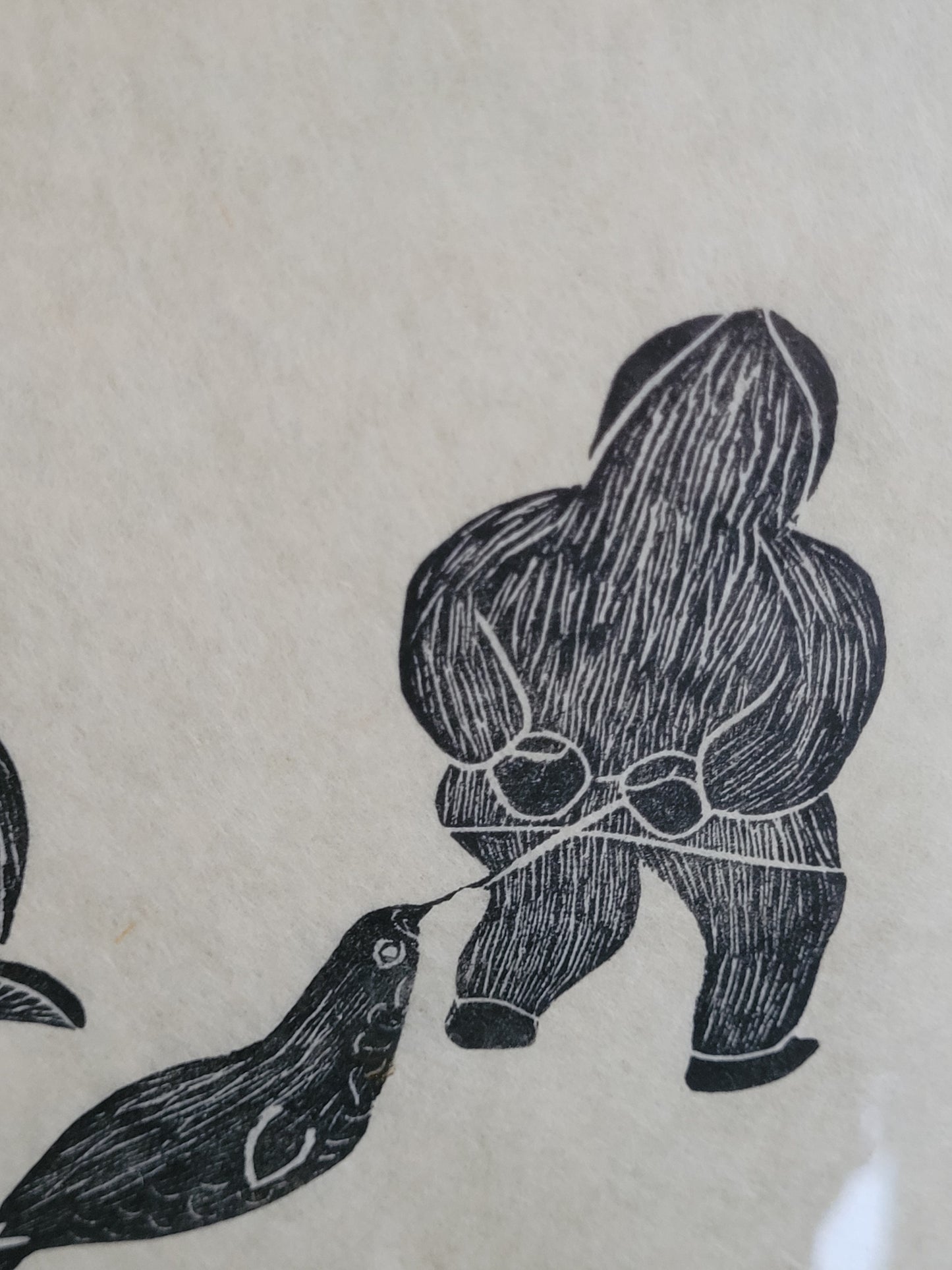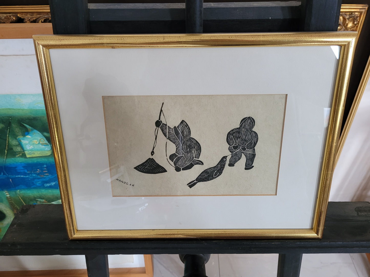Dieser eindrucksvolle Holzschnitt zeigt zwei Fischer, wahrscheinlich Inuit, die in einer stimmungsvollen Szene beim Fischen zu sehen sind. Einer der Fischer hat sogar einen Seehund gefangen, was der Darstellung eine besondere Bedeutung verleiht. Das Kunstwerk ist signiert und in einem hochwertigen Rahmen präsentiert, dessen Maße 100 x 90 cm betragen. Ohne den Rahmen misst der Holzschnitt 70 x 60 cm.