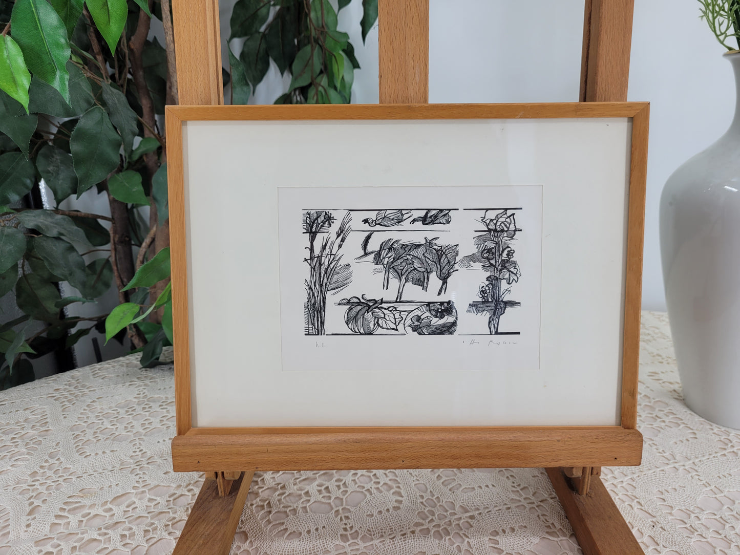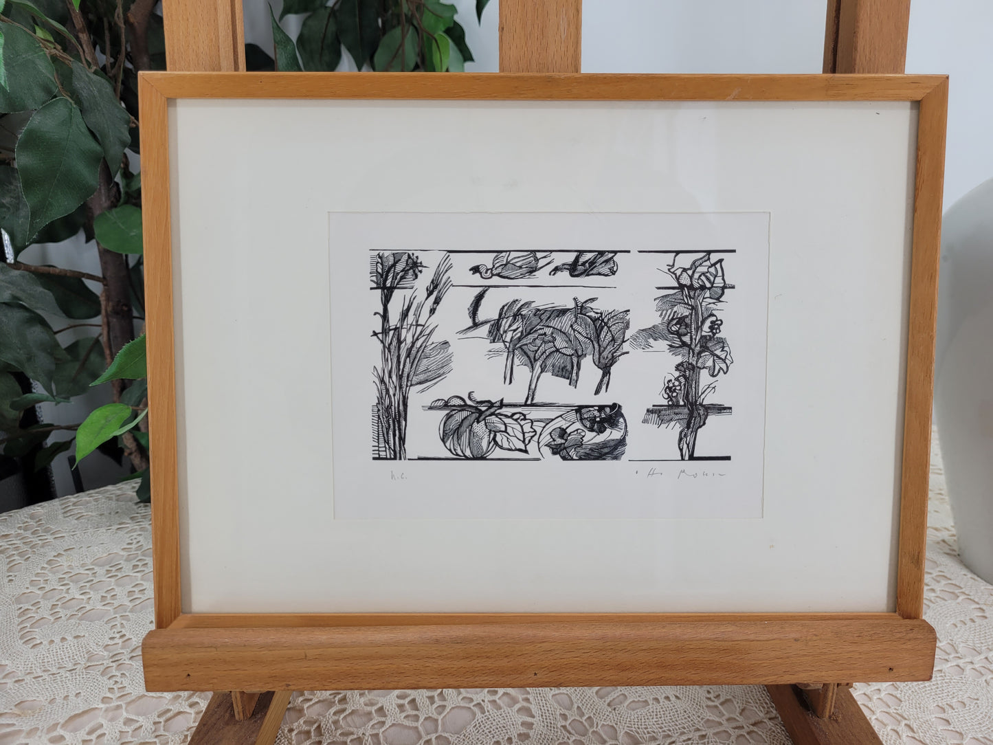 Beschreibung: Dieser feine Holzschnitt zeigt detaillierte Darstellungen von Pflanzen, die die Schönheit und Vielfalt der Natur einfangen. Das Werk ist signiert, was seine Authentizität und künstlerische Bedeutung unterstreicht. Der Holzschnitt ist hochwertig gerahmt, was ihre ästhetische Qualität zusätzlich hervorhebt. Mit Maßen von 22x30 cm mit Rahmen und 13x17 cm ohne Rahmen eignen sich diese Kunstwerke perfekt als elegante Ergänzung für jeden Raum. Trotz ihres Alters befinden sich dieser Holzschnitt in einem bemerkenswert guten Zustand, was ihre Wertigkeit für Sammler und Kunstliebhaber weiter steigert. Dieser Holzschnitt von Pflanzen sind nicht nur visuell ansprechend, sondern auch eine Hommage an die faszinierende Welt der Botanik, die jeden Betrachter erfreut und inspirier