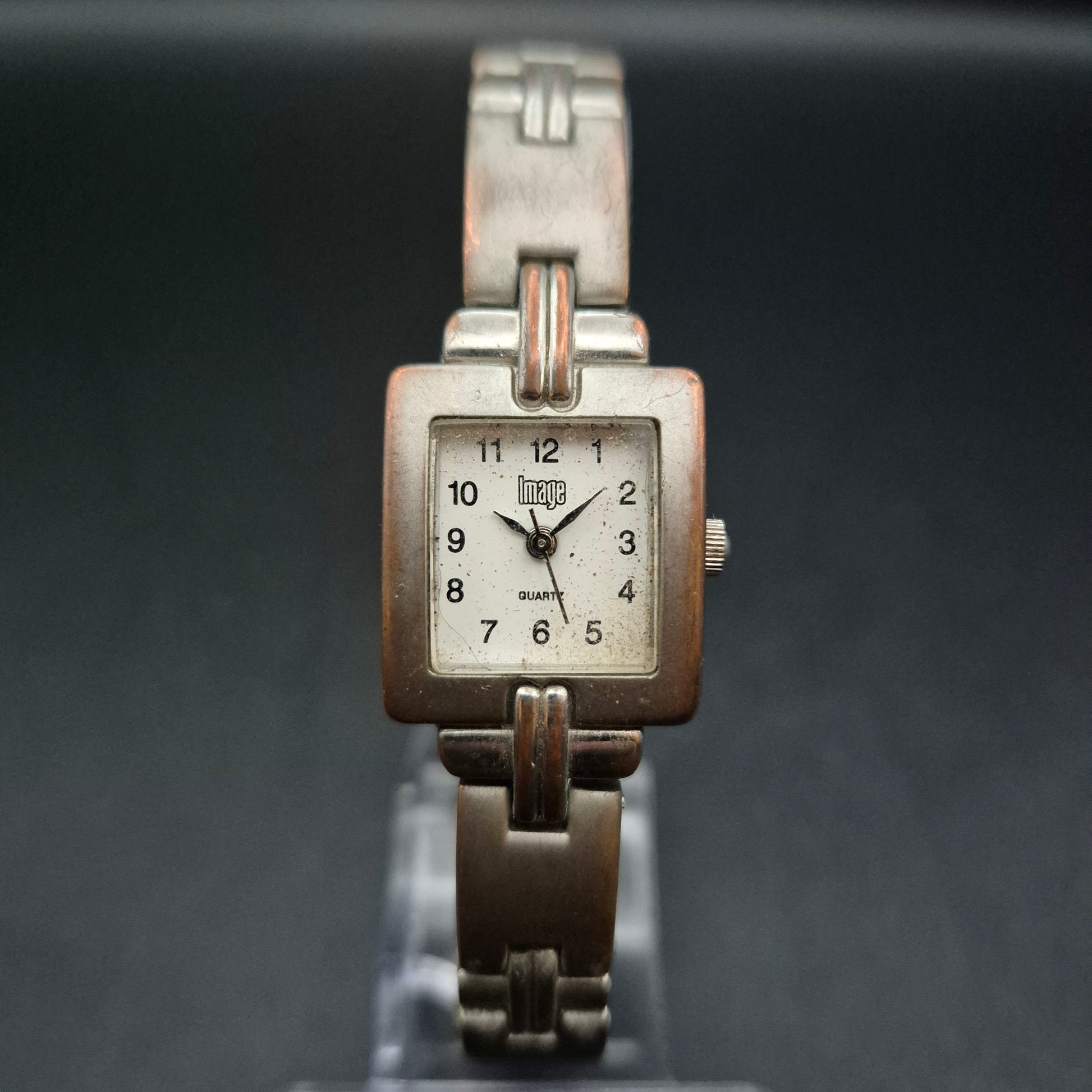Diese Damen Uhr der Marke Image überzeugt durch ein zeitlos schlichtes Design mit einem rechteckigen Gehäuse und silberfarbenem Gliederarmband. Das weiße Zifferblatt mit schwarzen Zahlen ist klar und gut lesbar gestaltet. Eine ideale Uhr für den täglichen Gebrauch mit einem Hauch Retro-Charme.