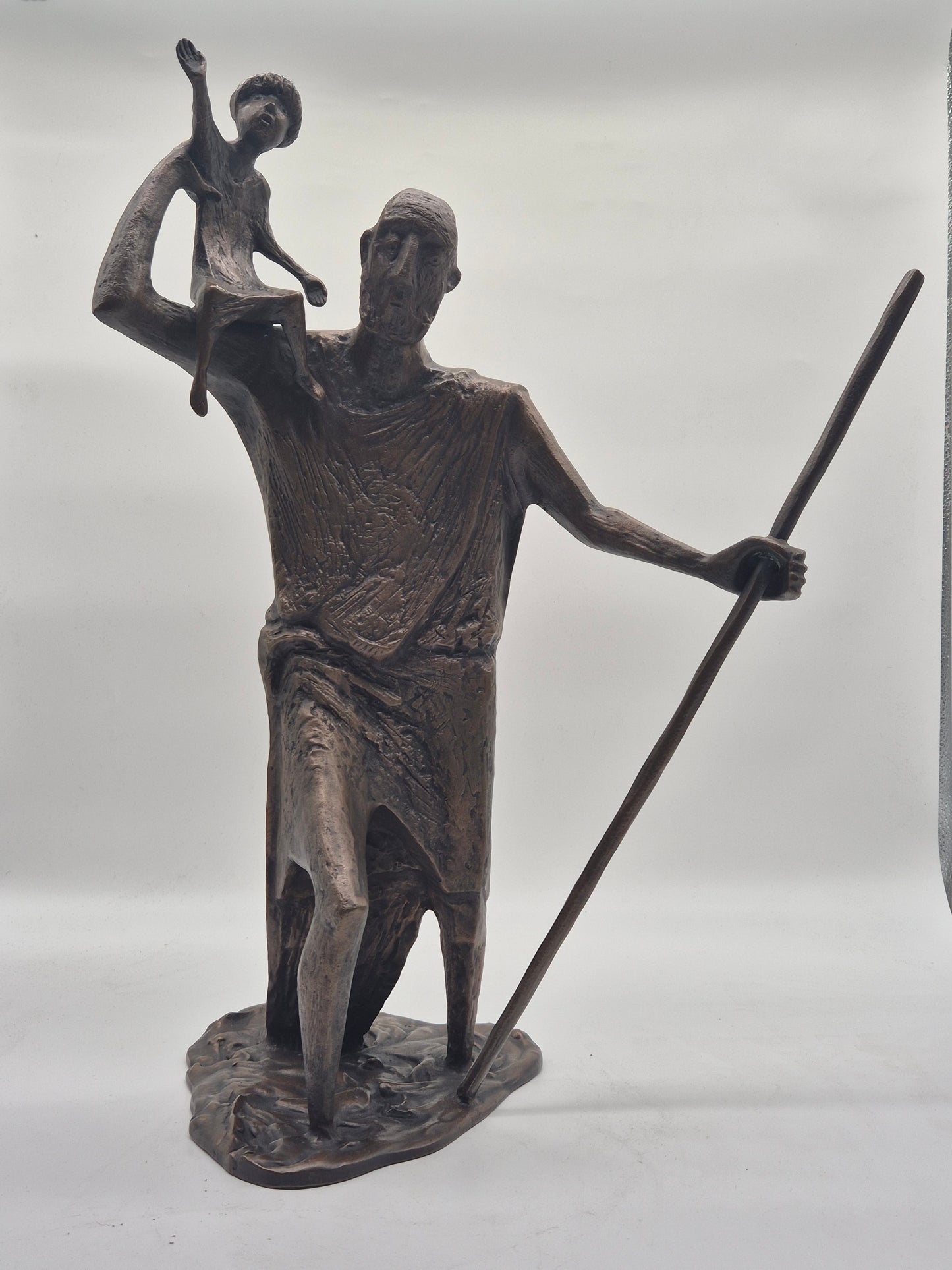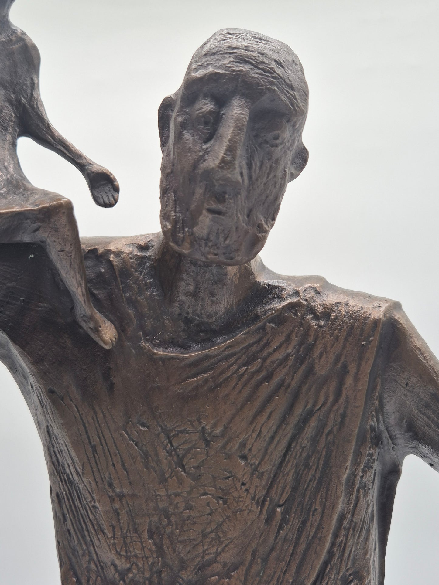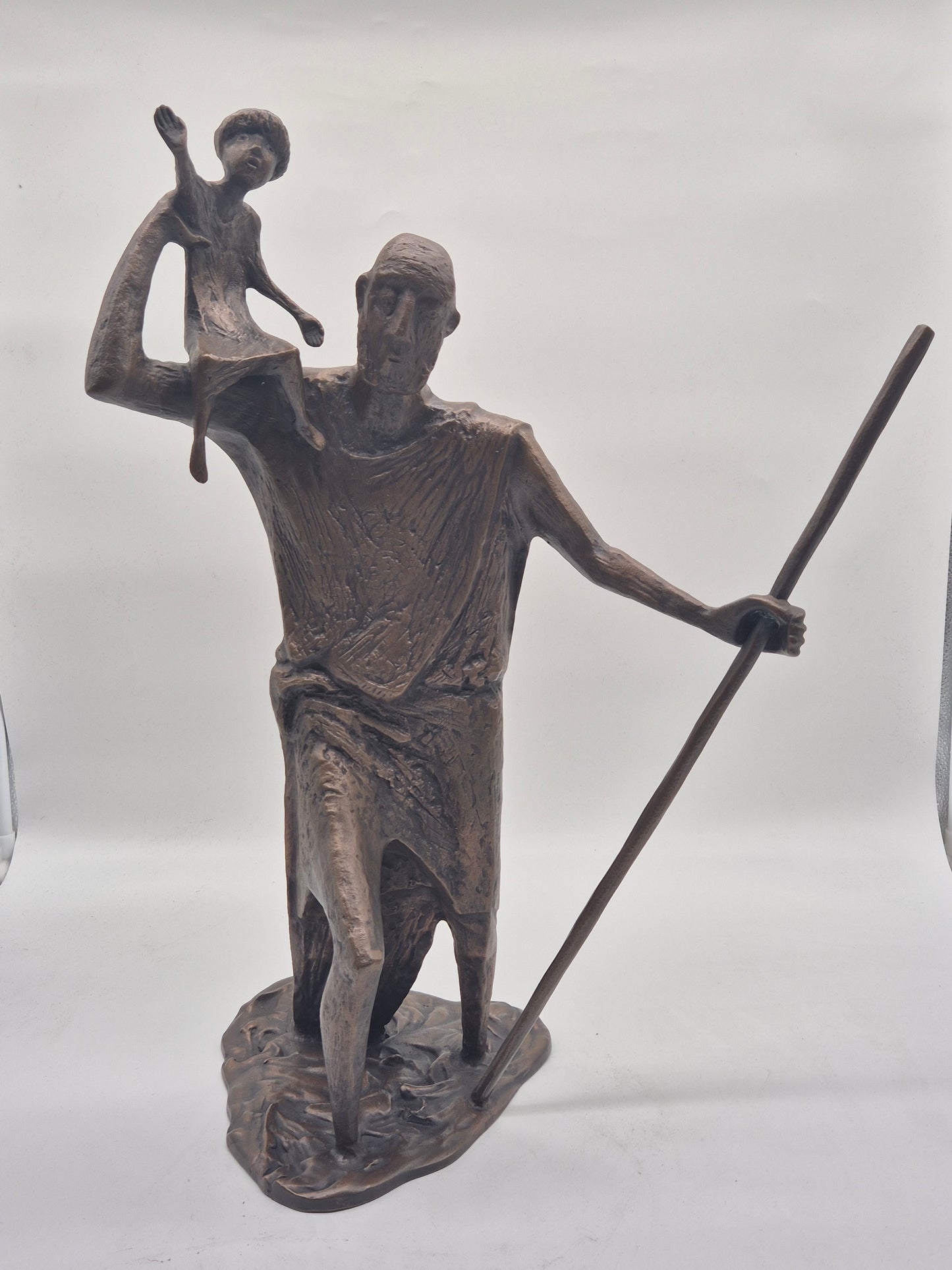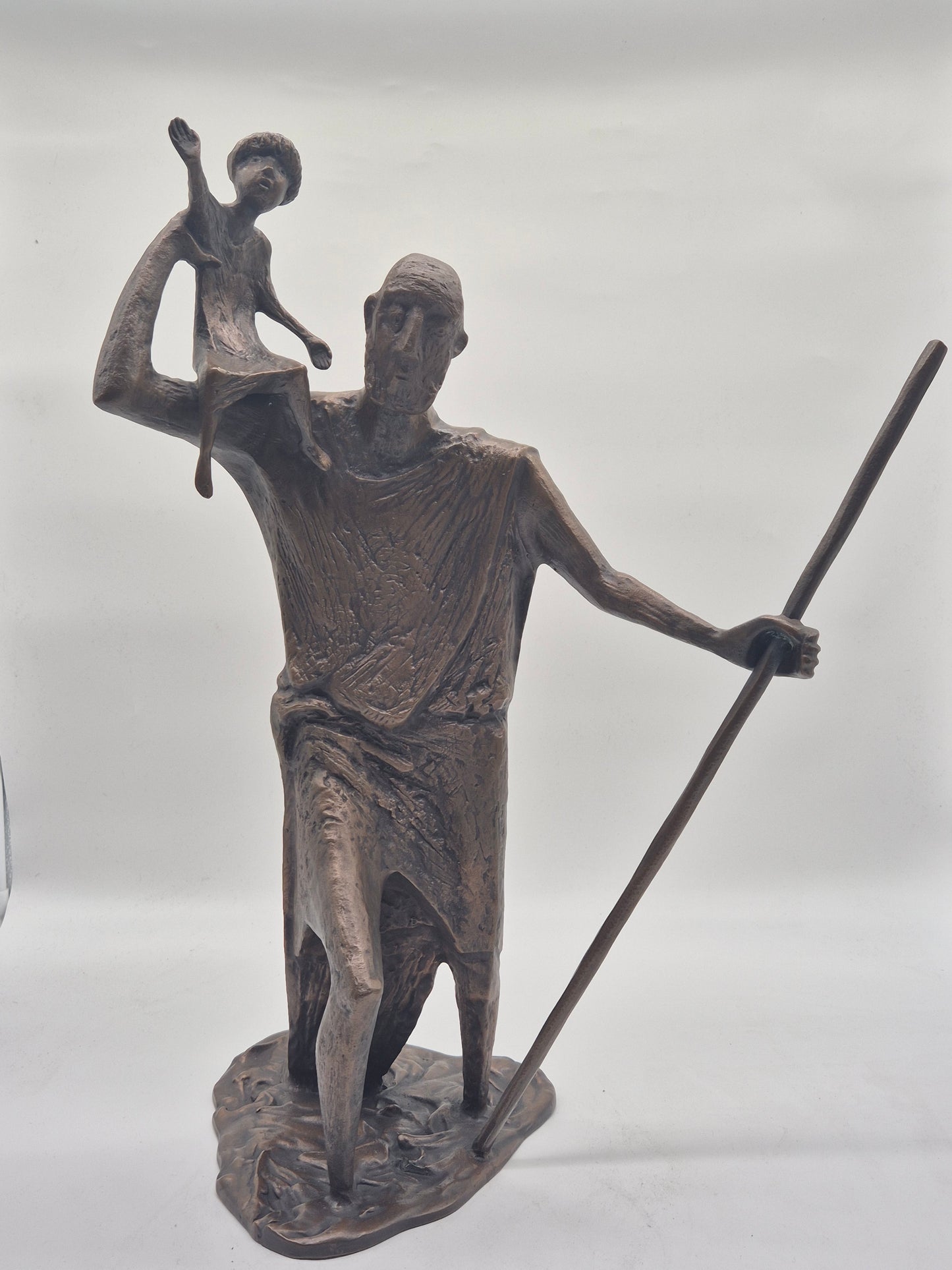 Tauchen Sie ein in die Welt der Urzeit mit dieser beeindruckenden Bronzeskulptur „Hl. Christophorus mit dem Jesuskind”. Diese meisterhaft gearbeitete Skulptur fängt einen kraftvollen Moment ein: Ein prähistorischer Mensch trägt schützend sein Kind auf der Schulter, während er mit festem Griff einen Stock in der Hand hält. Die eindrucksvolle Größe von 55 cm Höhe und 43 cm Breite, gepaart mit einem Gewicht von ca. 20 kg, verleiht dieser Skulptur eine beeindruckende Präsenz.