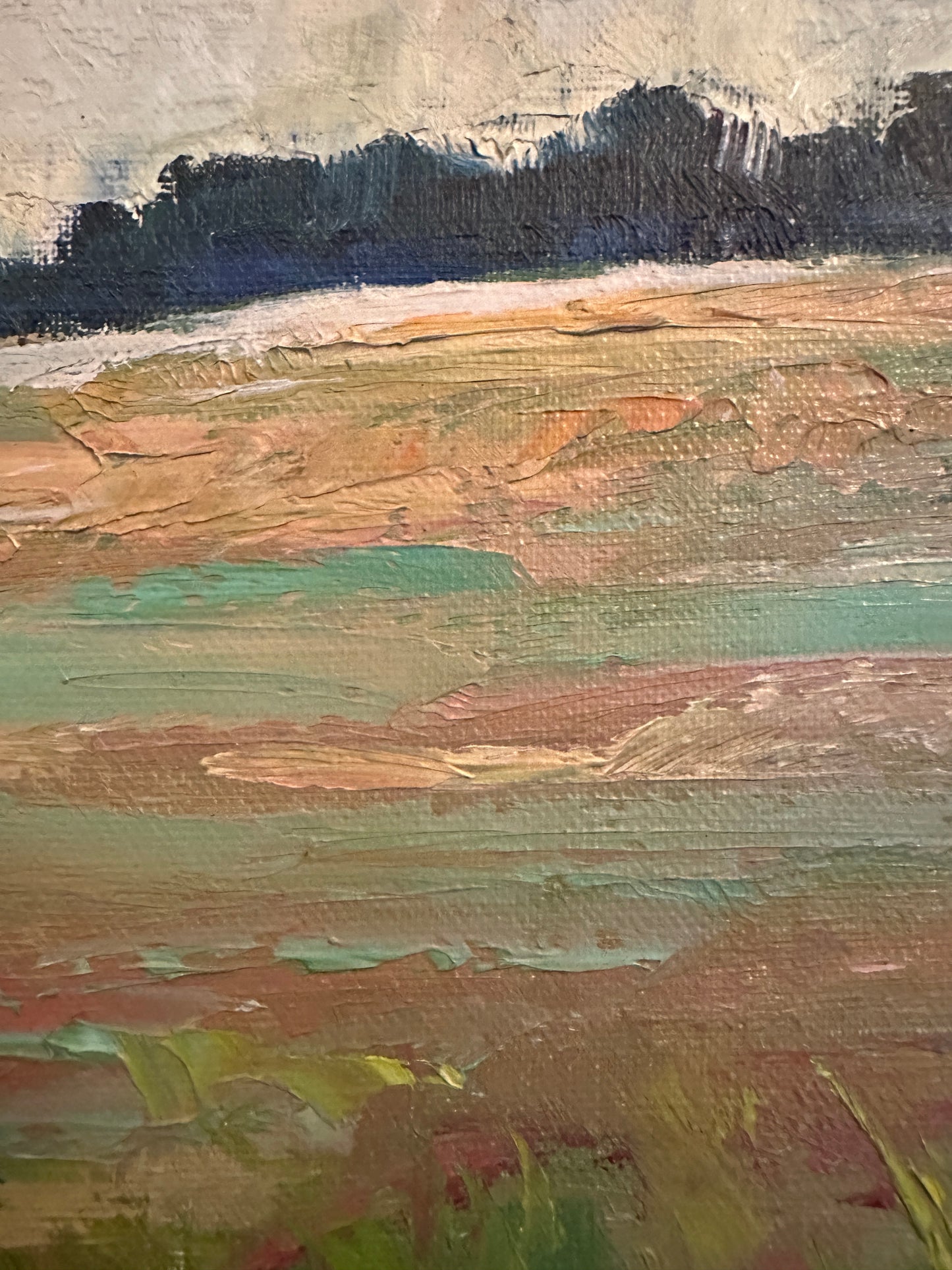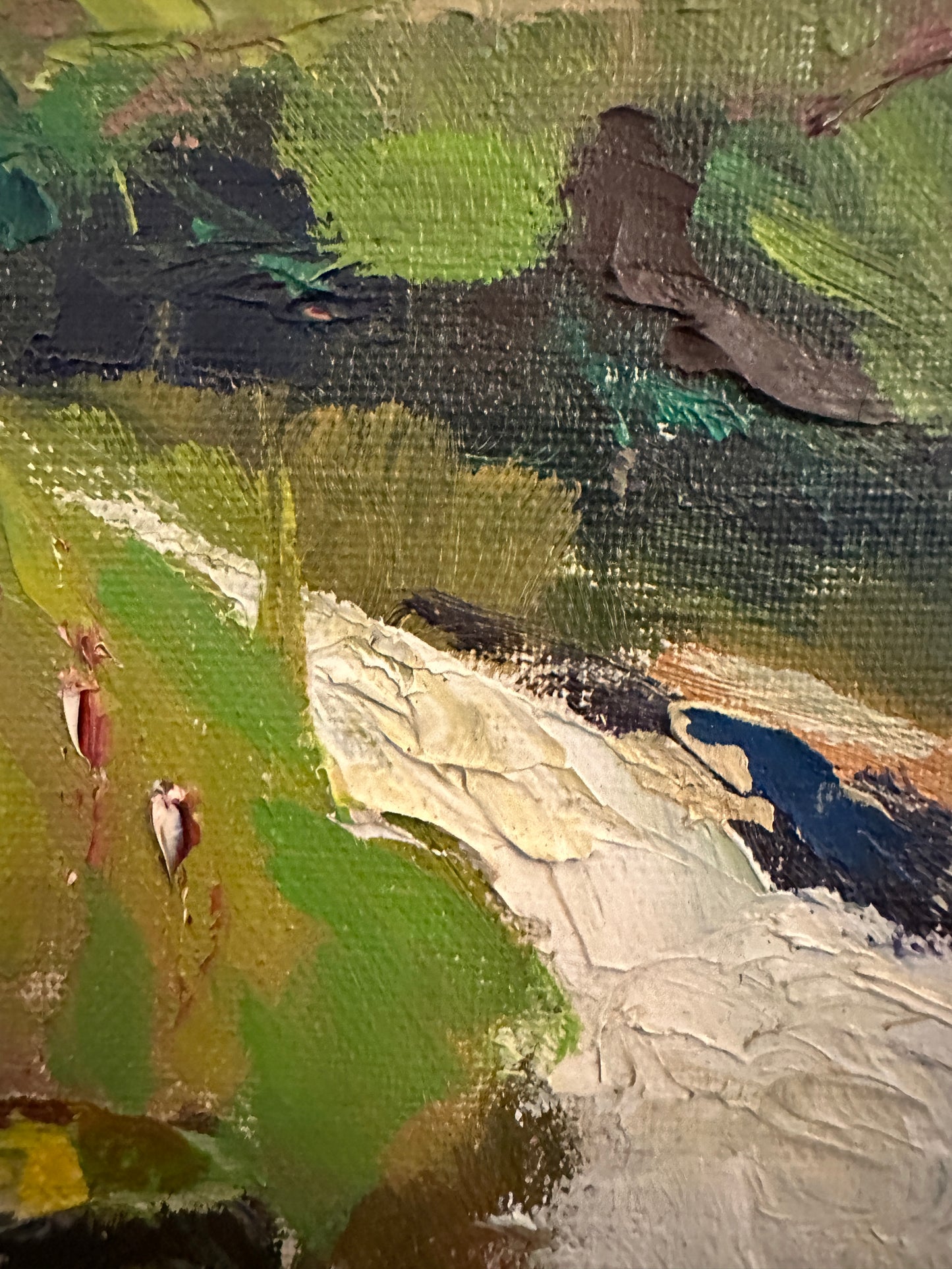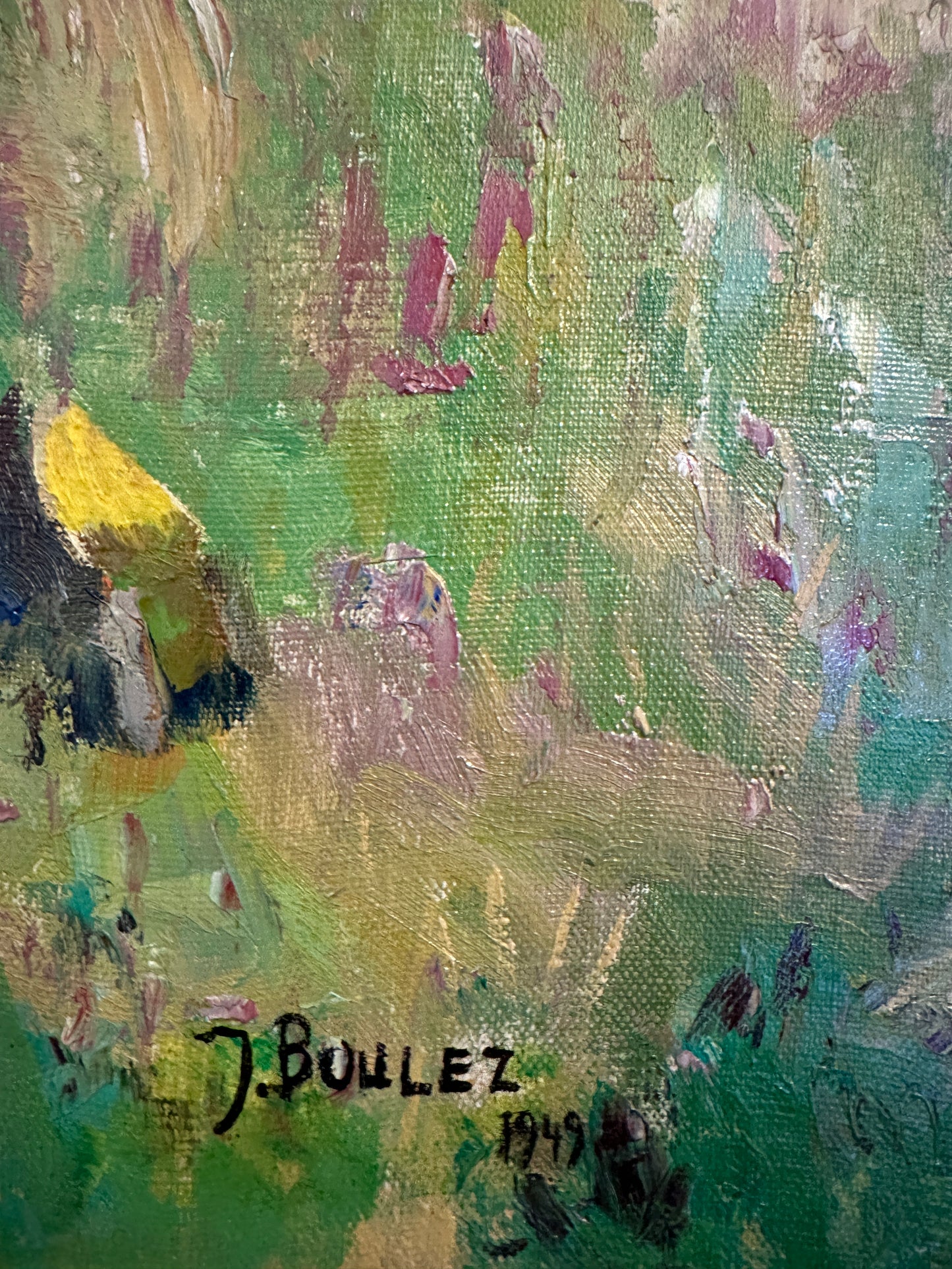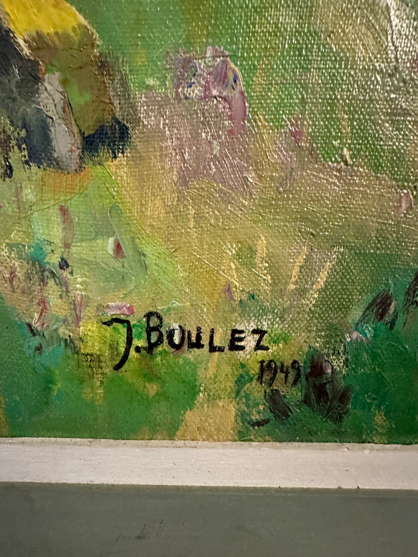 Beschreibung: Tauchen Sie ein in eine faszinierende Landschaft mit diesem handsignierten Ölgemälde von J. Boulez (XX). Das Kunstwerk auf Malkarton, gemalt mit der Technik Öl, präsentiert eine interessante Szenerie mit Tannen und einem kleinen Bach. Die dynamische Darstellung verleiht der Landschaft Wärme und einen faszinierenden Kontrast.