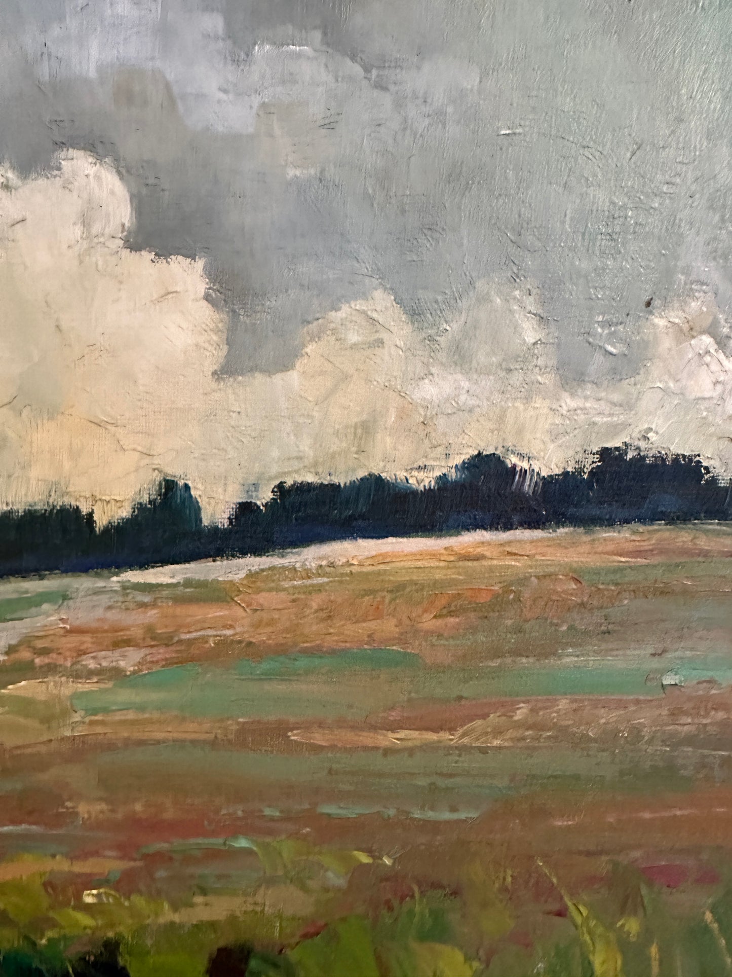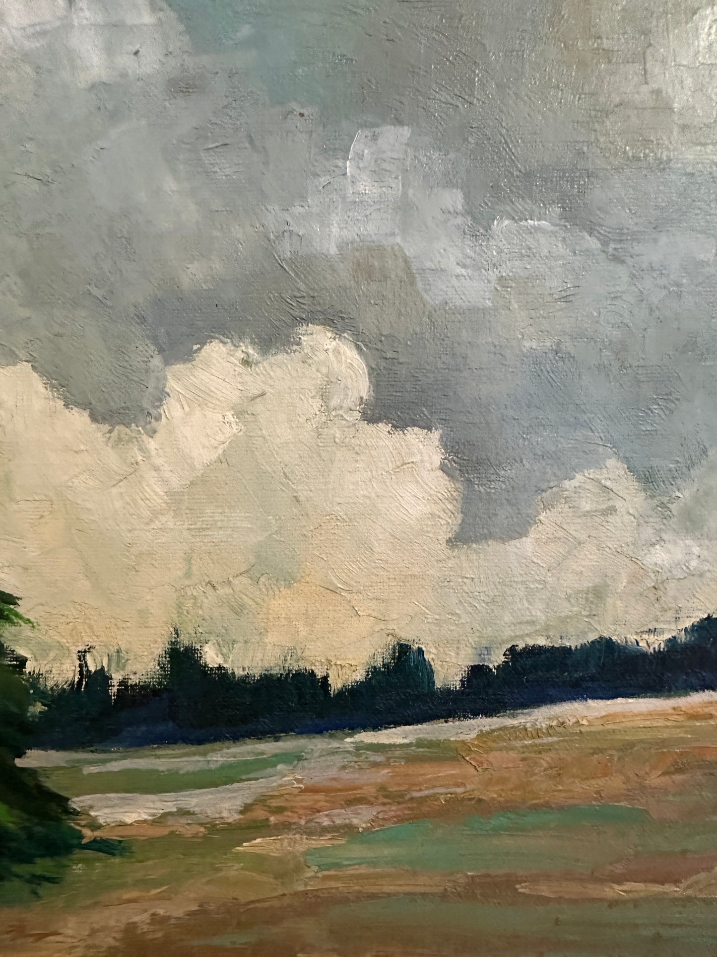 Die meisterhafte Handsignatur von J. Boulez ziert dieses lebhafte Gemälde, das eine reiche Landschaft mit Tannen und einem Bach präsentiert. Die geschickte Verwendung von Farben schafft eine beeindruckende Tiefe, während der Kontrast zwischen der Wärme im Vordergrund und der sich entwickelnden Gewitterfront in der Ferne eine fesselnde Atmosphäre erzeugt. Ein ideales Stück für Kunstliebhaber, die dynamische und kontrastreiche Landschaften schätzen.