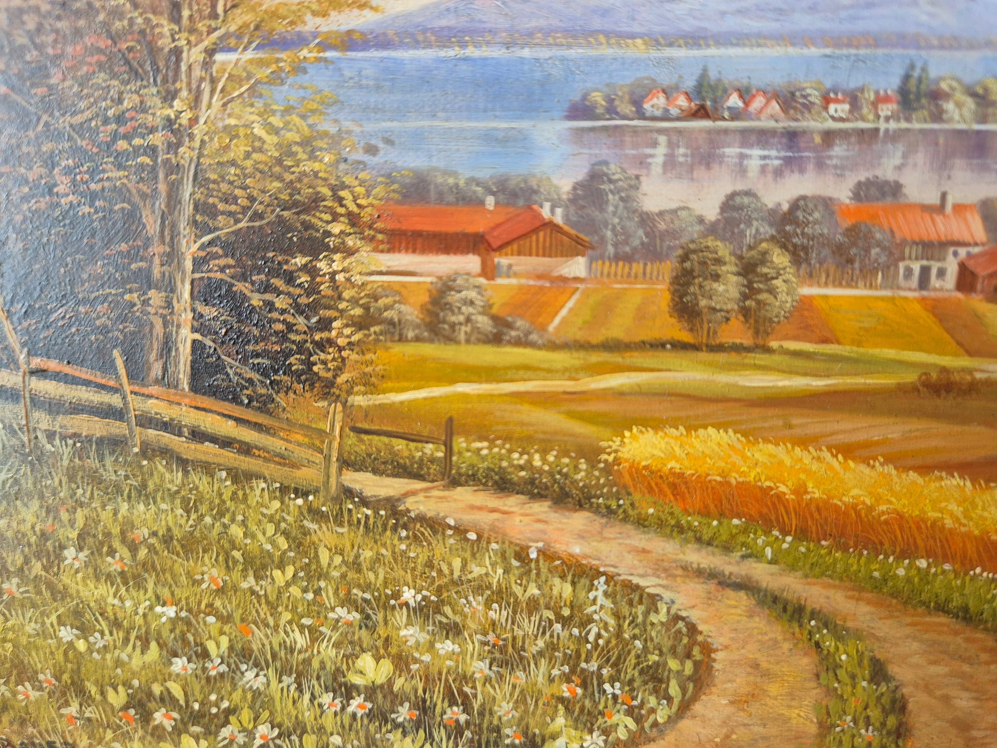 Josef Hofbauer (1907-1998) Ölgemälde Weite Landschaft mit Blick auf das Dorf, den See und die Berge