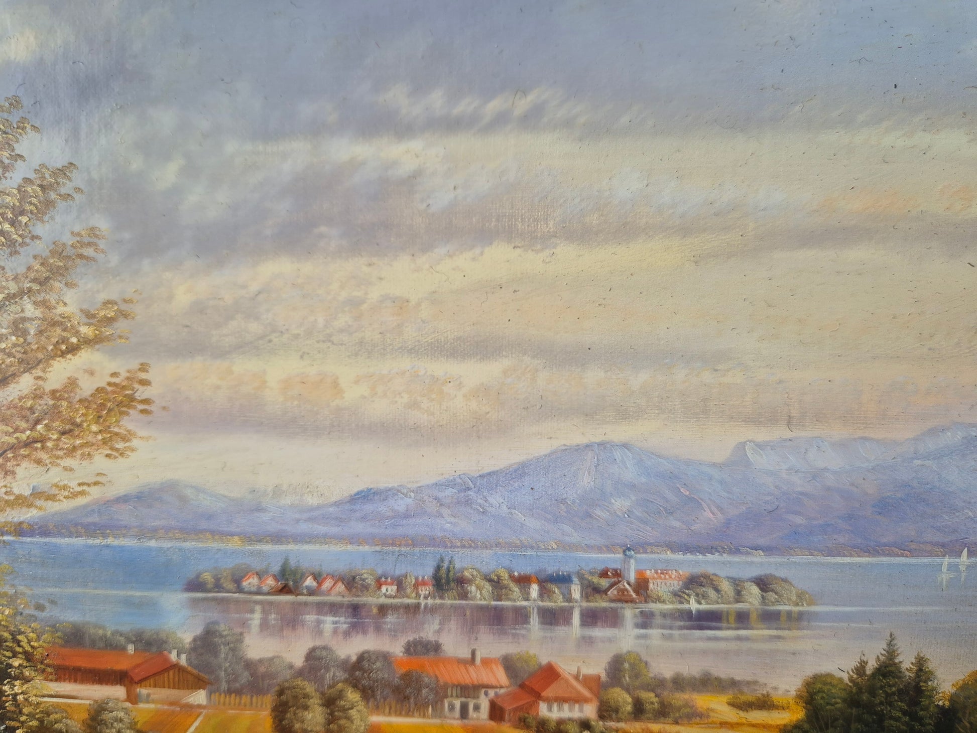 Dieses idyllische Ölgemälde von Josef Hofbauer zeigt einen sonnigen Sommertag am Chiemsee, mit malerischem Blick auf die bekannte Fraueninsel. Die ruhige Wasseroberfläche, das klare Licht und die weiche Farbgebung erzeugen eine friedliche und einladende Atmosphäre. Die Komposition ist fein ausbalanciert und vermittelt die besondere Stimmung eines sommerlichen Tages in der bayerischen Seenlandschaft. Das Werk ist handsigniert, wurde in der Technik Öl auf Holz ausgeführt und befindet sich in einem sehr guten Zustand (siehe Fotos). Der elegante Rahmen unterstreicht die Qualität des Gemäldes – ein wunderschönes Stück für Liebhaber alpiner Landschaftsmalerei.