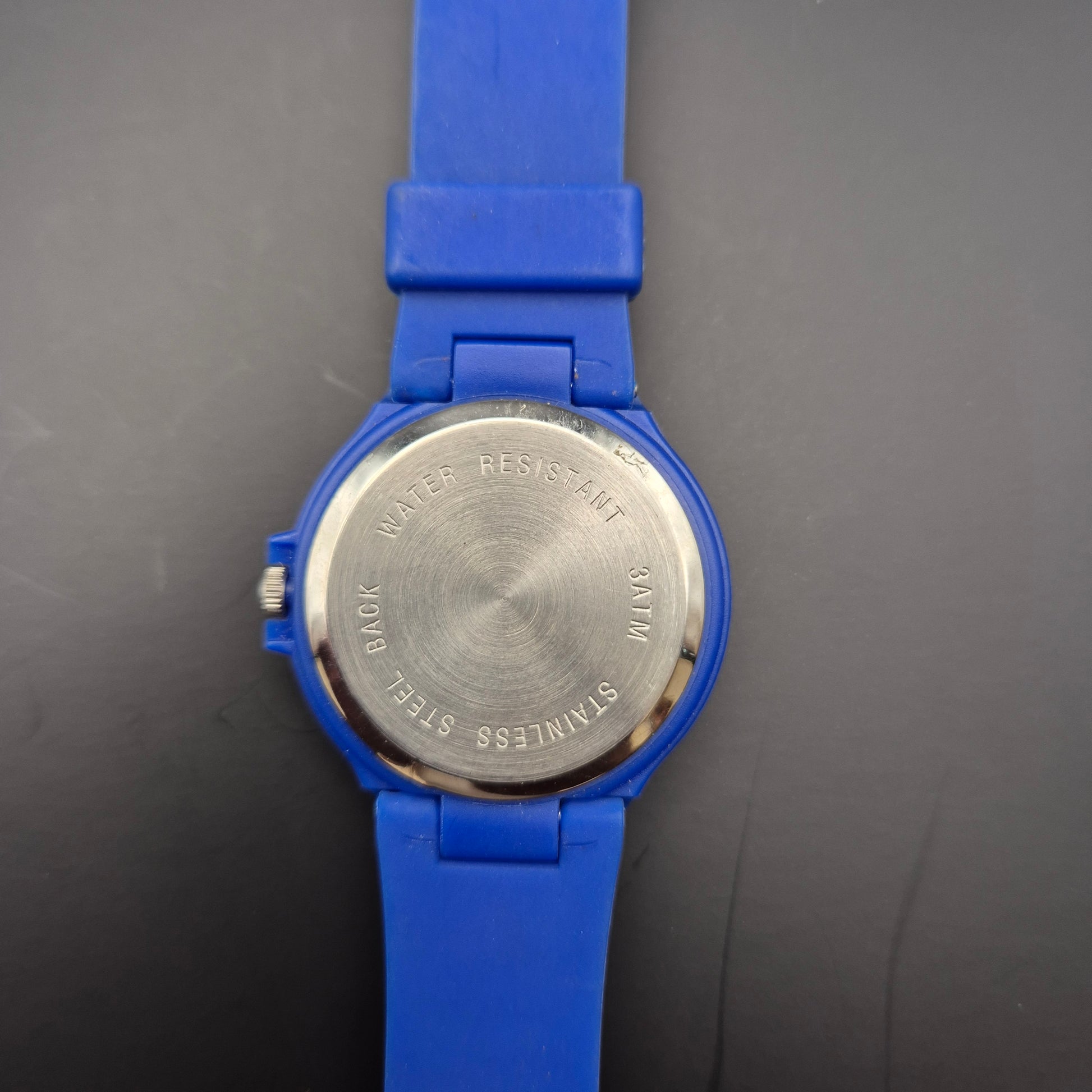 Diese Johnson’s Suncare Uhr ist ein farbenfrohes Accessoire mit Kultfaktor. Das Gehäuse in kräftigem Blau kombiniert sich mit einem auffälligen Armband in Orange-Blau, das mit Sonnenmotiven verziert ist. Auf dem weißen Zifferblatt strahlt eine fröhliche Sonne und verleiht der Uhr einen einzigartigen Sommer-Look. Mit 3 ATM Wasserdichtigkeit ist die Uhr spritzwassergeschützt und eignet sich perfekt als Sammlerstück oder für Fans außergewöhnlicher Designs.