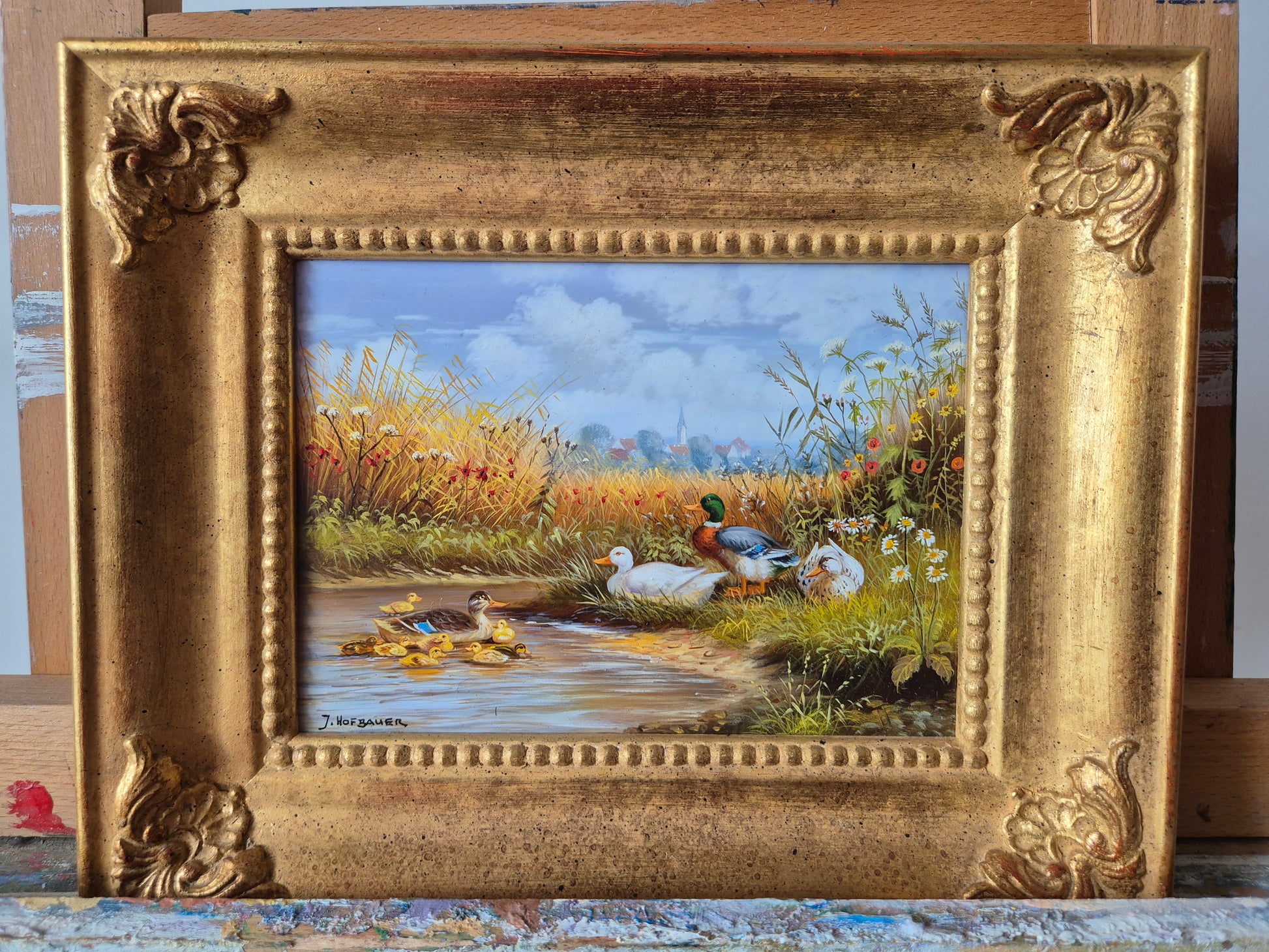 Dieses charmante Ölgemälde von Josef Hofbauer (1907–1998) zeigt eine idyllische ländliche Szene, in der einige Enten in ruhiger Umgebung am Wasser verweilen. Die Darstellung besticht durch eine natürliche Farbgebung und feine Detailarbeit, die die ländliche Stille und Harmonie besonders gut zur Geltung bringen. Hofbauer, bekannt für seine gefühlvollen Landschaften, bringt hier die Einfachheit des Landlebens in sanften Tönen und mit sicherem Pinselstrich zum Ausdruck. Das Werk ist handsigniert, wurde auf Holz gemalt und befindet sich in einem sehr guten Zustand. Ein liebevoll gerahmtes Bild – ideal für Sammler klassischer Natur- und Dorfmotive.