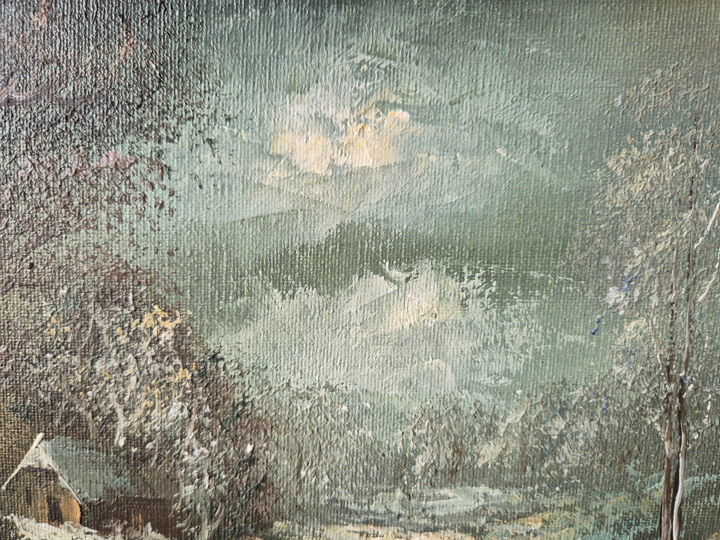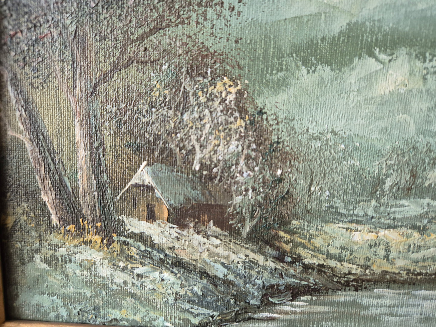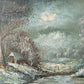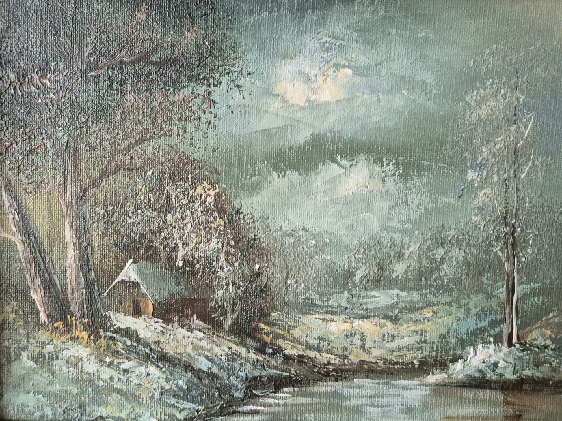 Europäische Schule (XX) Ölgemälde Winterabend am Bach mit Haus 25x31cm