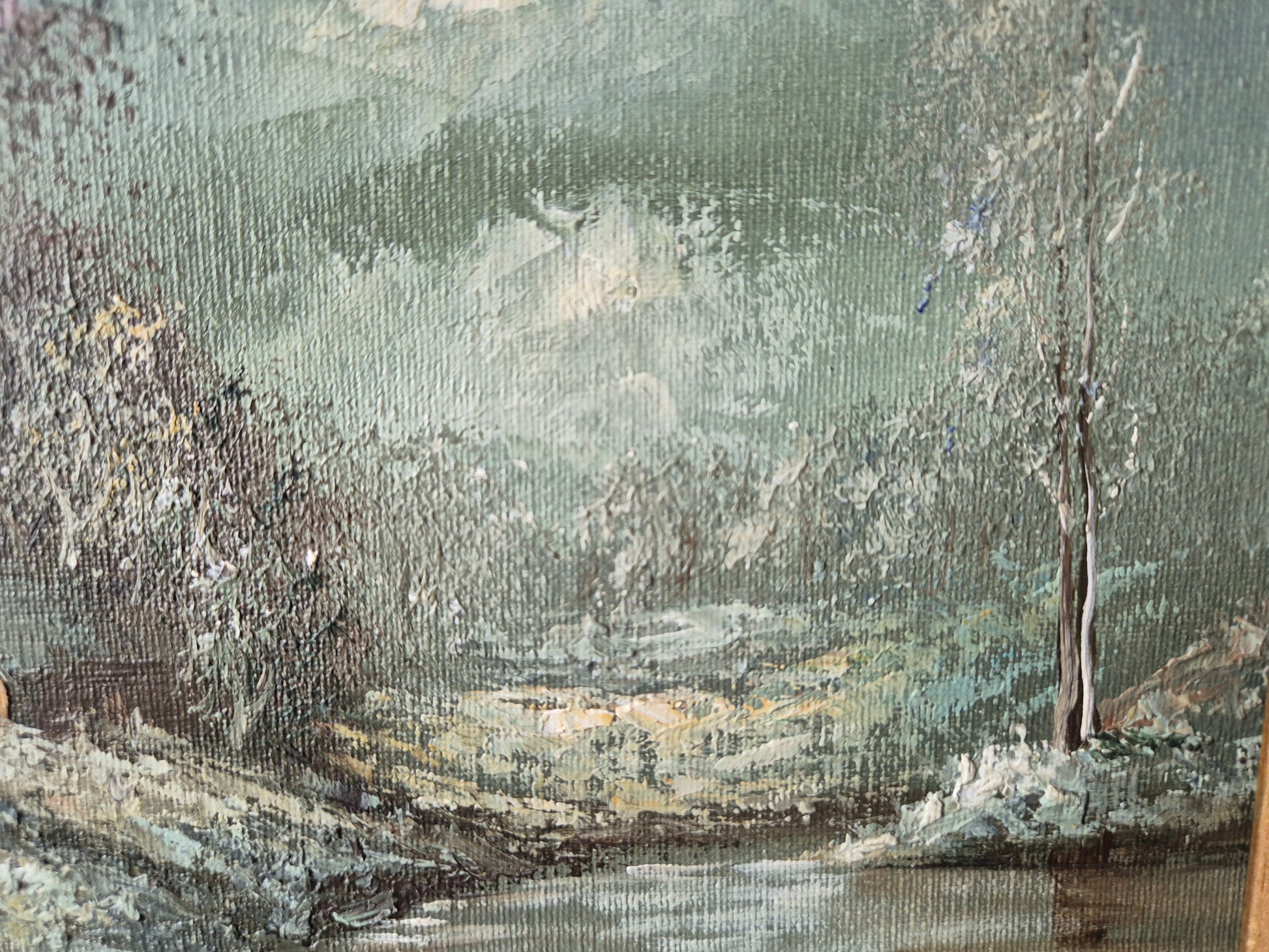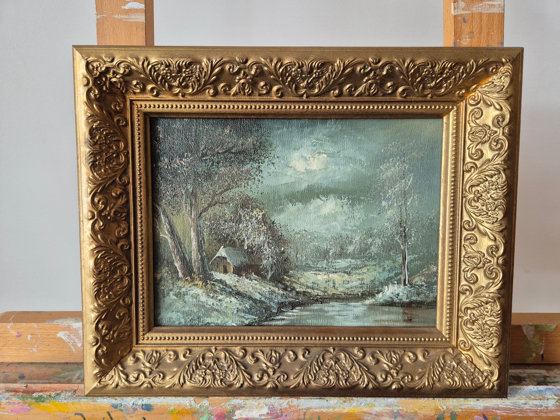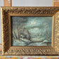 Dieses stimmungsvolle Ölgemälde der Europäische Schule (XX) zeigt einen ruhigen Winterabend an einem Bachlauf. Die Szenerie ist in sanften, kühlen Farbtönen gehalten und vermittelt eine besinnliche, fast romantische Atmosphäre. Die verschneite Landschaft, der stille Bach und die warme Lichtstimmung lassen die Ruhe des Winters eindrucksvoll spürbar werden.
