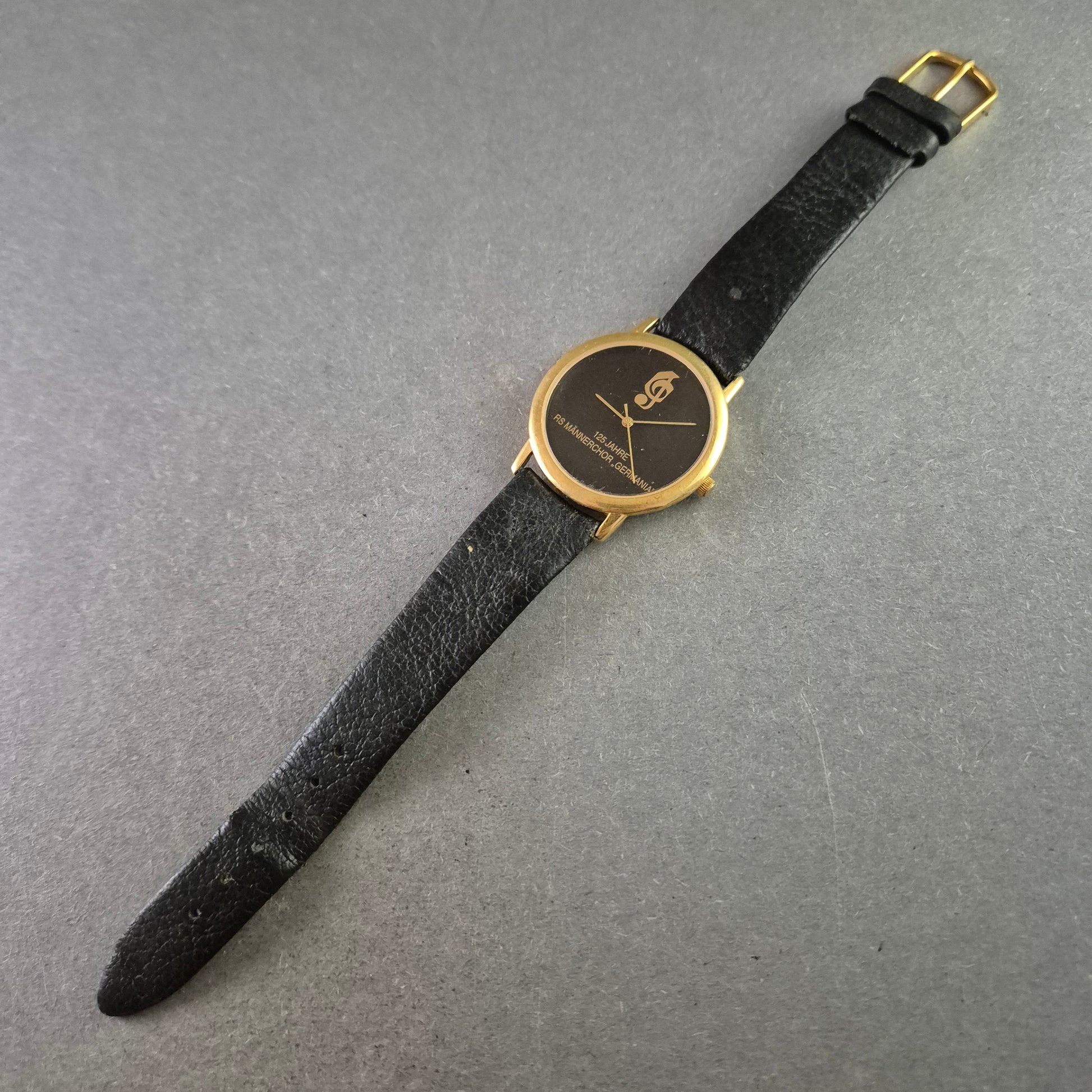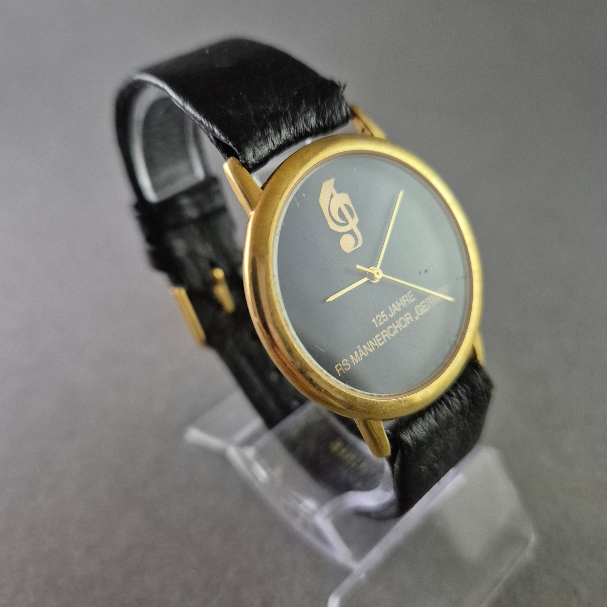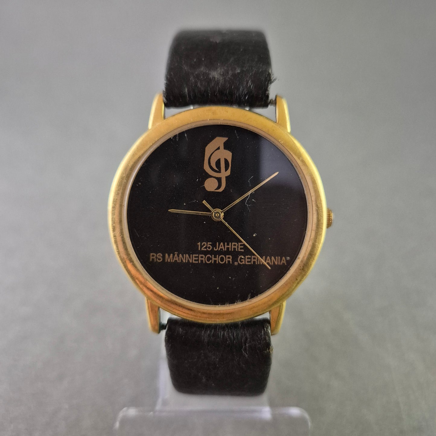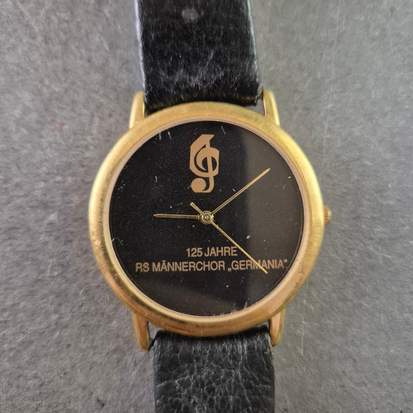 Diese Jubiläumsuhr wurde anlässlich des 125-jährigen Bestehens des RS Männerchor „Germania“ gefertigt. Mit einem schwarzen Zifferblatt, goldfarbenen Zeigern und dem stilisierten Musikschlüssel ist sie ein echtes Sammlerstück für Musikliebhaber. Das Gehäuse ist goldfarben, das Armband besteht echtem Leder in Schwarz.
