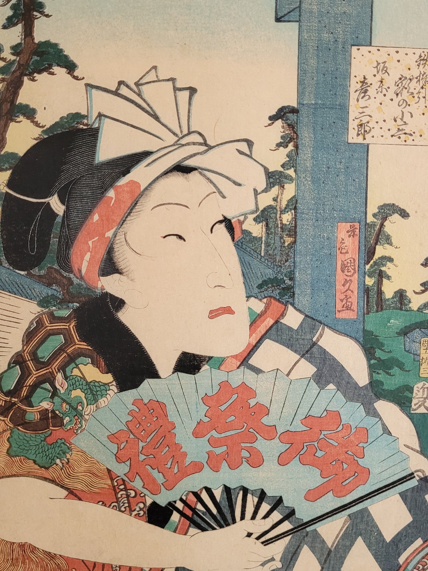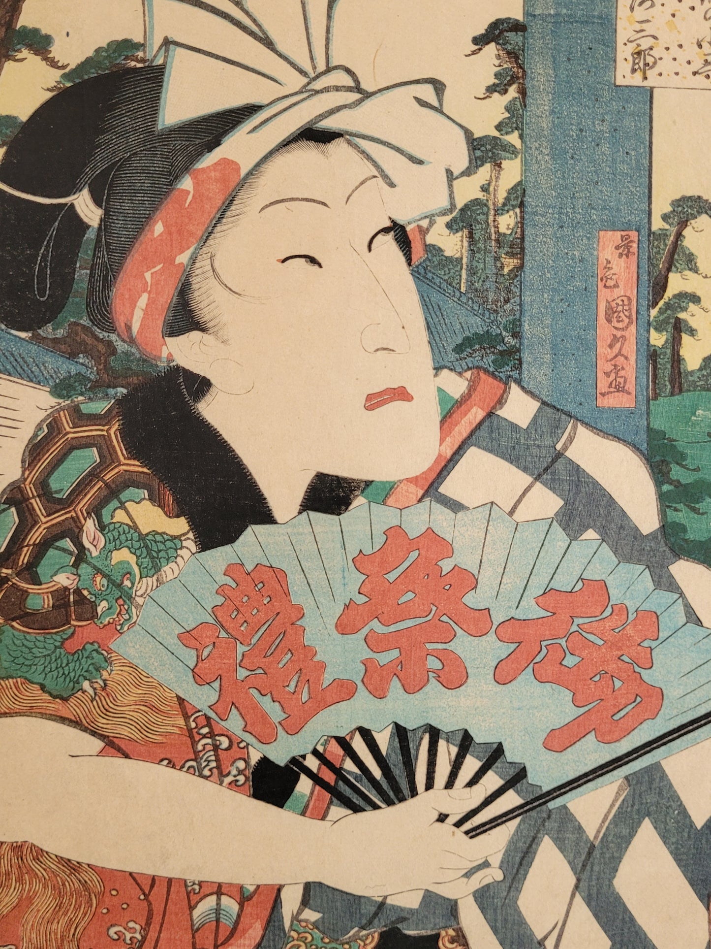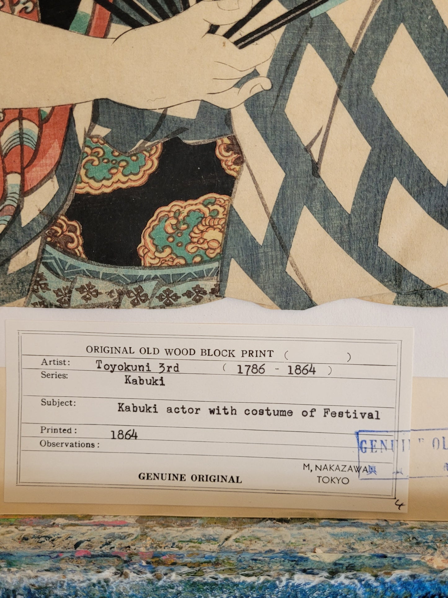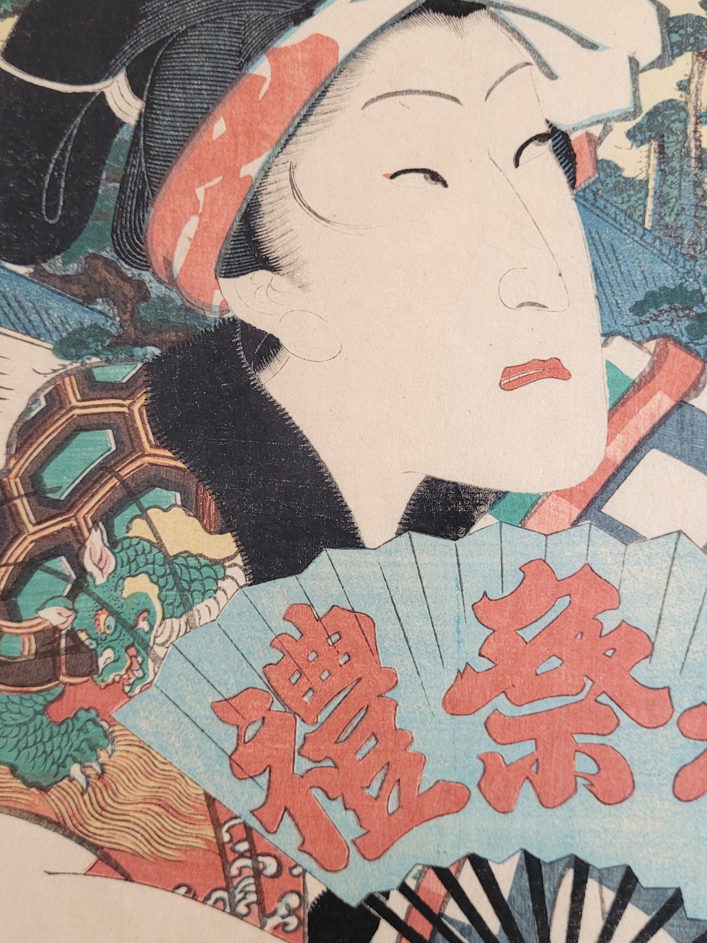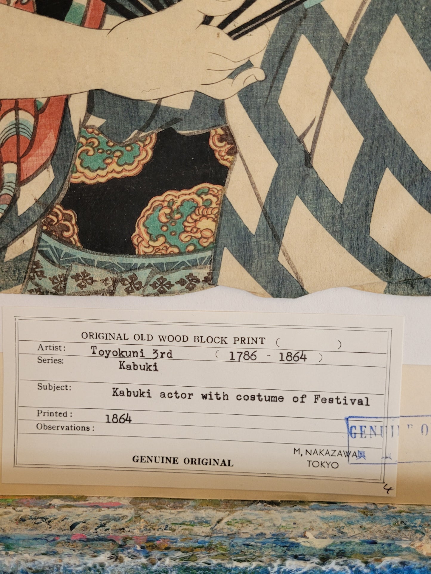 Beschreibung: Willkommen in unserer exklusiven Kollektion von Holzschnitten, geschaffen von Utagawa Toyokuni (1769-1825), einem renommierten Meister des japanischen Holzschnitts, aus der Tabuki Serie von 1864. Diese kunstvollen Werke fangen die traditionelle japanische Kabuki-Theaterkunst in ihrer ganzen Pracht ein und präsentieren einen Schauspieler in einem prächtigen Festivalkostüm.